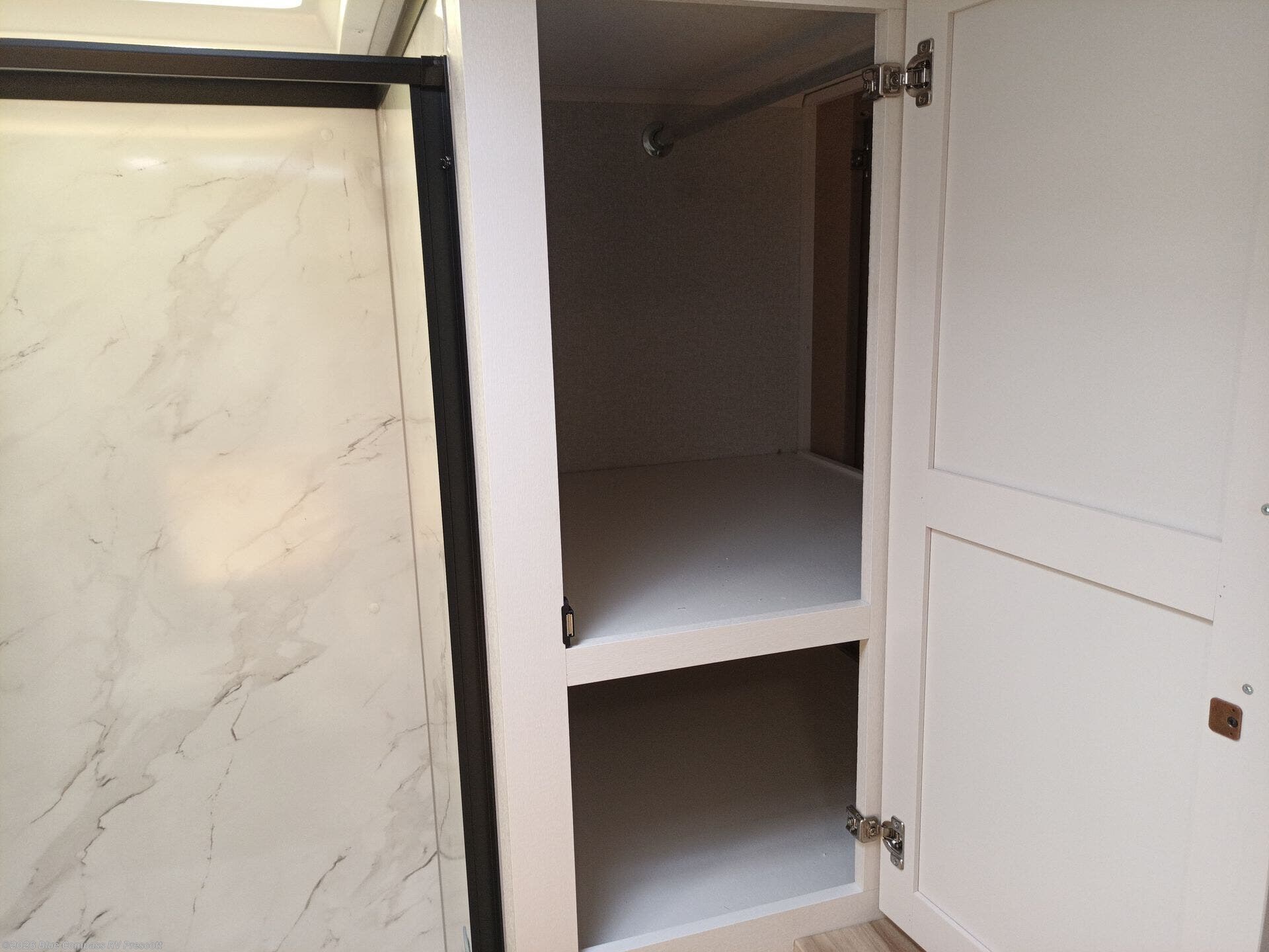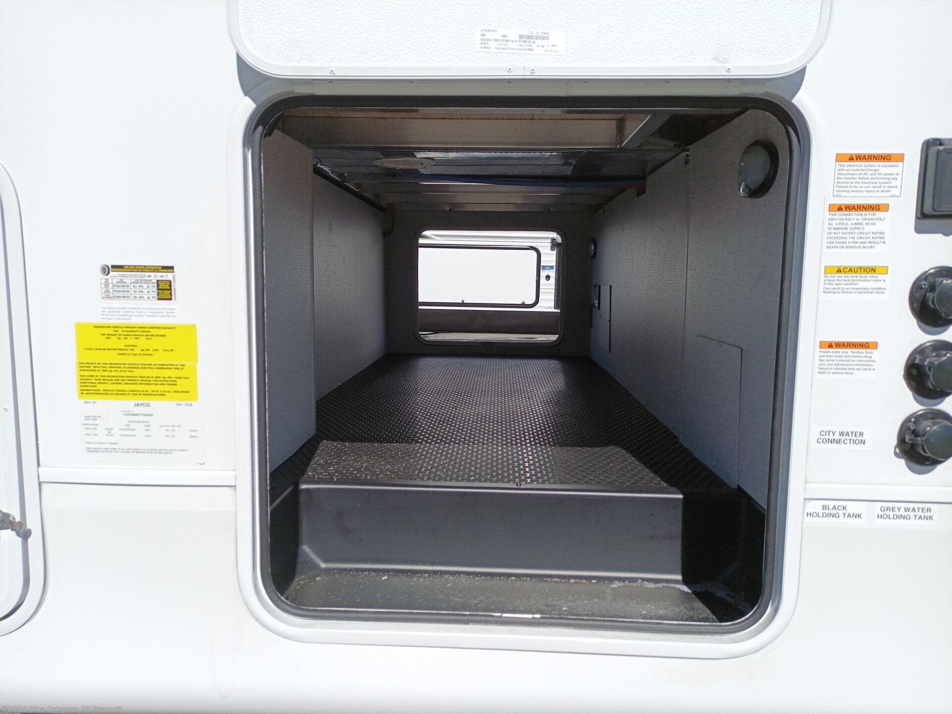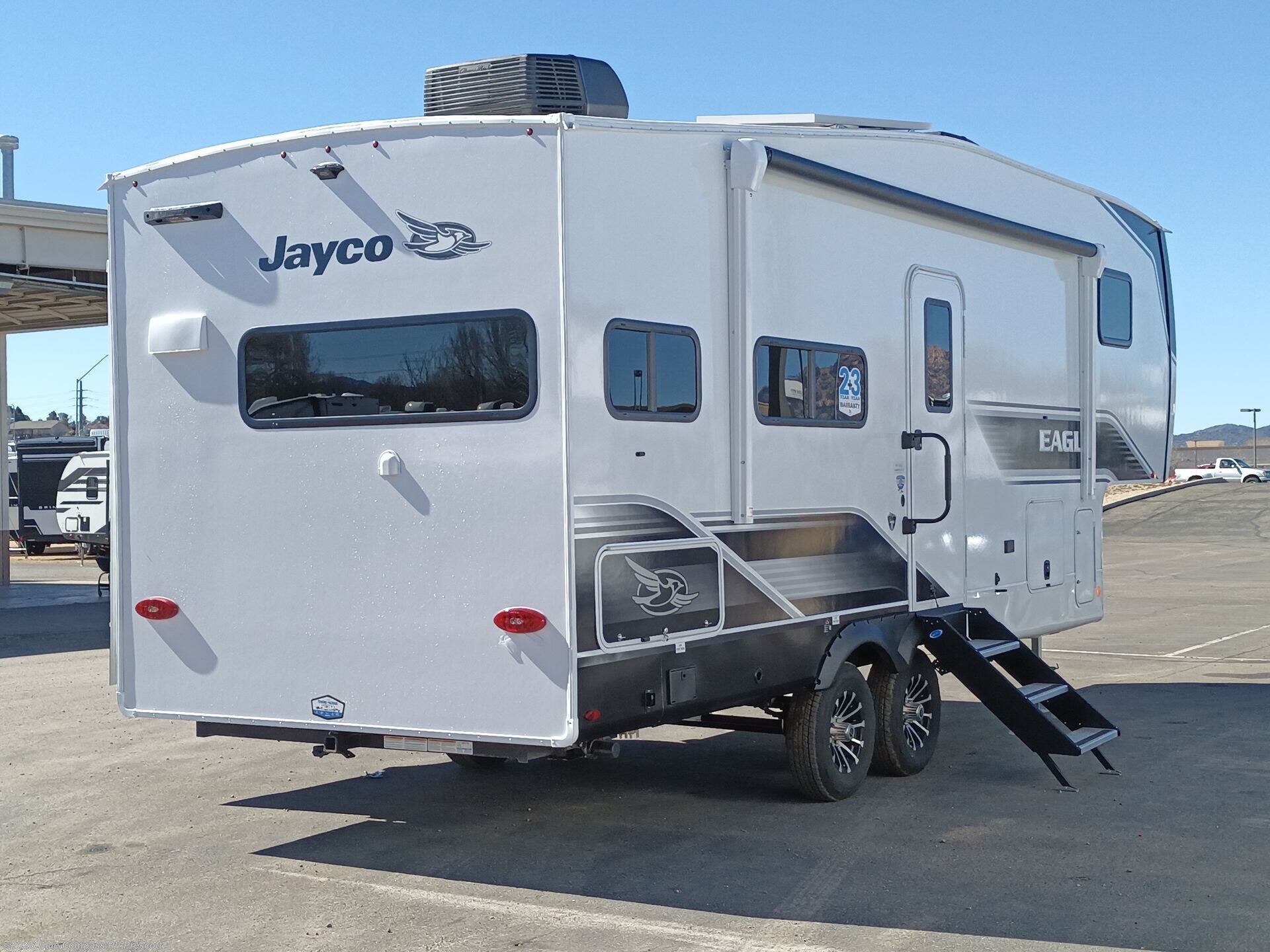 With any Eagle SLE fifth wheel by Jayco, you will enjoy a lighter tow weight, high-end finishes, and the same quality construction you've come to expect from Jayco! There is an Alpha Ply TPO roof membrane, a fully enclosed and heated underbelly, plus Stronghold VBL walls for added durability. There is also a rear 2" towing receiver outside, along with metal slam latch baggage doors, MORryde Step Above entry steps, and a Winegard Air 360 antenna with router prep if you want to stay connected as you camp. Once inside you'll enjoy the handcrafted door/drawer fronts, shower skylight, and residential vinyl flooring throughout with no carpet for an easier clean. The on-demand water heater, 30K BTU furnace, and 15K BTU "Whisper Quiet" A/C will ensure your comfort, and the Overland 1 Solar Package will provide off-grid capabilities!