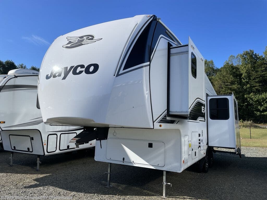 With any Eagle SLE fifth wheel by Jayco, you will enjoy a lighter tow weight, high-end finishes, and the same quality construction you've come to expect from Jayco! There is an Alpha Ply TPO roof membrane, a fully enclosed and heated underbelly, plus Stronghold VBL walls for added durability. There is also a rear 2" towing receiver outside, along with metal slam latch baggage doors, MORryde Step Above entry steps, and a Winegard Air 360 antenna with router prep if you want to stay connected as you camp. Once inside you'll enjoy the handcrafted and glazed door/drawer fronts, blackout pleated shades throughout, and residential vinyl flooring throughout with no carpet for an easier clean. The on-demand water heater, 30K BTU furnace, and 15K BTU "Whisper Quiet" A/C will ensure your comfort year around, and the optional Overland 1 Solar Package can be added if you need off-grid capabilities!