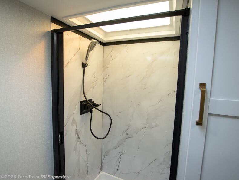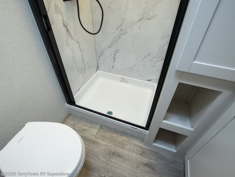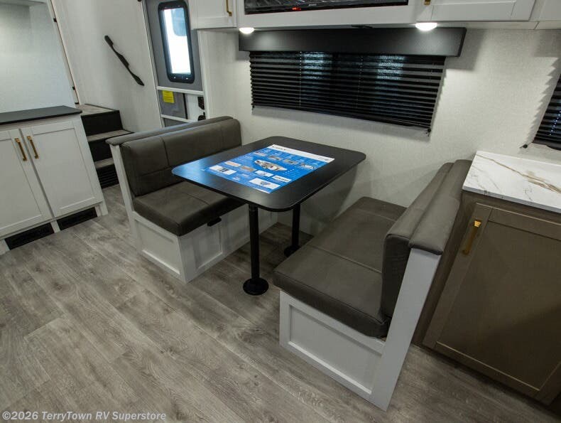 With any Eagle SLE fifth wheel by Jayco, you will enjoy a lighter tow weight, high-end finishes, and the same quality construction you've come to expect from Jayco! There is an Alpha Ply TPO roof membrane, a fully enclosed and heated underbelly, plus Stronghold VBL walls for added durability. There is also a rear 2" towing receiver outside, along with metal slam latch baggage doors, MORryde Step Above entry steps, and a Winegard Air 360 antenna with router prep if you want to stay connected as you camp. Once inside you'll enjoy the handcrafted door/drawer fronts, shower skylight, and residential vinyl flooring throughout with no carpet for an easier clean. The on-demand water heater, 30K BTU furnace, and 15K BTU "Whisper Quiet" A/C will ensure your comfort, and the Overland 1 Solar Package will provide off-grid capabilities!