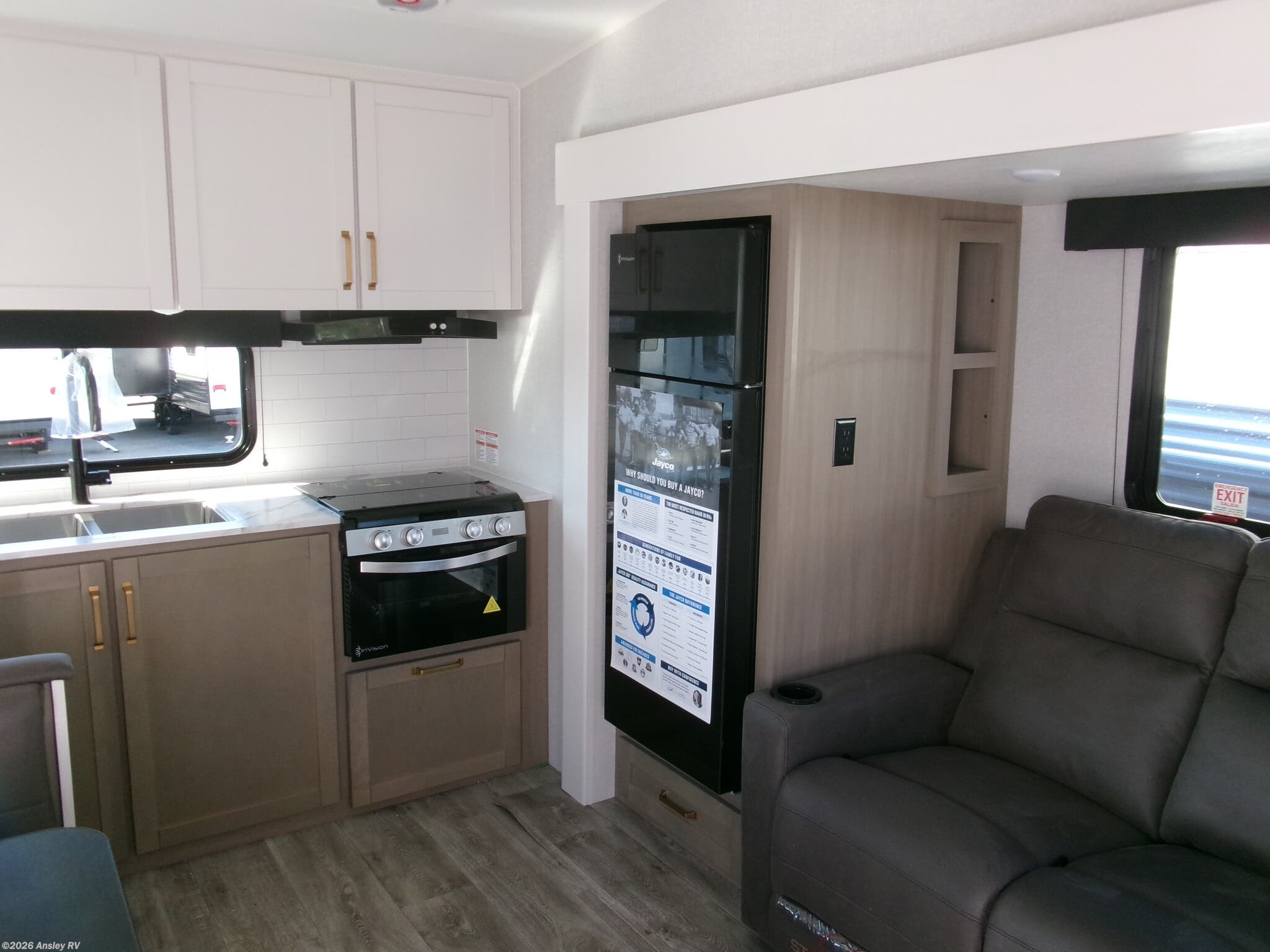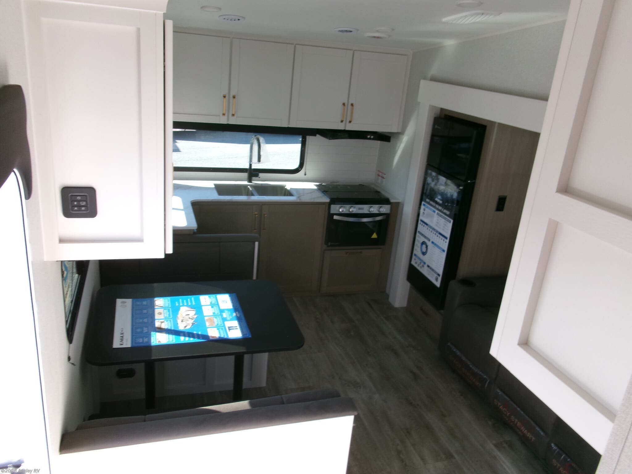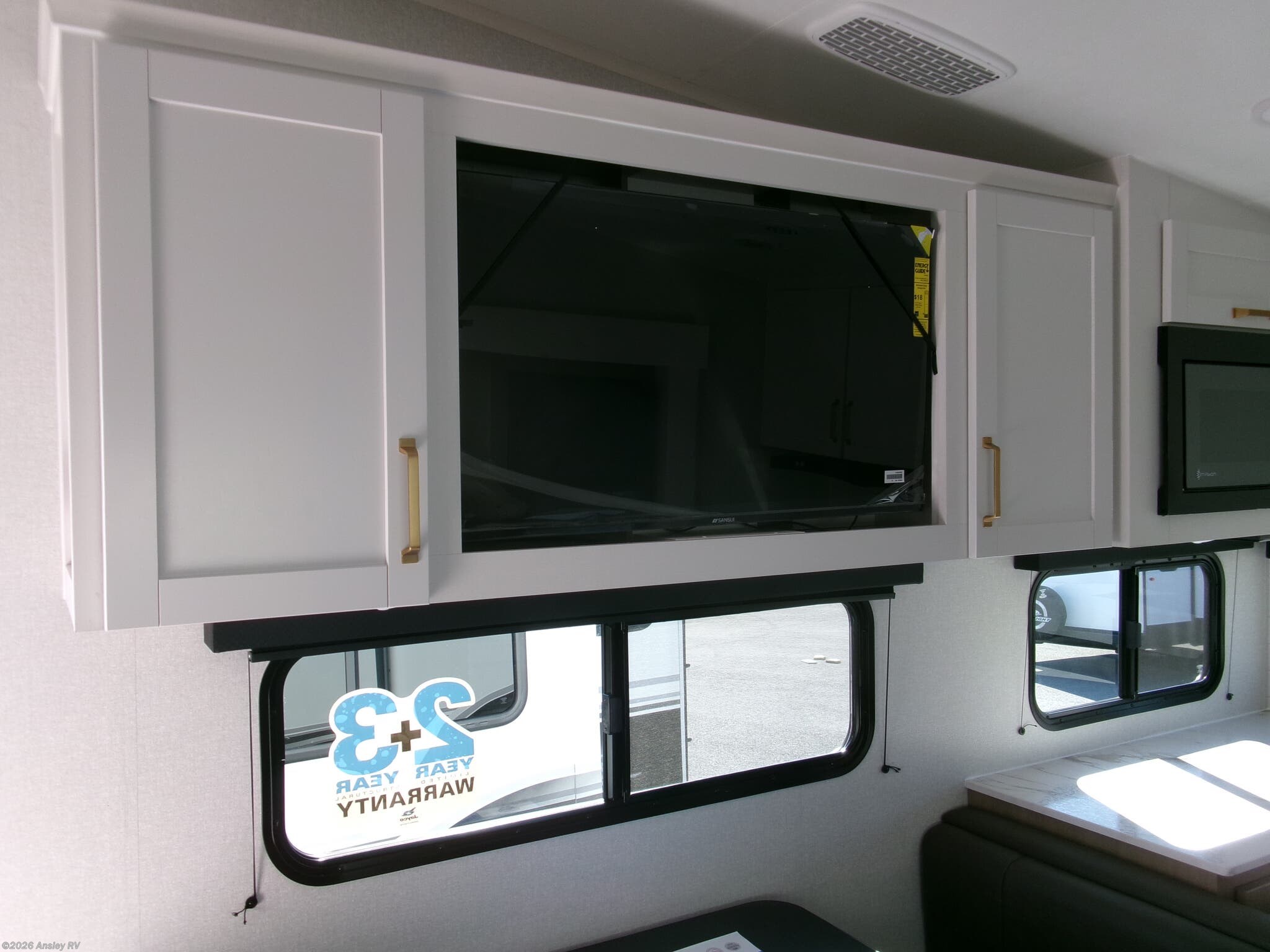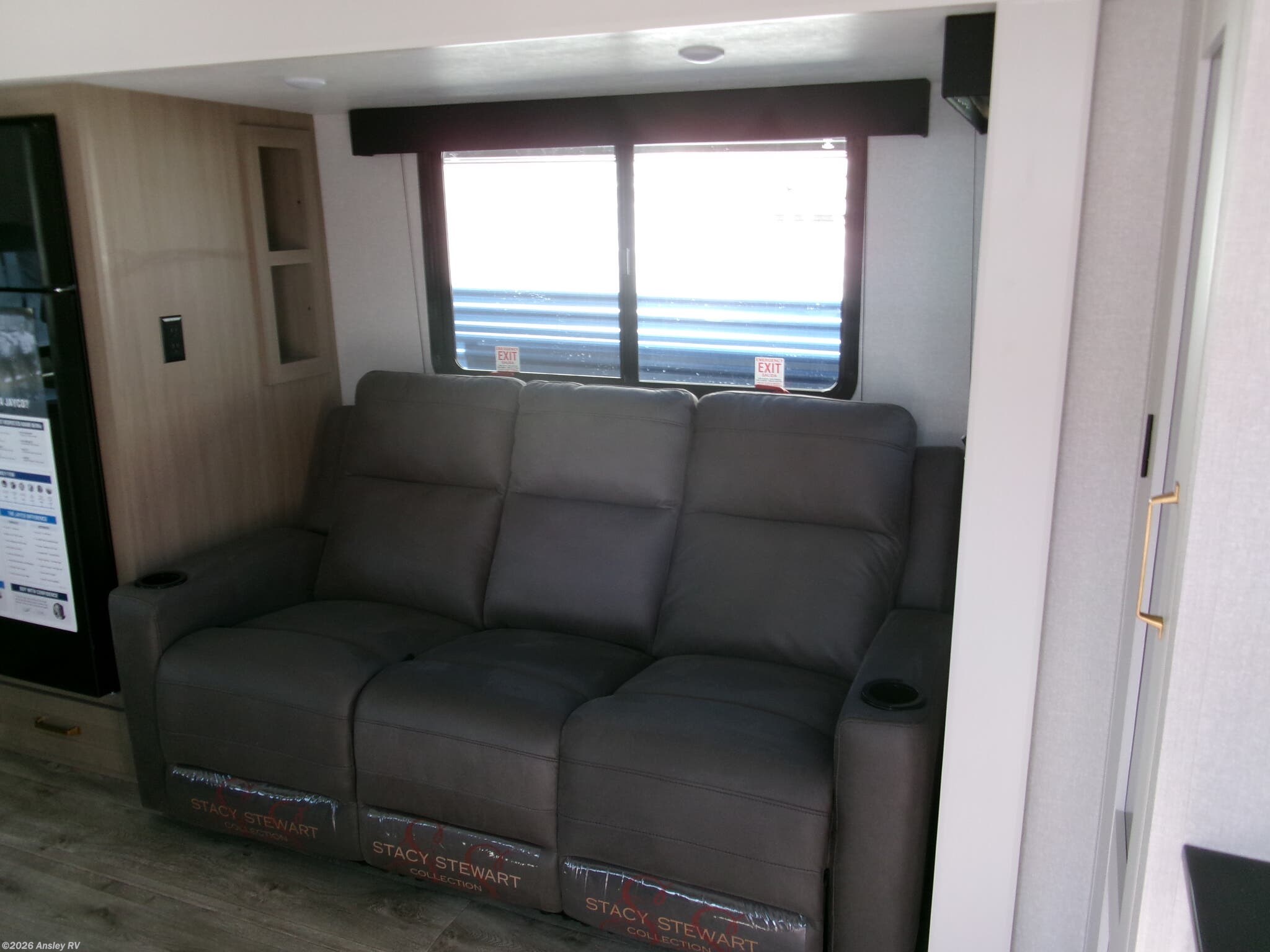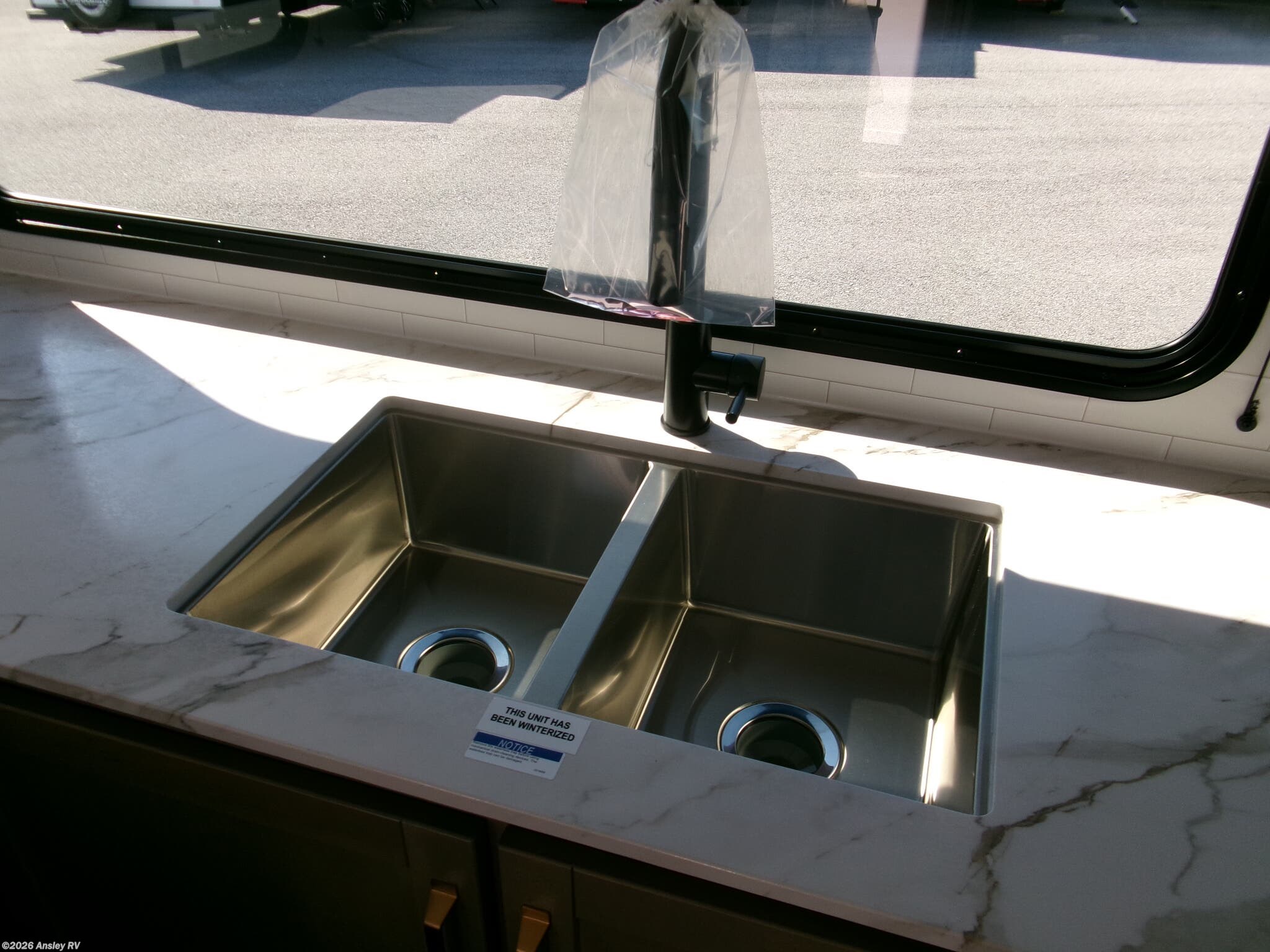 Step inside, and you’ll be greeted by an open-concept living space, complete with residential-style finishes and thoughtful details that elevate your RV experience. The Whisper Quiet 15K BTU A/C system ensures a peaceful retreat, while the HELIX Cooling System™ dual-duct design keeps temperatures steady, even in the summer heat. Relax by the optional LED fireplace with a 5,000 BTU space heater, perfect for cozying up on chilly nights. The deep stainless-steel sink with a pull-out sprayer, spacious countertops, and full-extension 75-lb. drawer guides make meal prep effortless. The tri-fold hide-a-bed sofa with a memory foam sleep surface (select models) ensures every guest sleeps in comfort. With USB-C charging ports, a 40” 4K Ultra LED HD Smart TV, and Bluetooth audio connectivity, your entertainment is always at your fingertips.