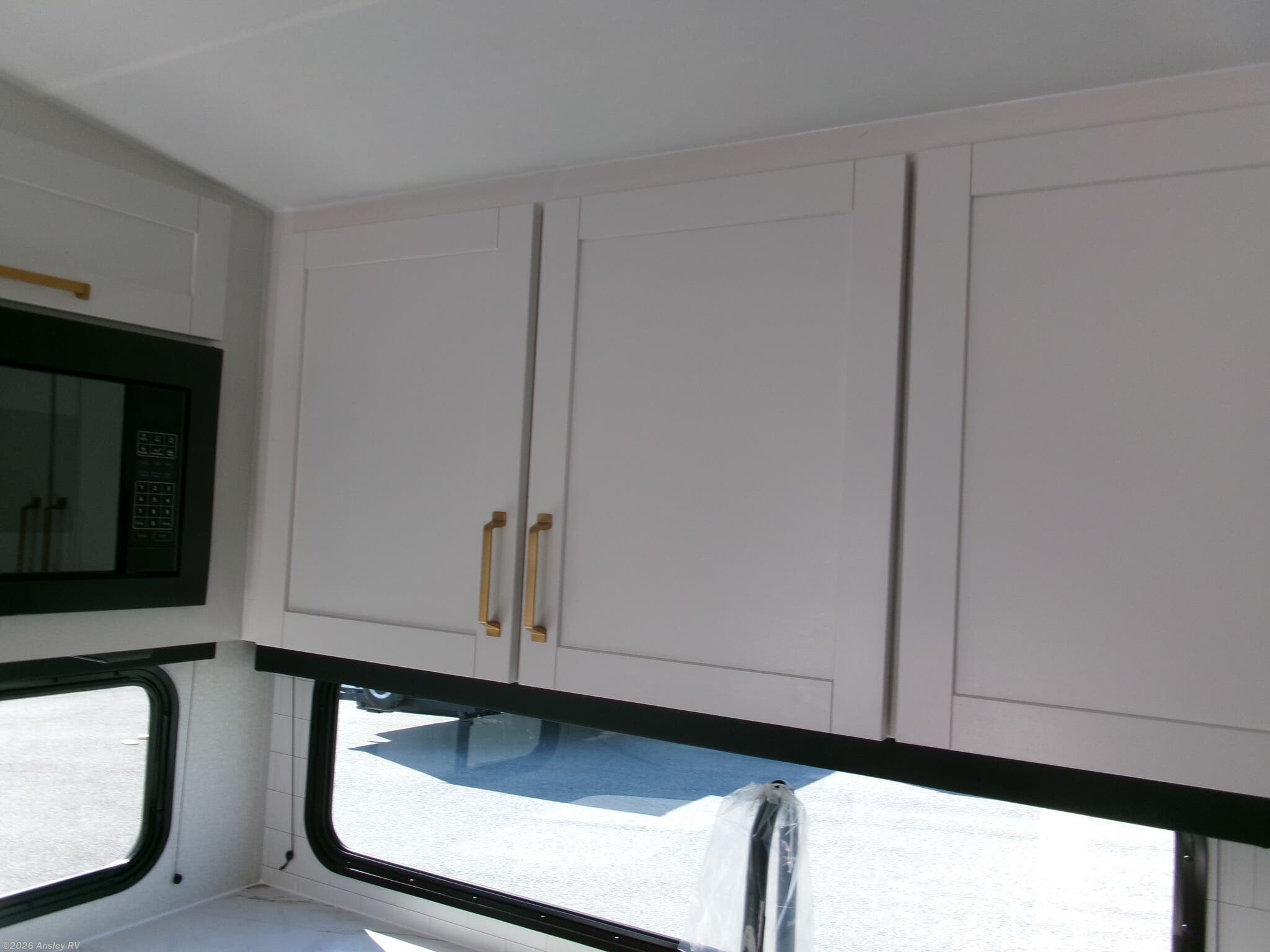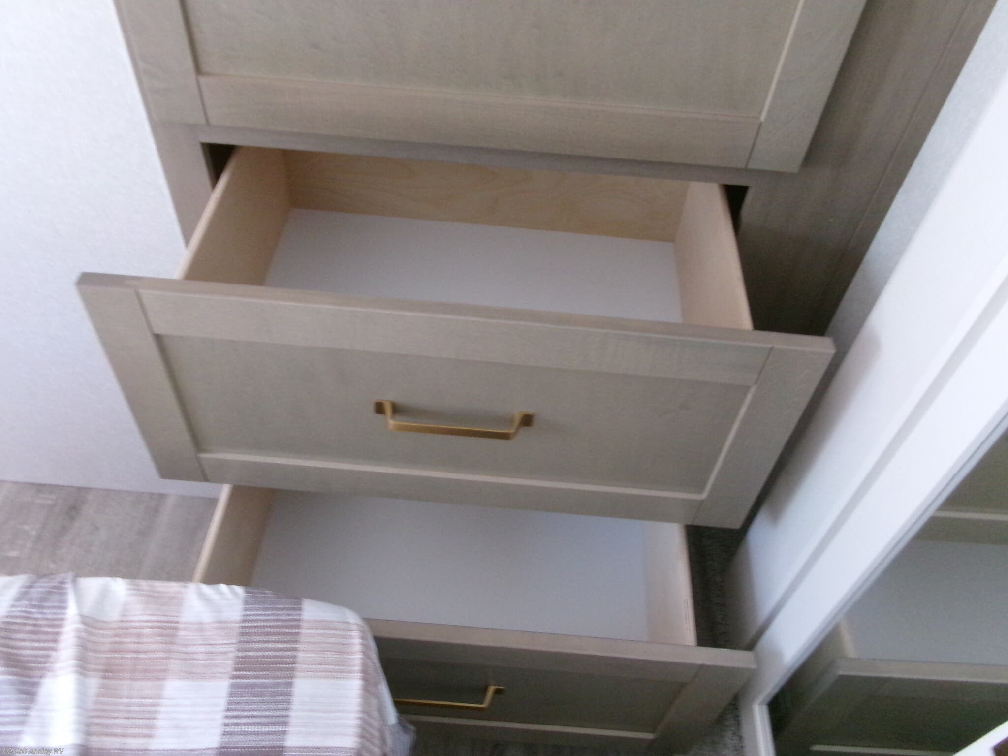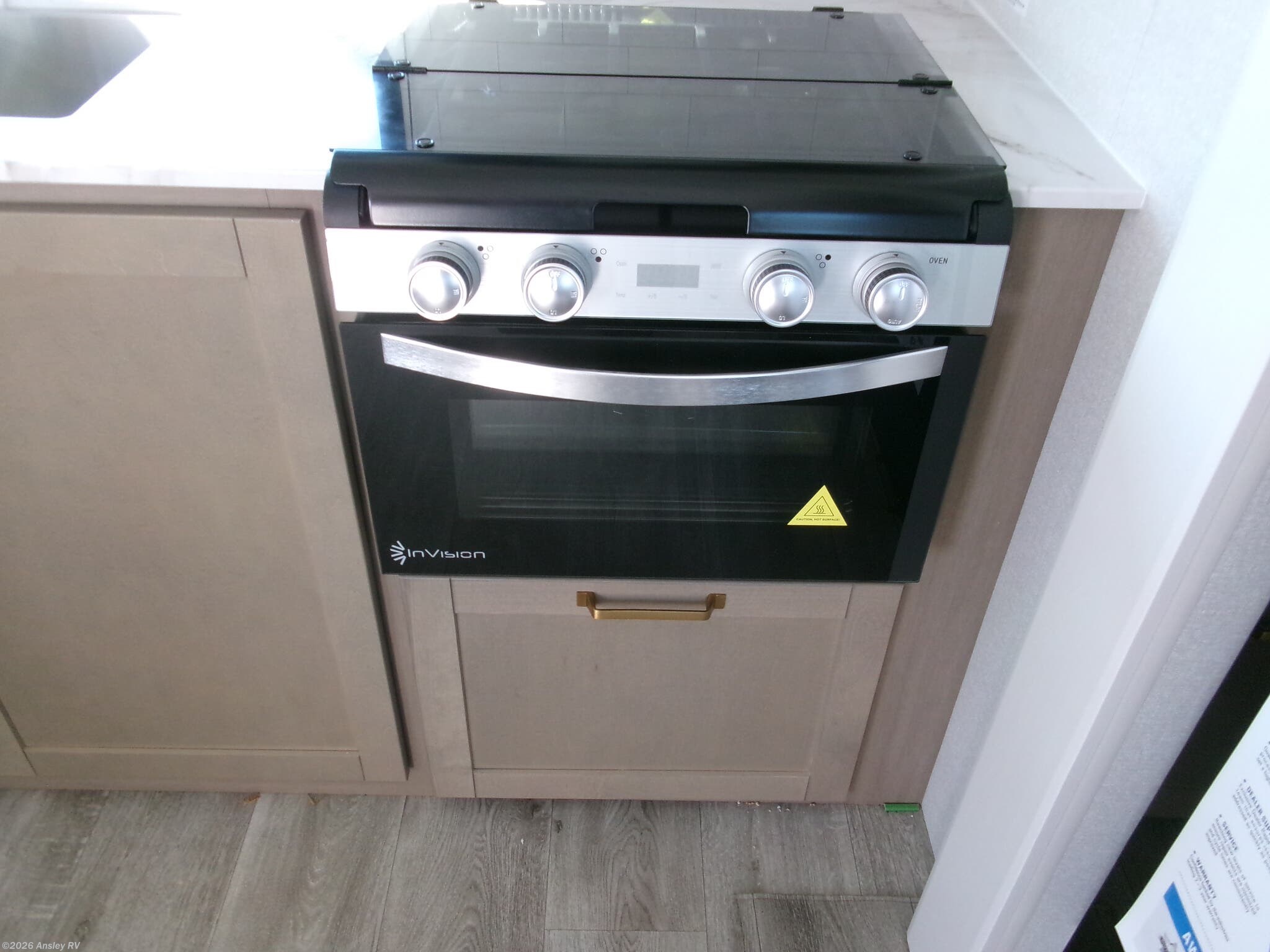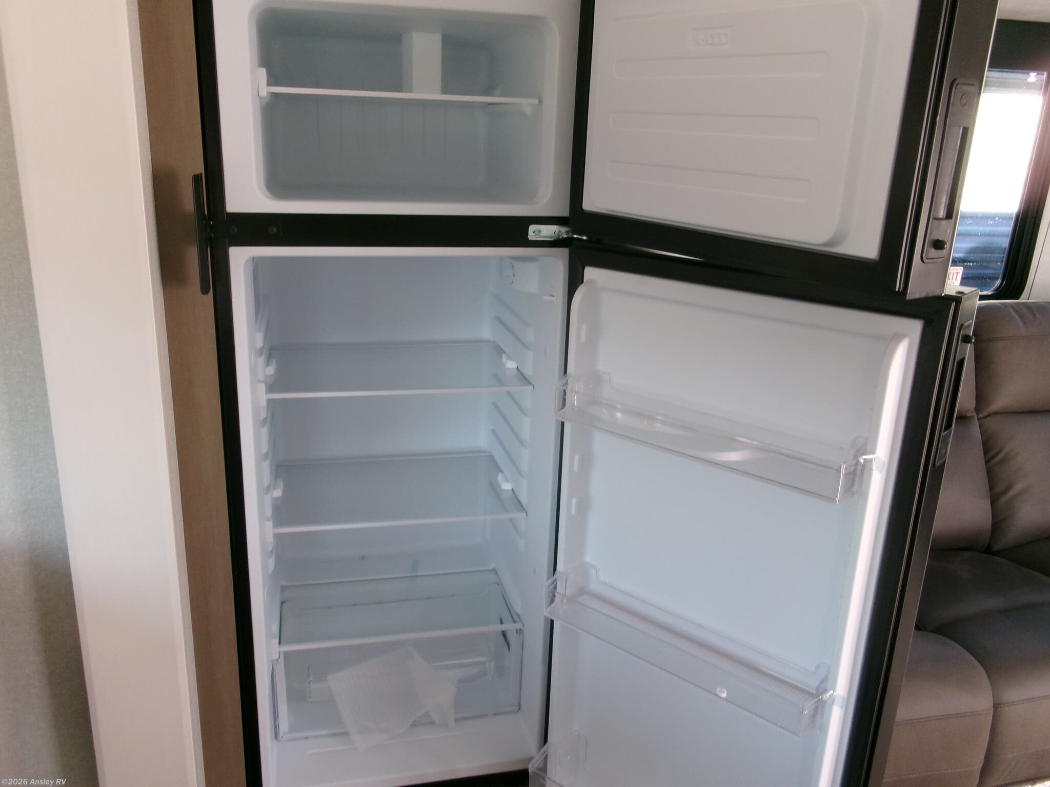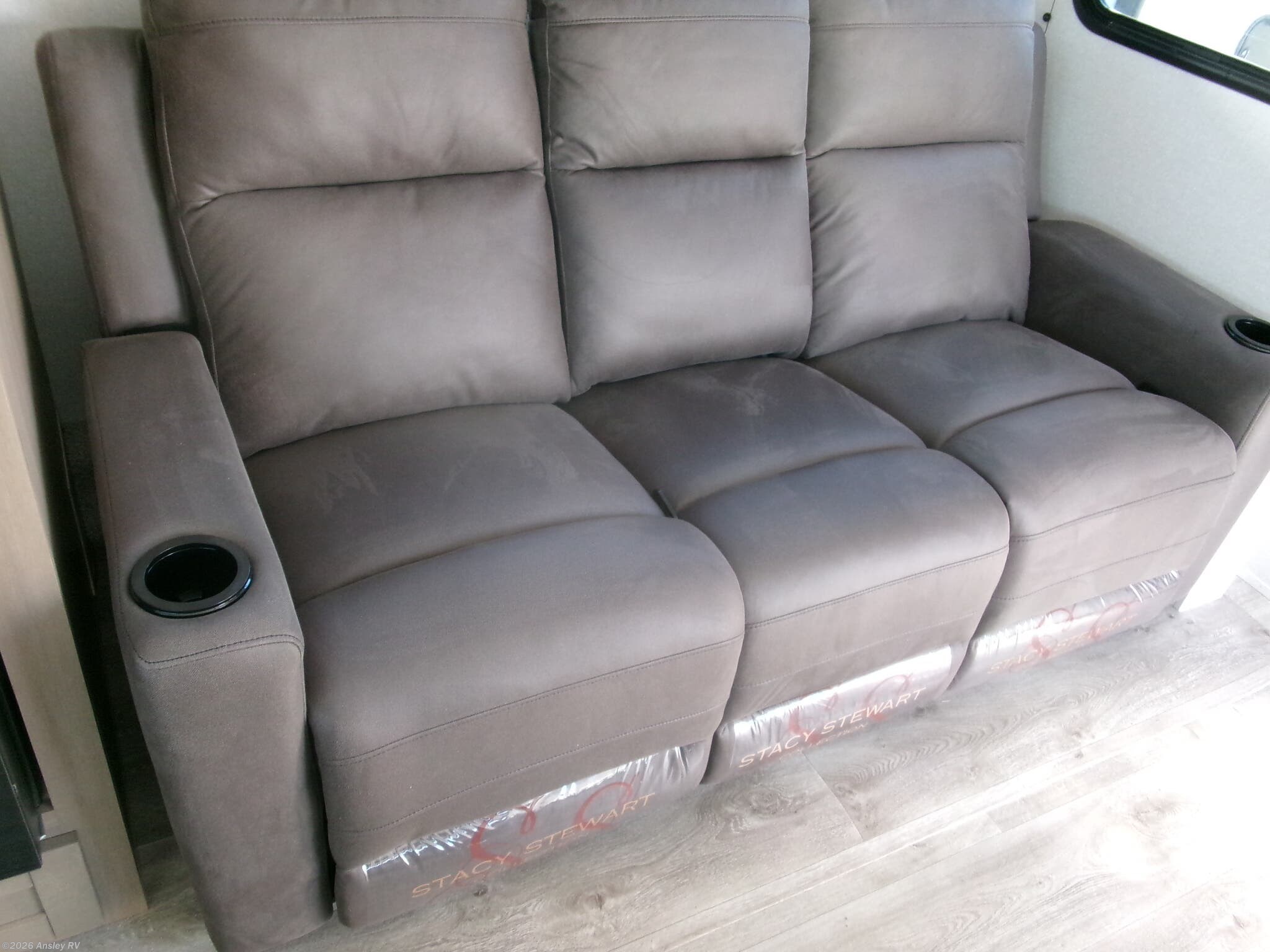 Step inside, and you’ll be greeted by an open-concept living space, complete with residential-style finishes and thoughtful details that elevate your RV experience. The Whisper Quiet 15K BTU A/C system ensures a peaceful retreat, while the HELIX Cooling System™ dual-duct design keeps temperatures steady, even in the summer heat. Relax by the optional LED fireplace with a 5,000 BTU space heater, perfect for cozying up on chilly nights. The deep stainless-steel sink with a pull-out sprayer, spacious countertops, and full-extension 75-lb. drawer guides make meal prep effortless. The tri-fold hide-a-bed sofa with a memory foam sleep surface (select models) ensures every guest sleeps in comfort. With USB-C charging ports, a 40” 4K Ultra LED HD Smart TV, and Bluetooth audio connectivity, your entertainment is always at your fingertips.