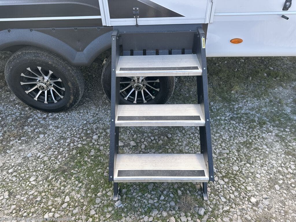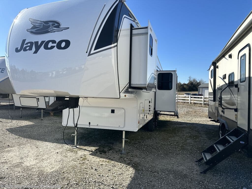 With any Eagle SLE fifth wheel by Jayco, you will enjoy a lighter tow weight, high-end finishes, and the same quality construction you've come to expect from Jayco! There is an Alpha Ply TPO roof membrane, a fully enclosed and heated underbelly, plus Stronghold VBL walls for added durability. There is also a rear 2" towing receiver outside, along with metal slam latch baggage doors, MORryde Step Above entry steps, and a Winegard Air 360 antenna with router prep if you want to stay connected as you camp. Once inside you'll enjoy the handcrafted door/drawer fronts, shower skylight, and residential vinyl flooring throughout with no carpet for an easier clean. The on-demand water heater, 30K BTU furnace, and 15K BTU "Whisper Quiet" A/C will ensure your comfort, and the Overland 1 Solar Package will provide off-grid capabilities!