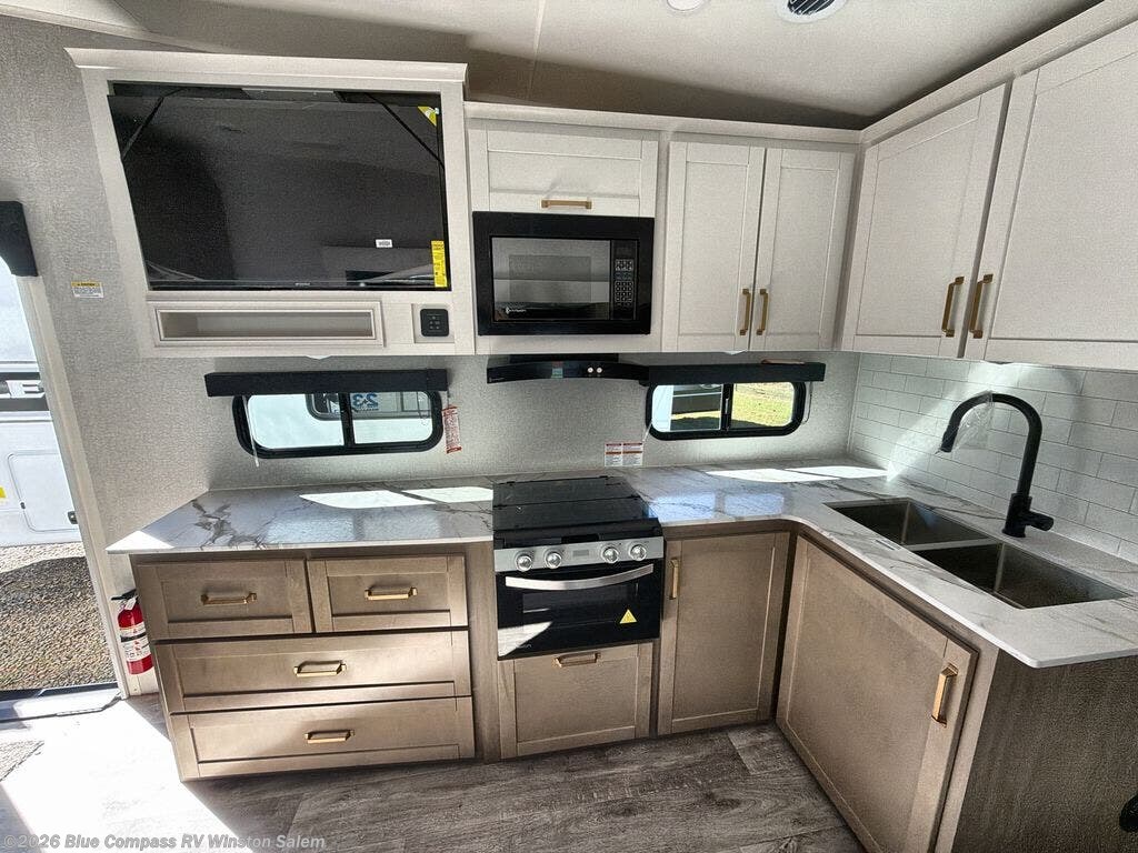 With any Eagle SLE fifth wheel by Jayco, you will enjoy a lighter tow weight, high-end finishes, and the same quality construction you've come to expect from Jayco! There is an Alpha Ply TPO roof membrane, a fully enclosed and heated underbelly, plus Stronghold VBL walls for added durability. There is also a rear 2" towing receiver outside, along with metal slam latch baggage doors, MORryde Step Above entry steps, and a Winegard Air 360 antenna with router prep if you want to stay connected as you camp. Once inside you'll enjoy the handcrafted and glazed door/drawer fronts, blackout pleated shades throughout, and residential vinyl flooring throughout with no carpet for an easier clean. The on-demand water heater, 30K BTU furnace, and 15K BTU "Whisper Quiet" A/C will ensure your comfort year around, and the optional Overland 1 Solar Package can be added if you need off-grid capabilities!