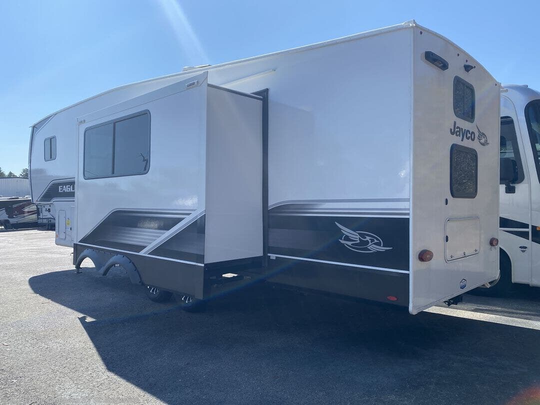 With any Eagle SLE fifth wheel by Jayco, you will enjoy a lighter tow weight, high-end finishes, and the same quality construction you've come to expect from Jayco! There is an Alpha Ply TPO roof membrane, a fully enclosed and heated underbelly, plus Stronghold VBL walls for added durability. There is also a rear 2" towing receiver outside, along with metal slam latch baggage doors, MORryde Step Above entry steps, and a Winegard Air 360 antenna with router prep if you want to stay connected as you camp. Once inside you'll enjoy the handcrafted door/drawer fronts, shower skylight, and residential vinyl flooring throughout with no carpet for an easier clean. The on-demand water heater, 30K BTU furnace, and 15K BTU "Whisper Quiet" A/C will ensure your comfort, and the Overland 1 Solar Package will provide off-grid capabilities!