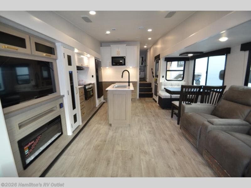 You can't go wrong when camping in this spacious fifth wheel! There are dual opposing slides in the living room, giving your crew plenty of space to prep dinner on the kitchen island, relax on the theater sofa, or dine at the booth dinette. There is also a rear tri-fold sofa where your guests can sleep! An entertainment center with a fireplace will make this space feel even more like home, and there is plenty of storage spaces to all your belongings tidy. The full bath towards the front will let you freshen up each day, and the front private bedroom with a queen bed us sure to bring comfort. There are also dual nightstands, overhead cabinets, plus a wardrobe and dresser slide out, so everything has a place!