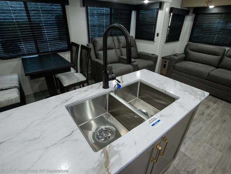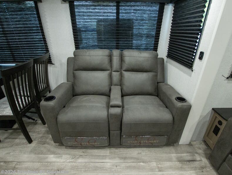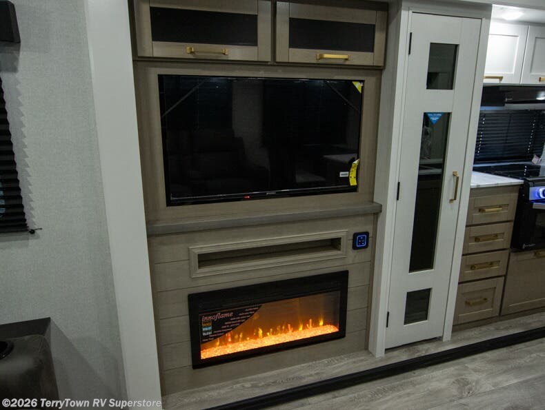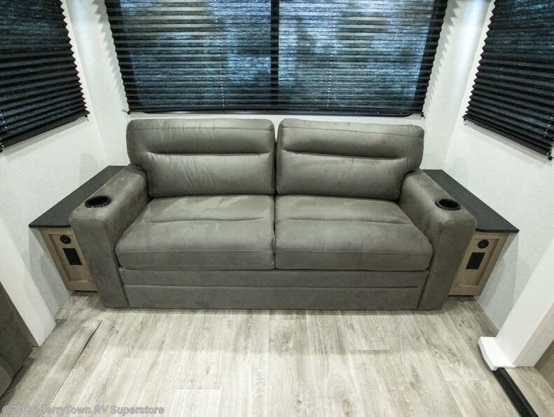 You can't go wrong when camping in this spacious fifth wheel! There are dual opposing slides in the living room, giving your crew plenty of space to prep dinner on the kitchen island, relax on the theater sofa, or dine at the booth dinette. There is also a rear tri-fold sofa where your guests can sleep! An entertainment center with a fireplace will make this space feel even more like home, and there are plenty of storage spaces for all your belongings. The full bath towards the front will let you freshen up each day, and the front private bedroom with a queen bed is sure to bring comfort. There are also dual nightstands, overhead cabinets, plus a wardrobe and dresser slide out, so everything has a place!