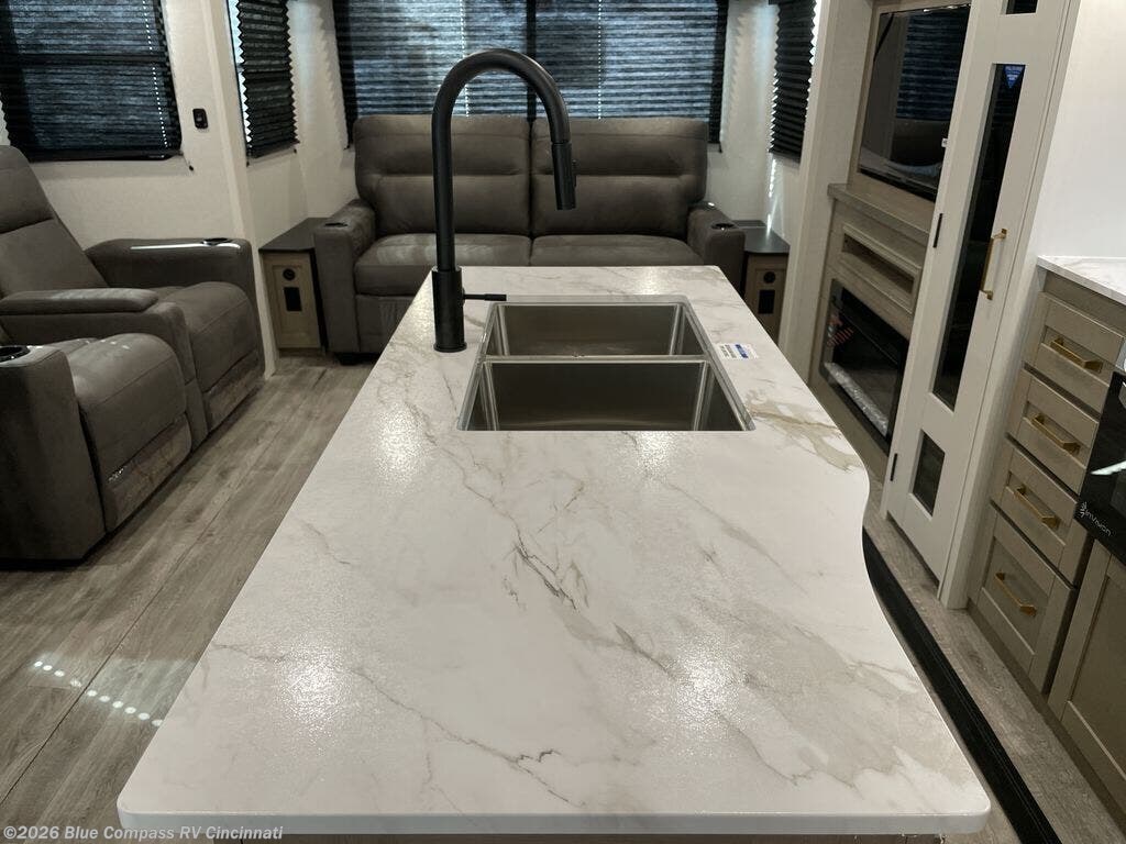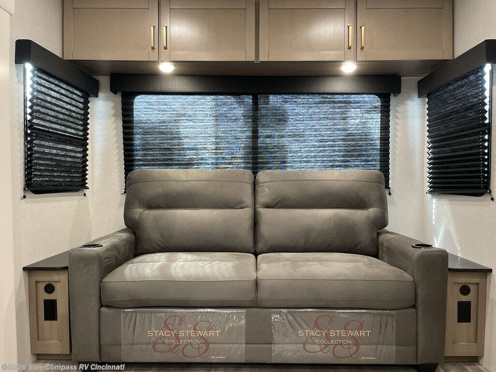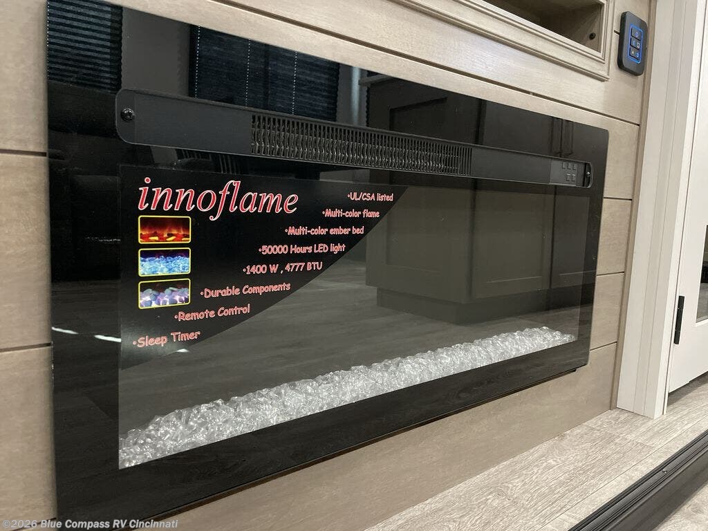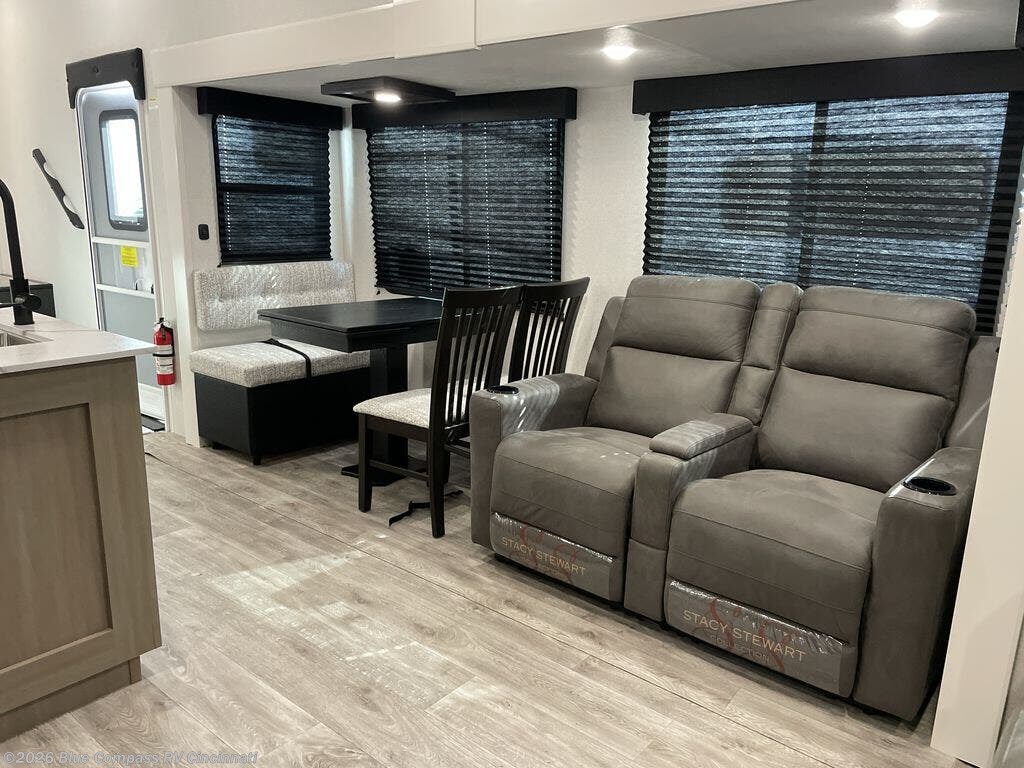 You can't go wrong when camping in this spacious fifth wheel! There are dual opposing slides in the living room, giving your crew plenty of space to prep dinner on the kitchen island, relax on the theater sofa, or dine at the booth dinette. There is also a rear tri-fold sofa where your guests can sleep! An entertainment center with a fireplace will make this space feel even more like home, and there are plenty of storage spaces for all your belongings. The full bath towards the front will let you freshen up each day, and the front private bedroom with a queen bed is sure to bring comfort. There are also dual nightstands, overhead cabinets, plus a wardrobe and dresser slide out, so everything has a place!