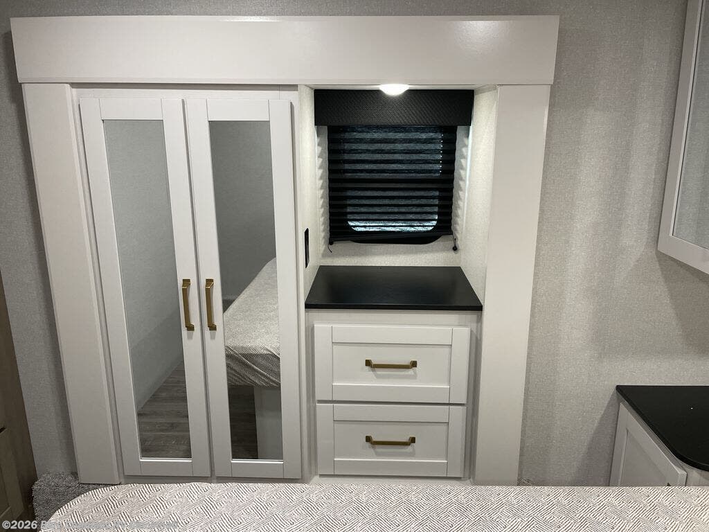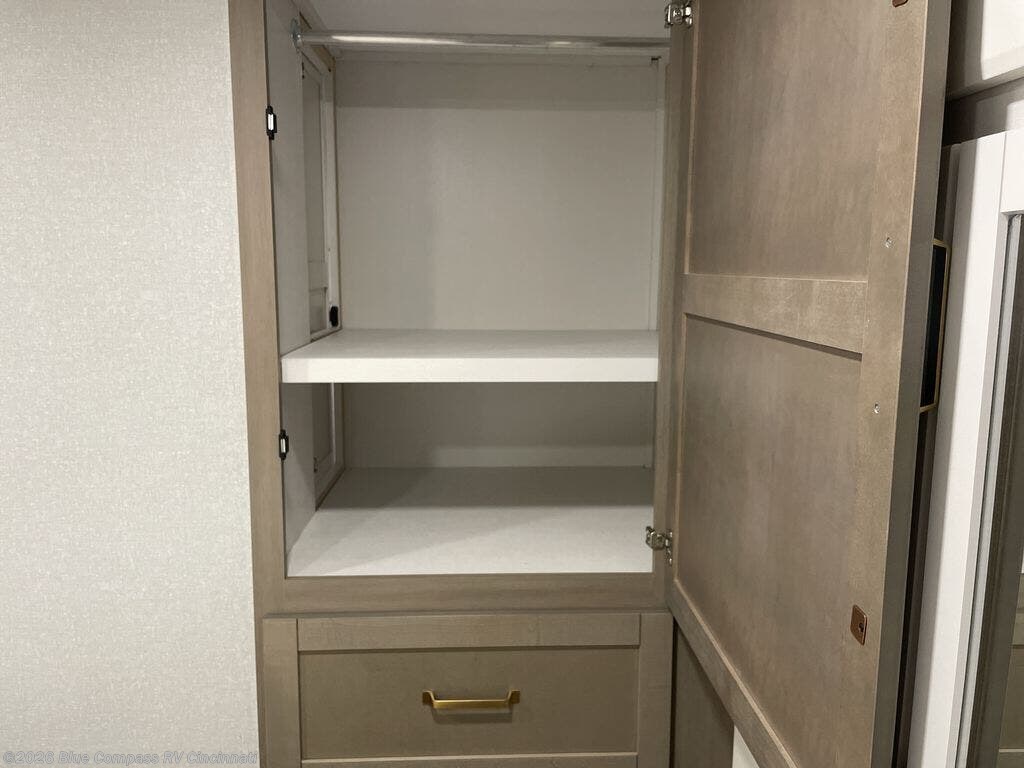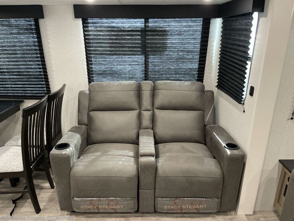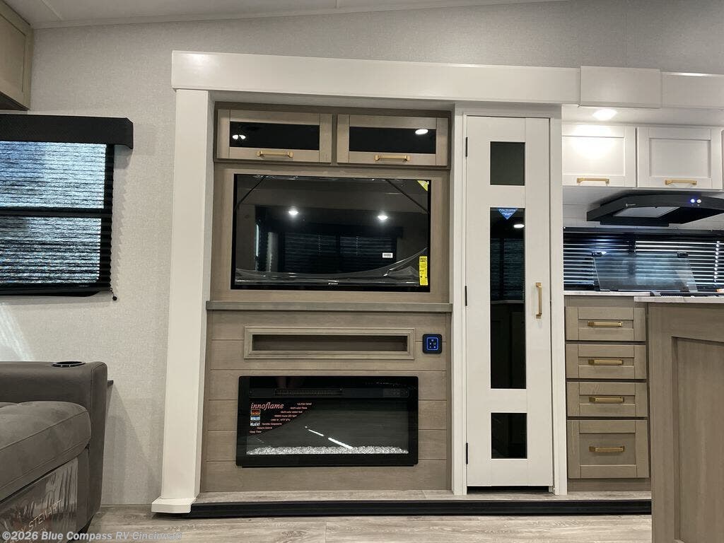 You can't go wrong when camping in this spacious fifth wheel! There are dual opposing slides in the living room, giving your crew plenty of space to prep dinner on the kitchen island, relax on the theater sofa, or dine at the booth dinette. There is also a rear tri-fold sofa where your guests can sleep! An entertainment center with a fireplace will make this space feel even more like home, and there are plenty of storage spaces for all your belongings. The full bath towards the front will let you freshen up each day, and the front private bedroom with a queen bed is sure to bring comfort. There are also dual nightstands, overhead cabinets, plus a wardrobe and dresser slide out, so everything has a place!