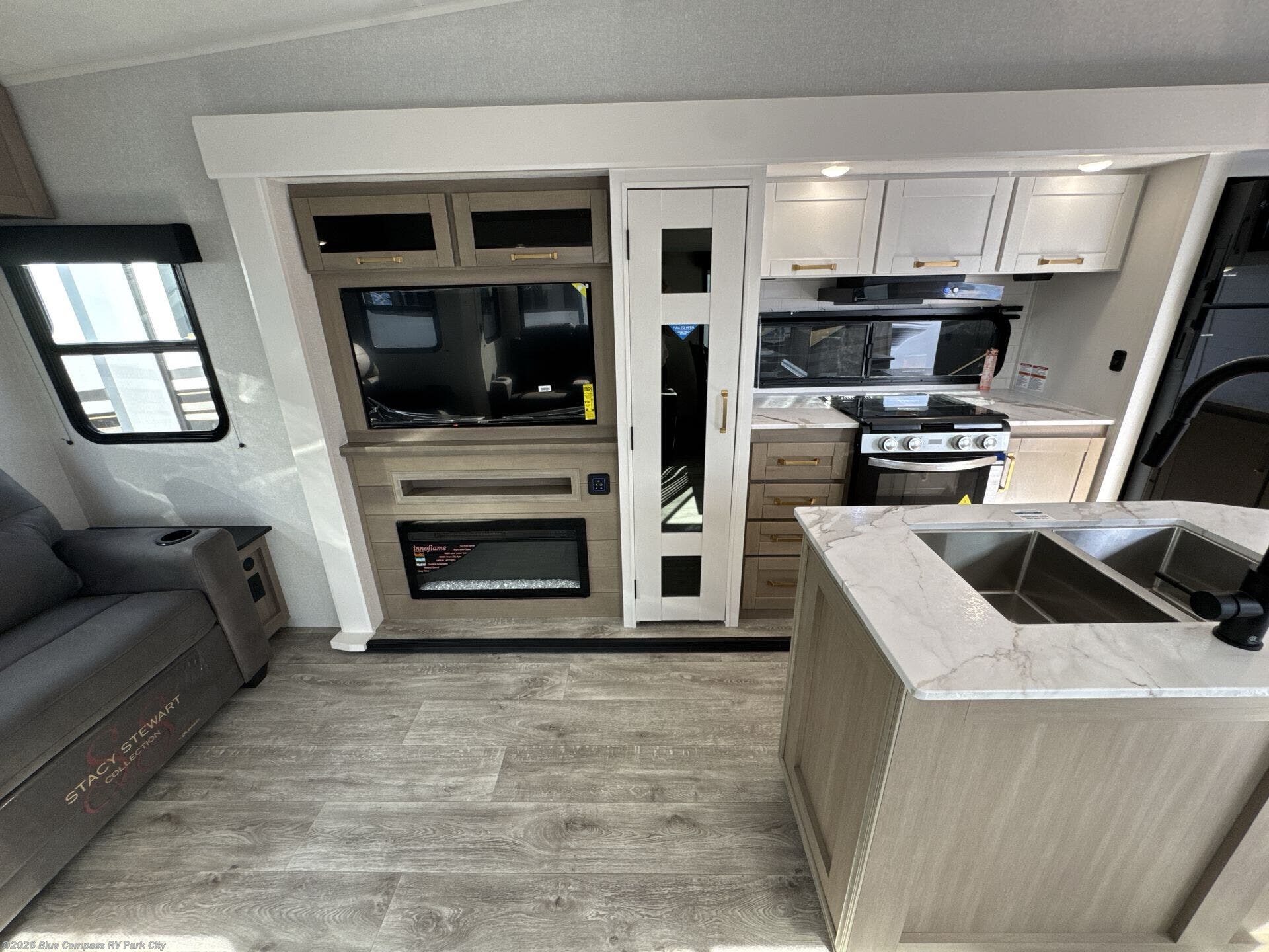 You can't go wrong when camping in this spacious fifth wheel! There are dual opposing slides in the living room, giving your crew plenty of space to prep dinner on the kitchen island, relax on the theater sofa, or dine at the booth dinette. There is also a rear tri-fold sofa where your guests can sleep! An entertainment center with a fireplace will make this space feel even more like home, and there are plenty of storage spaces for all your belongings. The full bath towards the front will let you freshen up each day, and the front private bedroom with a queen bed is sure to bring comfort. There are also dual nightstands, overhead cabinets, plus a wardrobe and dresser slide out, so everything has a place!