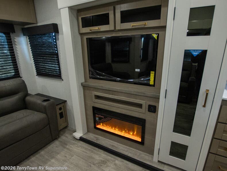 You can't go wrong when camping in this spacious fifth wheel! There are dual opposing slides in the living room, giving your crew plenty of space to prep dinner on the kitchen island, relax on the theater sofa, or dine at the booth dinette. There is also a rear tri-fold sofa where your guests can sleep! An entertainment center with a fireplace will make this space feel even more like home, and there are plenty of storage spaces for all your belongings. The full bath towards the front will let you freshen up each day, and the front private bedroom with a queen bed is sure to bring comfort. There are also dual nightstands, overhead cabinets, plus a wardrobe and dresser slide out, so everything has a place!