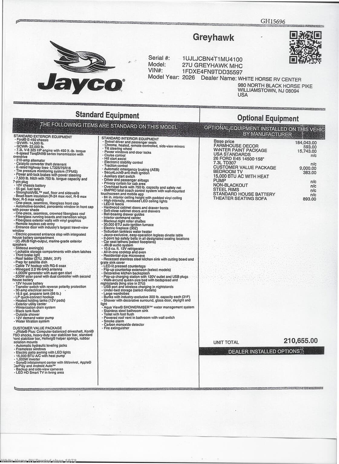 This Stock #GH15696 also has the following factory options included: Farmhouse Decor, Winter Paint Package , Bedroom TV, & Theater Seating Sofa ... all backed by Jayco’s 2+3-year warranty! MSRP $210,655.00.