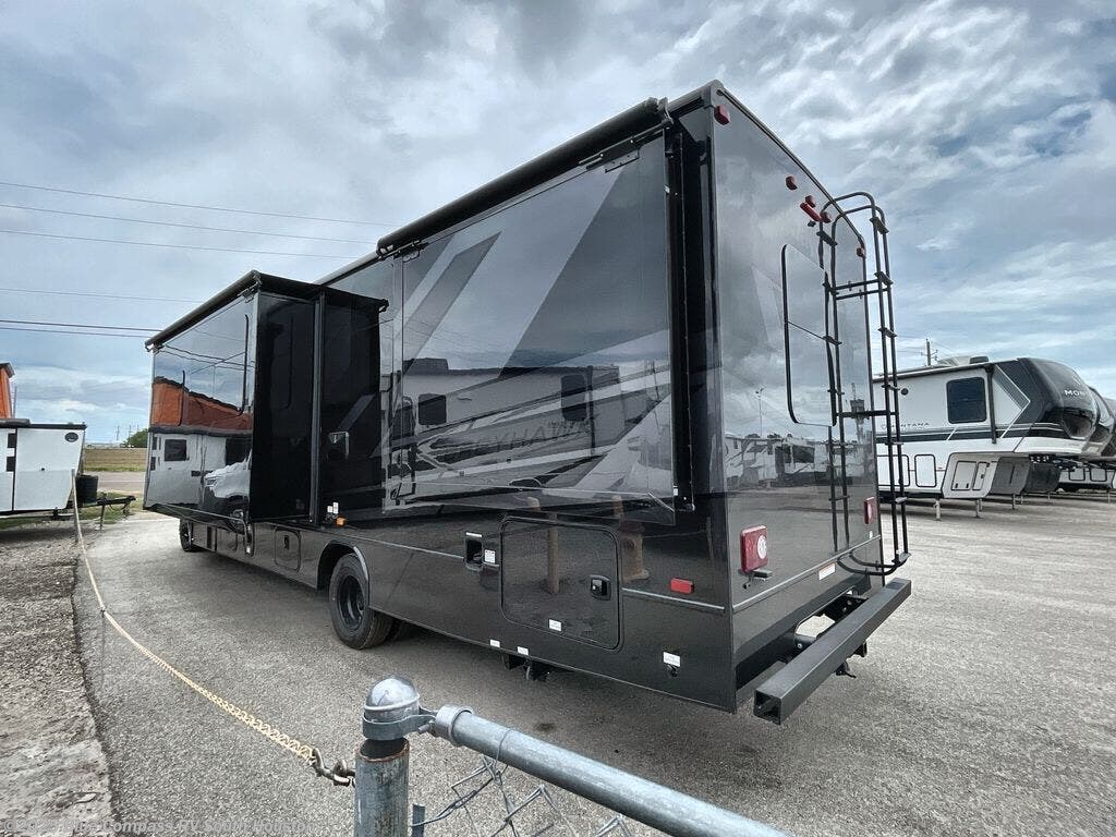 This motorhome includes double slides so you can enjoy more interior space, just like at home! The 42" x 70" booth dinette and 60" tri-fold sofa are in great view of the LED HD Smart TV, and your guests can sleep here, as well as on the cab-over bunk. This Greyhawk kitchen includes a Furrion all-in-one cooktop and oven, a residential-size microwave, and a pantry to store dry goods. You will find a convenient 30" x 36" shower, with the private toilet and sink across the hall so two people can freshen up at once. And don't overlook the rear bedroom with its queen bed slide out, dual bedroom wardrobes, and cabinet!