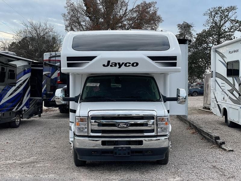 With any Greyhawk Class C gas motorhome by Jayco you will experience smooth sailing thanks to the JRIDE PLUS that comes with Koni shock absorbers, a computer-balanced driveshaft, Hellwig helper springs, and more. The Ford E-450 chassis with a 7.3L V8 325 HP engine will power your excursions, and you'll appreciate the added safety features for your peace of mind. Each model features a Sony infotainment center with Apple CarPlay and Android Auto, backup and side-view cameras, and a tire pressure monitor system the driver is sure to appreciate. Durable construction begins with Stronghold VBL roof, floor and sidewalls, bead-foam insulation, and a one-piece seamless fiberglass front cap. Head inside to find blackout night roller shades, LED-lit pressed countertops, an 84" interior ceiling height, and hardwood cabinet doors and drawers.