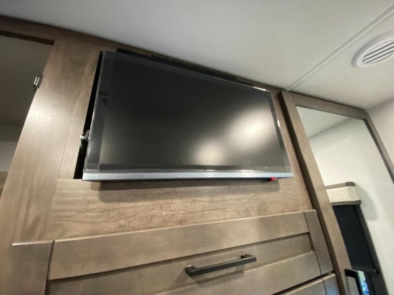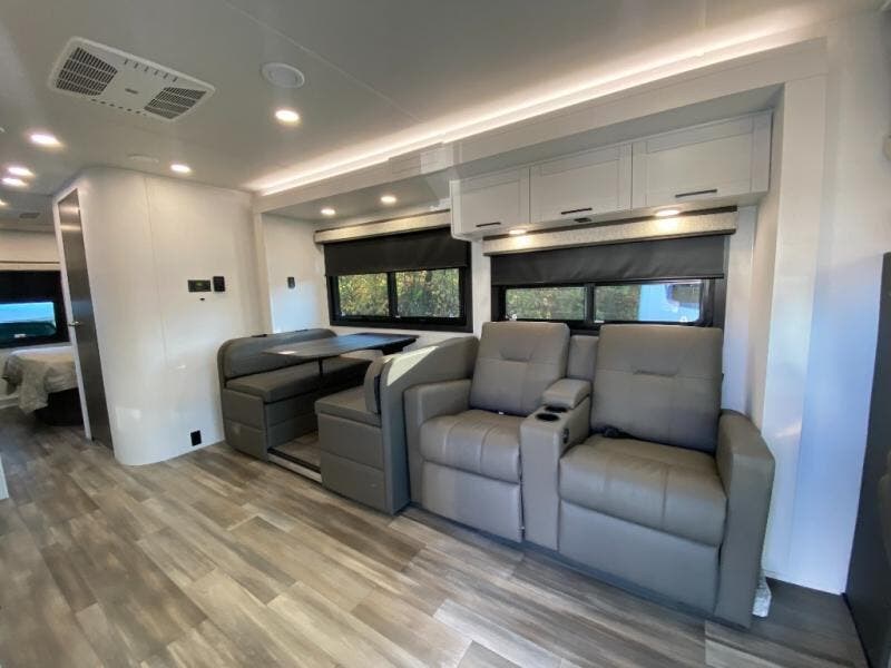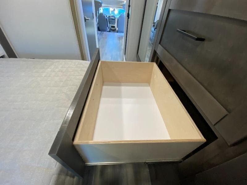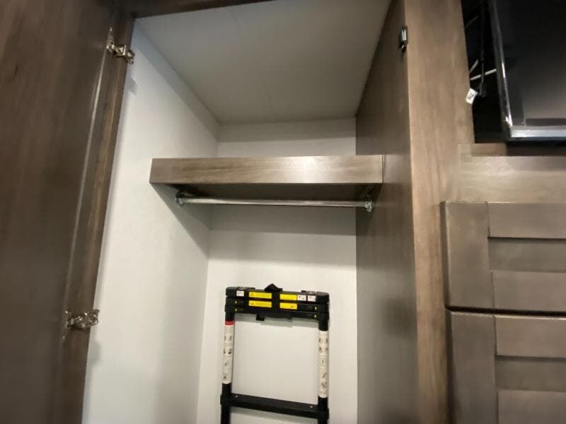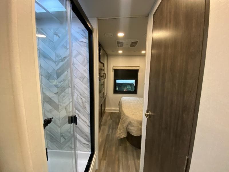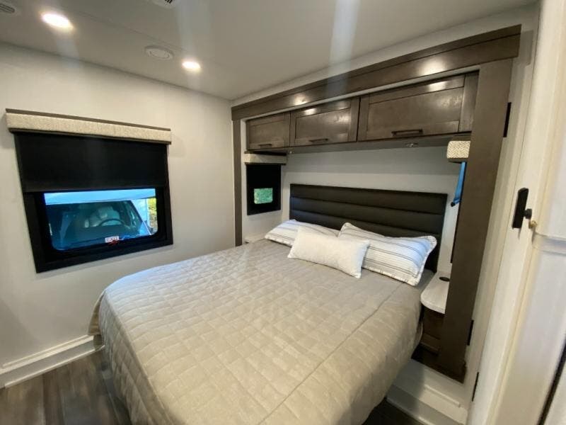 This motorhome includes double slides so you can enjoy more interior space, just like at home! The 42" x 70" booth dinette and 60" tri-fold sofa are in great view of the LED HD Smart TV, and your guests can sleep here, as well as on the cab-over bunk. This Greyhawk kitchen includes a Furrion all-in-one cooktop and oven, a residential-size microwave, and a pantry to store dry goods. You will find a convenient 30" x 36" shower, with the private toilet and sink across the hall so two people can freshen up at once. And don't overlook the rear bedroom with its queen bed slide out, dual bedroom wardrobes, and cabinet!
