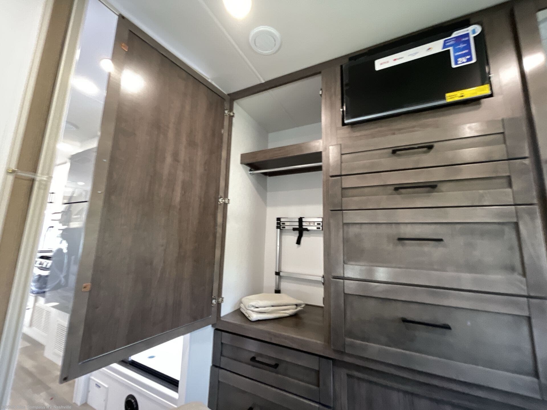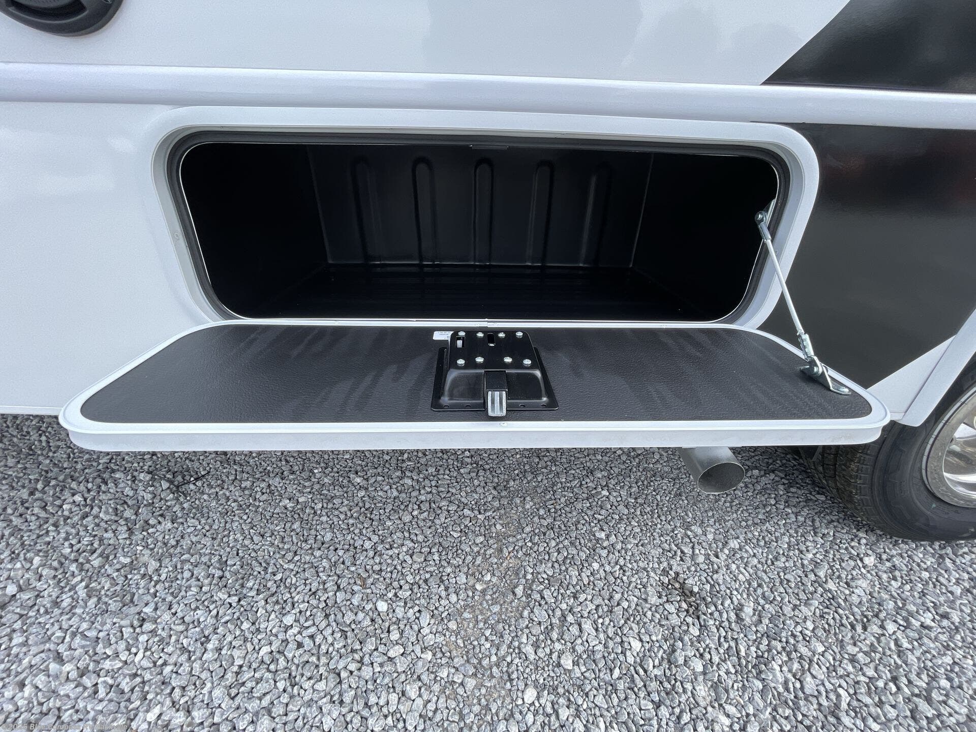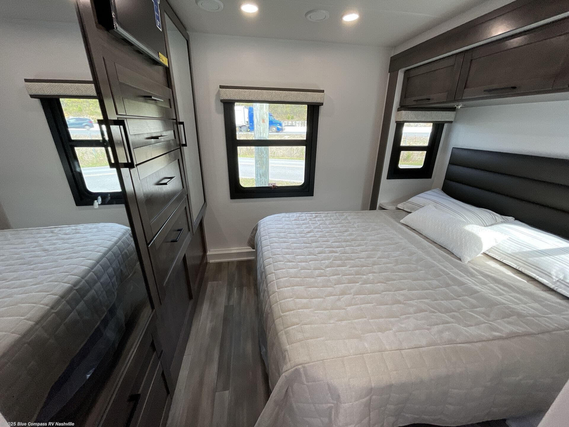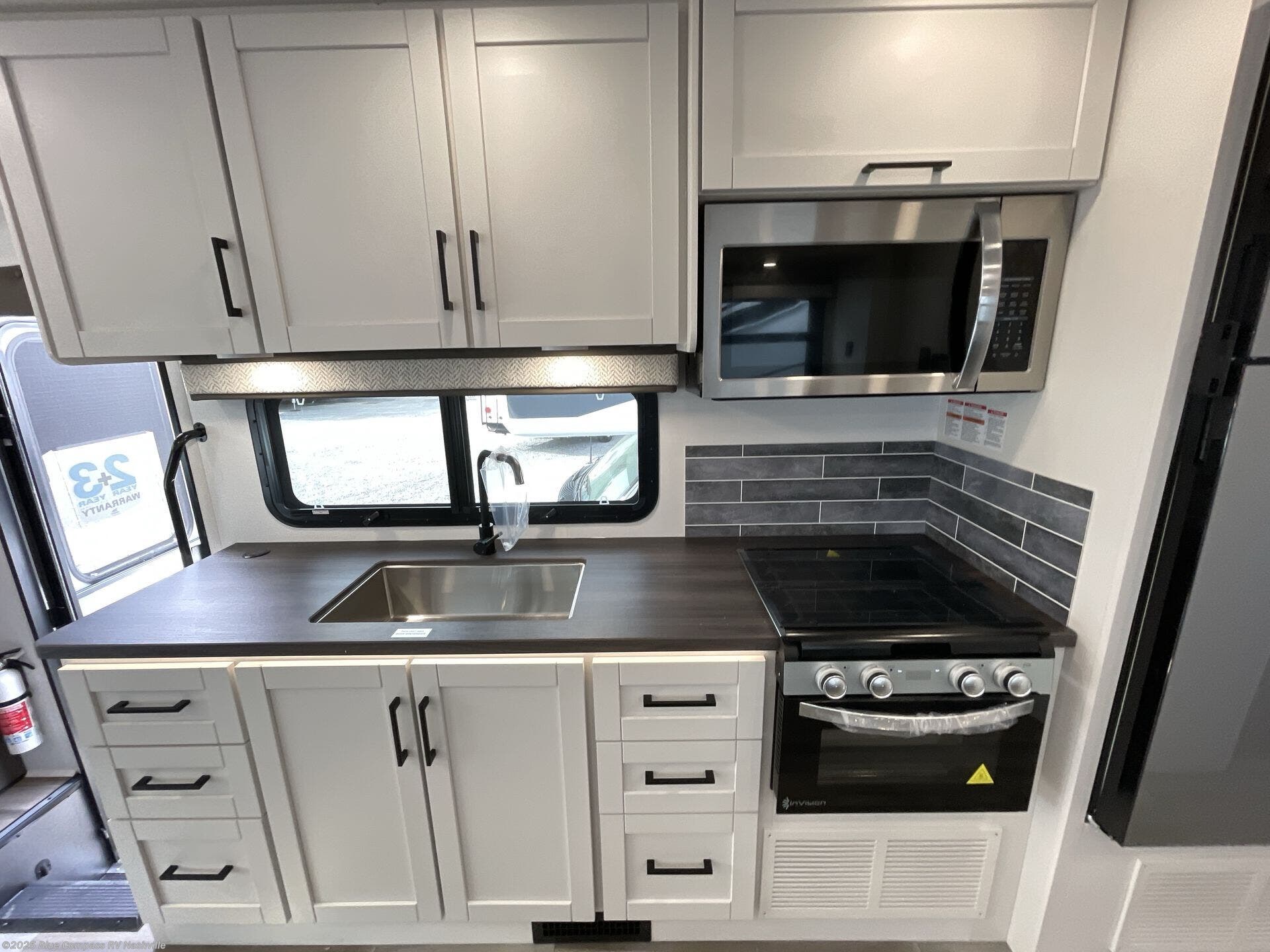 This motorhome includes double slides so you can enjoy more interior space, just like at home! The 42" x 70" booth dinette and 60" tri-fold sofa are in great view of the LED HD Smart TV, and your guests can sleep here, as well as on the cab-over bunk. This Greyhawk kitchen includes a Furrion all-in-one cooktop and oven, a residential-size microwave, and a pantry to store dry goods. You will find a convenient 30" x 36" shower, with the private toilet and sink across the hall so two people can freshen up at once. And don't overlook the rear bedroom with its queen bed slide out, dual bedroom wardrobes, and cabinet!