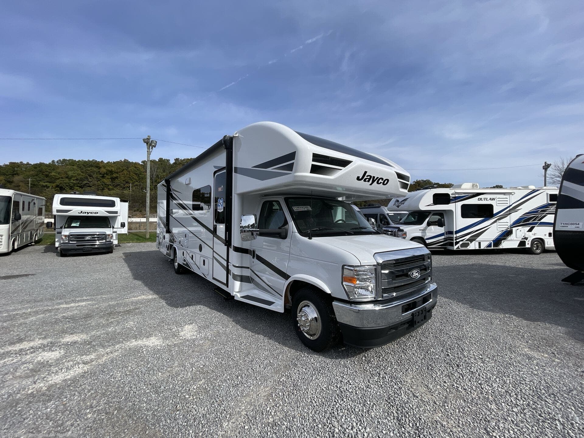 With any Greyhawk Class C gas motorhome by Jayco you will experience smooth sailing thanks to the JRIDE PLUS that comes with Koni shock absorbers, a computer-balanced driveshaft, Hellwig helper springs, and more. The Ford E-450 chassis with a 7.3L V8 325 HP engine will power your excursions, and you'll appreciate the added safety features for your peace of mind. Each model features a Sony infotainment center with Apple CarPlay and Android Auto, backup and side-view cameras, and a tire pressure monitor system the driver is sure to appreciate. Durable construction begins with Stronghold VBL roof, floor and sidewalls, bead-foam insulation, and a one-piece seamless fiberglass front cap. Head inside to find blackout night roller shades, LED-lit pressed countertops, an 84" interior ceiling height, and hardwood cabinet doors and drawers.