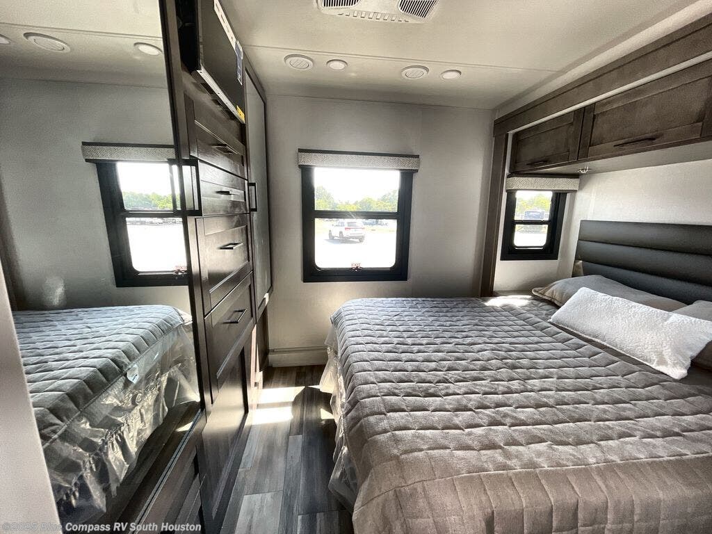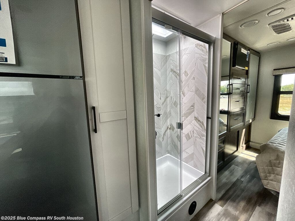This motorhome includes double slides so you can enjoy more interior space, just like at home! The 42" x 70" booth dinette and 60" tri-fold sofa are in great view of the LED HD Smart TV, and your guests can sleep here, as well as on the cab-over bunk. This Greyhawk kitchen includes a Furrion all-in-one cooktop and oven, a residential-size microwave, and a pantry to store dry goods. You will find a convenient 30" x 36" shower, with the private toilet and sink across the hall so two people can freshen up at once. And don't overlook the rear bedroom with its queen bed slide out, dual bedroom wardrobes, and cabinet!
