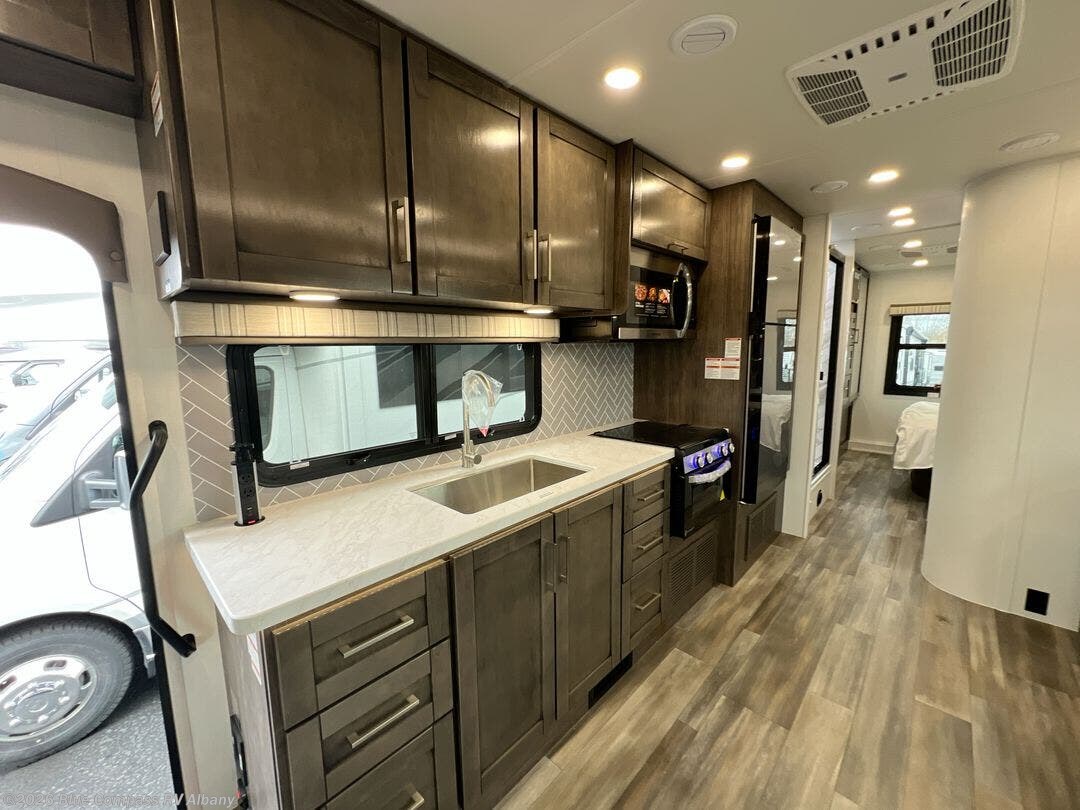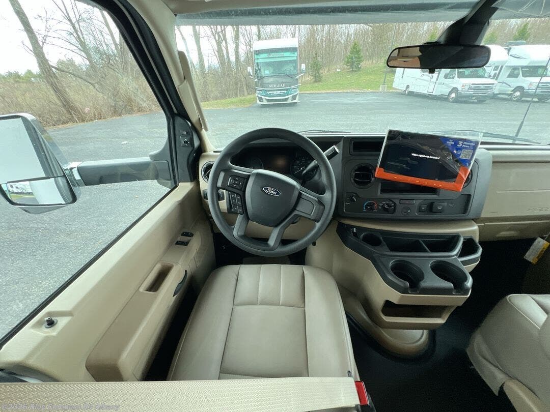 With any Greyhawk Class C gas motorhome by Jayco you will experience smooth sailing thanks to the JRIDE PLUS that comes with Koni shock absorbers, a computer-balanced driveshaft, Hellwig helper springs, and more. The Ford E-450 chassis with a 7.3L V8 325 HP engine will power your excursions, and you'll appreciate the added safety features for your peace of mind. Each model features a Sony infotainment center with Apple CarPlay and Android Auto, backup and side-view cameras, and a tire pressure monitor system the driver is sure to appreciate. Durable construction begins with Stronghold VBL roof, floor and sidewalls, bead-foam insulation, and a one-piece seamless fiberglass front cap. Head inside to find blackout night roller shades, LED-lit pressed countertops, an 84" interior ceiling height, and hardwood cabinet doors and drawers.
