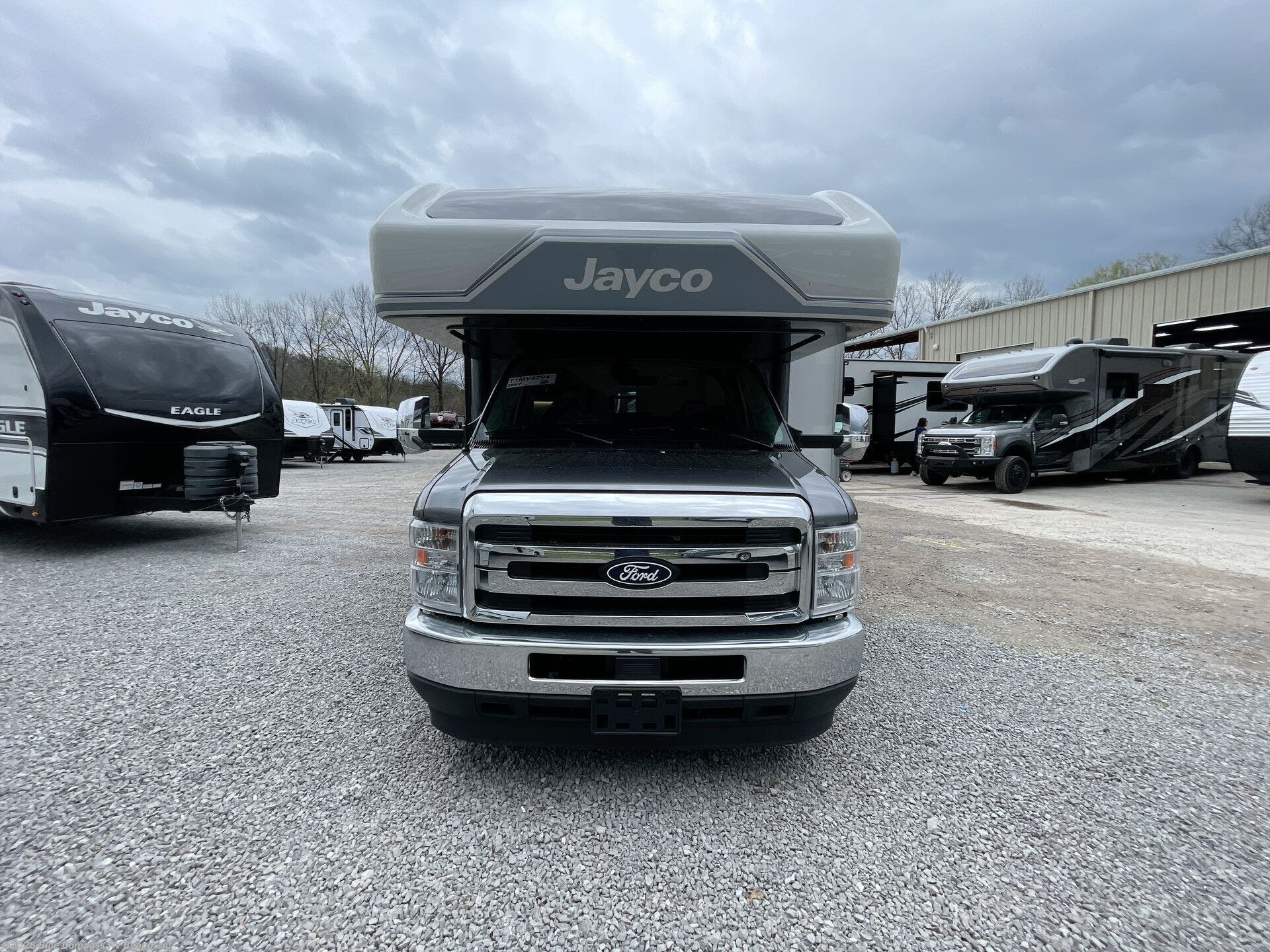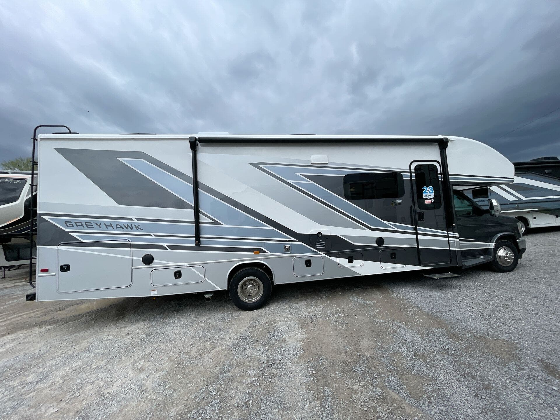 With any Greyhawk Class C gas motorhome by Jayco you will experience smooth sailing thanks to the JRIDE PLUS that comes with Koni shock absorbers, a computer-balanced driveshaft, Hellwig helper springs, and more. The Ford E-450 chassis with a 7.3L V8 325 HP engine will power your excursions, and you'll appreciate the added safety features for your peace of mind. Each model features a Sony infotainment center with Apple CarPlay and Android Auto, backup and side-view cameras, and a tire pressure monitor system the driver is sure to appreciate. Durable construction begins with Stronghold VBL roof, floor and sidewalls, bead-foam insulation, and a one-piece seamless fiberglass front cap. Head inside to find blackout night roller shades, LED-lit pressed countertops, an 84" interior ceiling height, and hardwood cabinet doors and drawers.