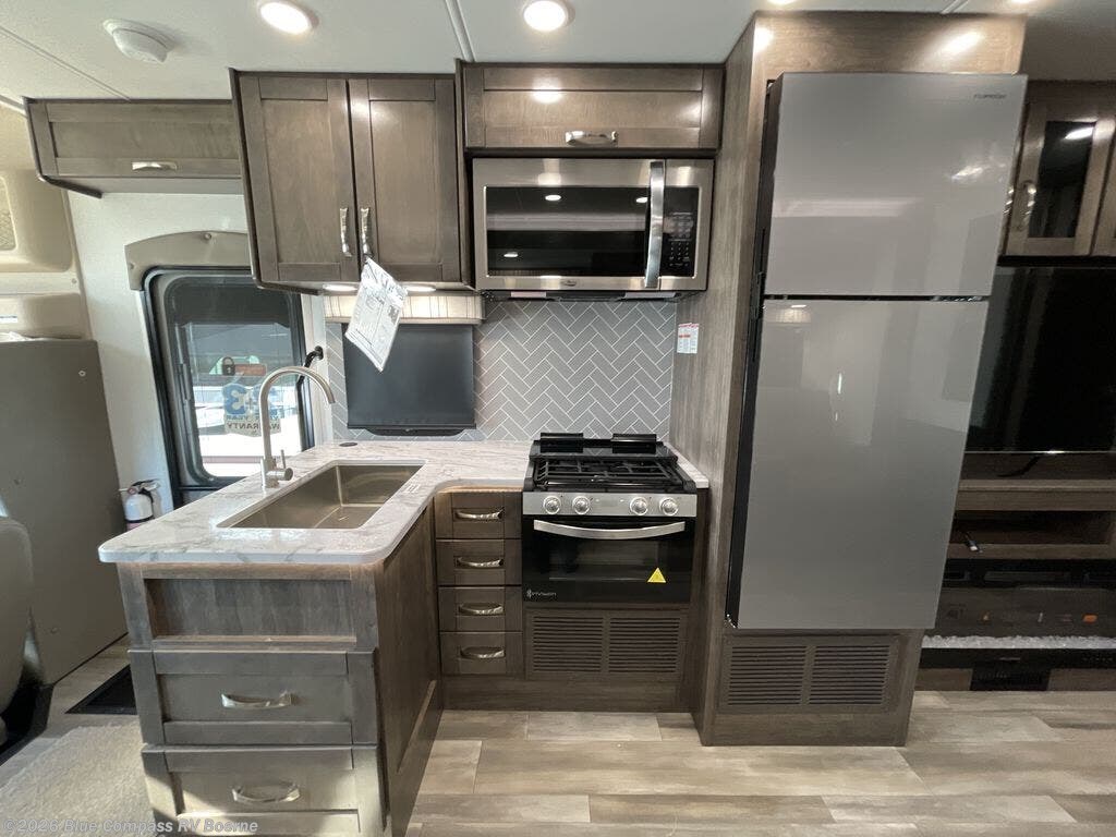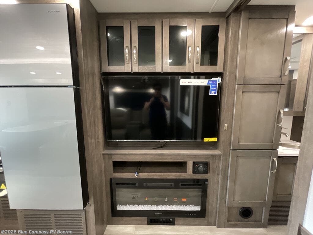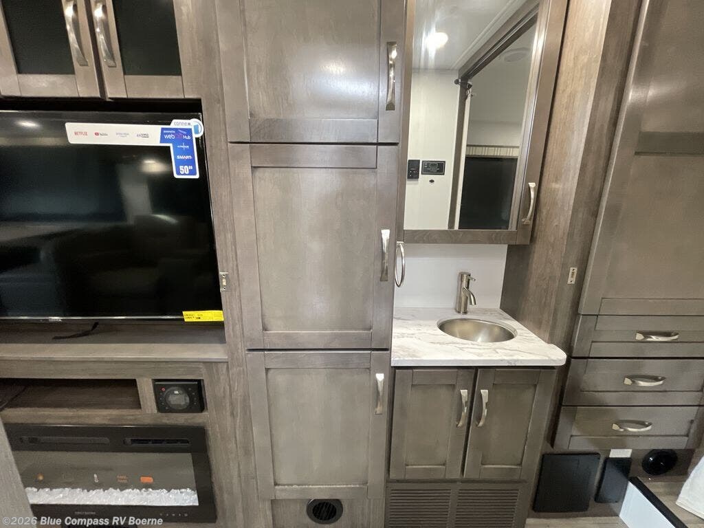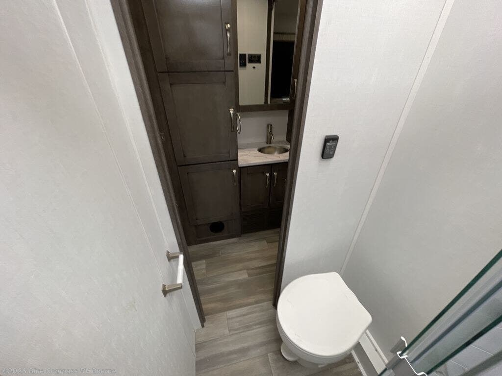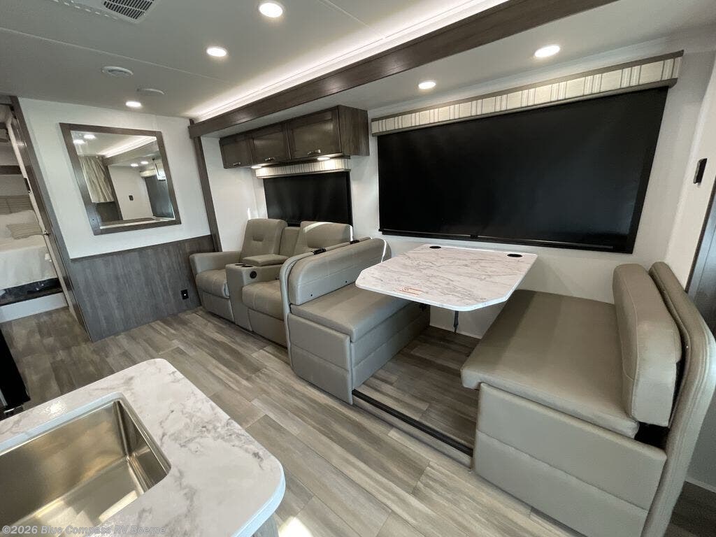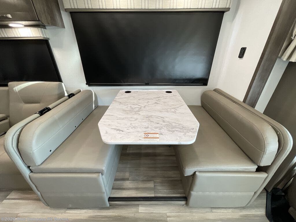 Pack your bags and head to your favorite camping spot in this spacious motorhome for six to seven. The little ones will love the cab-over bunk, and you'll have your own private bedroom in the back. There is also 72" theater seating and a 42" x 70" booth dinette that will serve as seating and sleeping space as well. This model will feel more like home with its fireplace, entertainment center with a 50" TV, and spacious living area. There is also a private toilet and shower, with the sink across the hall for convenience.
