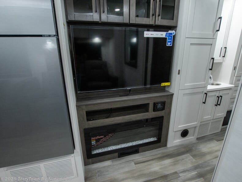 Pack your bags and head to your favorite camping spot in this spacious motorhome for six to seven. The little ones will love the cab-over bunk, and you'll have your own private bedroom in the back. There is also 72" theater seating and a 42" x 70" booth dinette that will serve as seating and sleeping space as well. This model will feel more like home with its fireplace, entertainment center with a 50" TV, and spacious living area. There is also a private toilet and shower, with the sink across the hall for convenience.