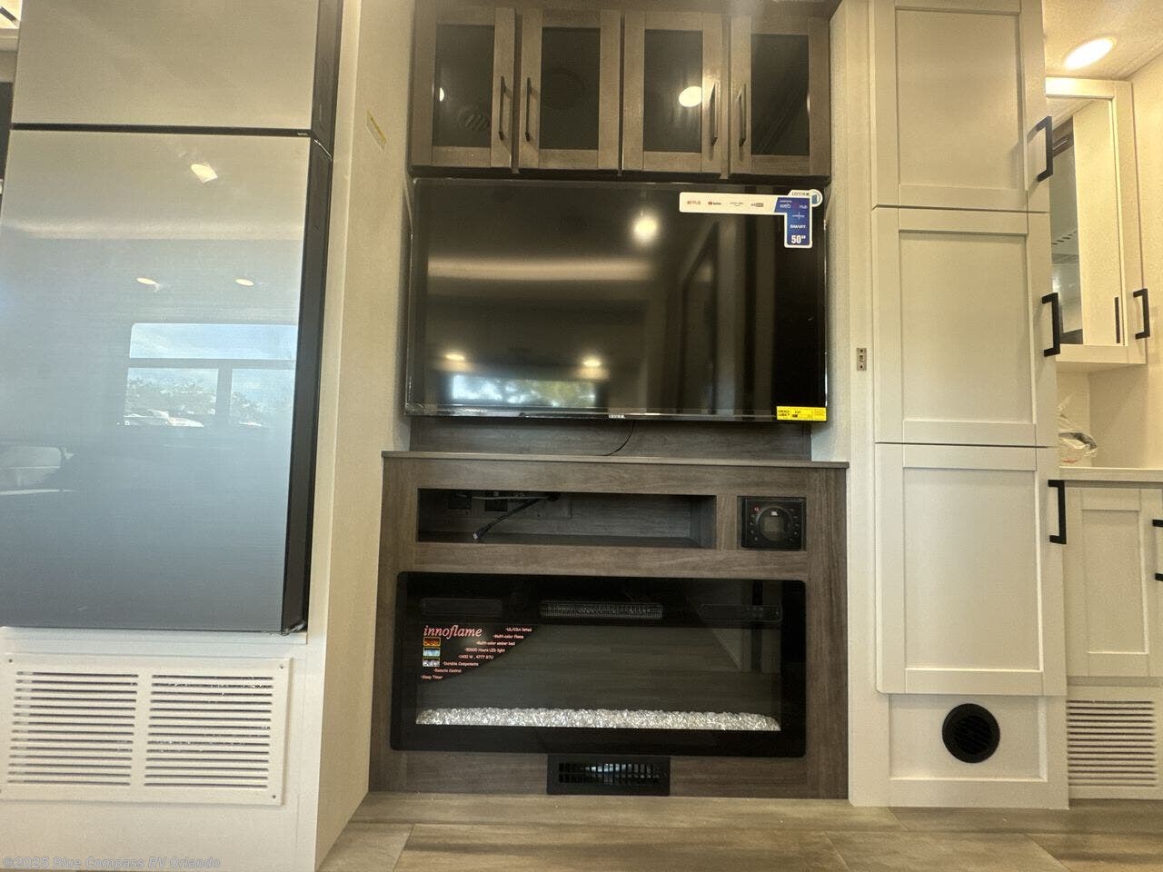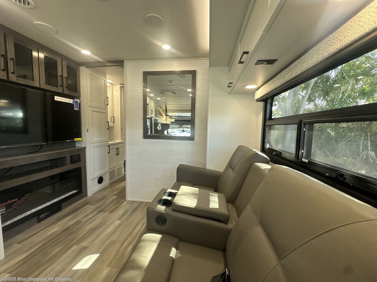 Pack your bags and head to your favorite camping spot in this spacious motorhome for six to seven. The little ones will love the cab-over bunk, and you'll have your own private bedroom in the back. There is also 72" theater seating and a 42" x 70" booth dinette that will serve as seating and sleeping space as well. This model will feel more like home with its fireplace, entertainment center with a 50" TV, and spacious living area. There is also a private toilet and shower, with the sink across the hall for convenience.