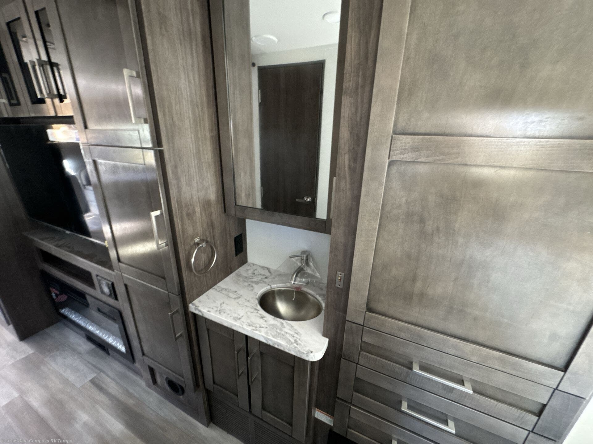 Pack your bags and head to your favorite camping spot in this spacious motorhome for six to seven. The little ones will love the cab-over bunk, and you'll have your own private bedroom in the back. There is also 72" theater seating and a 42" x 70" booth dinette that will serve as seating and sleeping space as well. This model will feel more like home with its fireplace, entertainment center with a 50" TV, and spacious living area. There is also a private toilet and shower, with the sink across the hall for convenience.