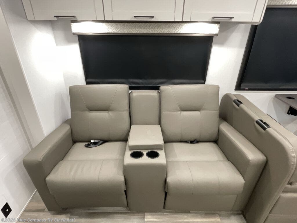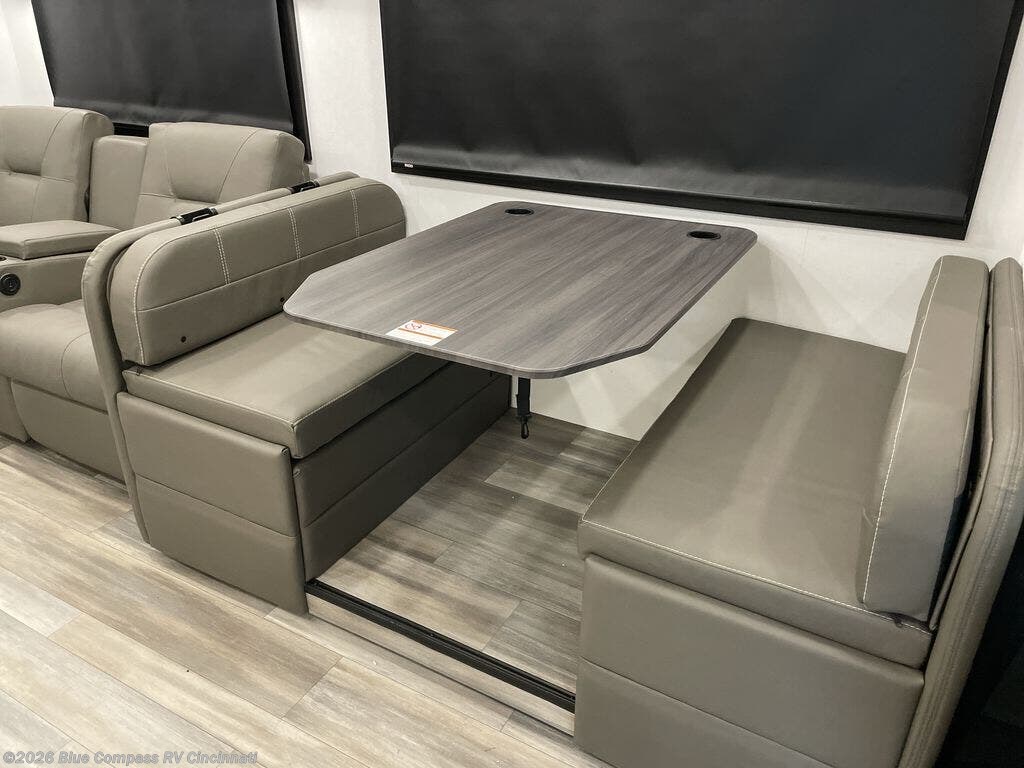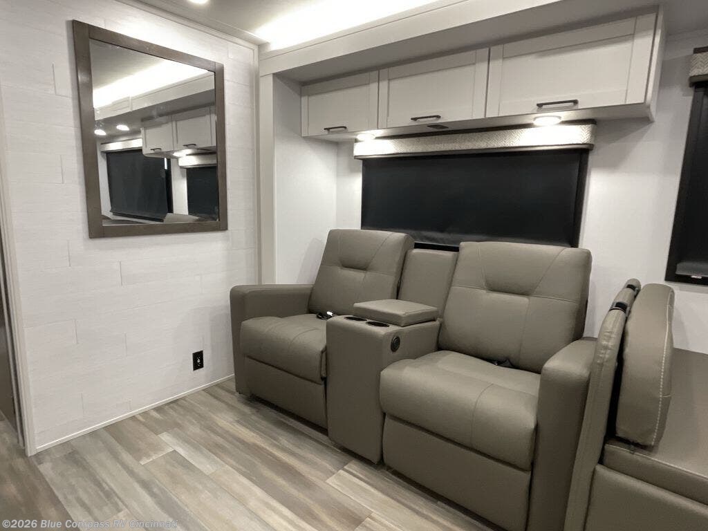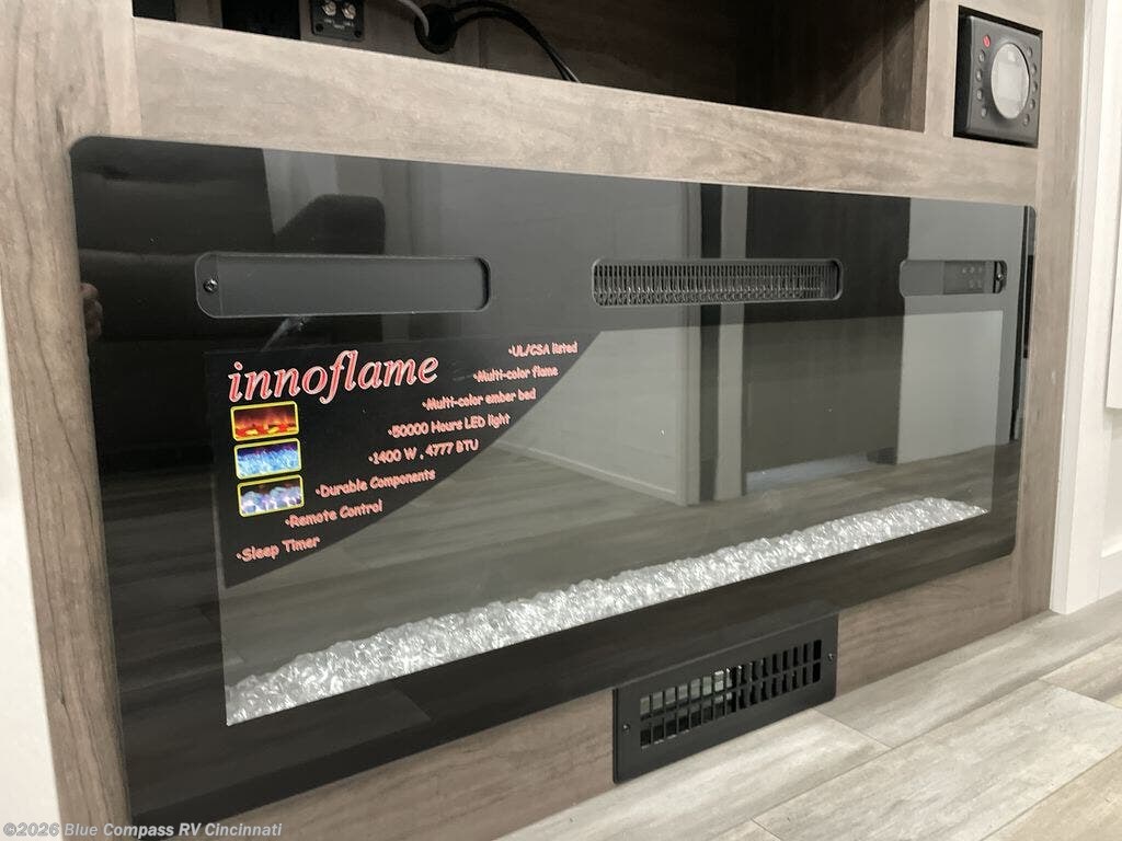 Pack your bags and head to your favorite camping spot in this spacious motorhome for six to seven. The little ones will love the cab-over bunk, and you'll have your own private bedroom in the back. There is also 72" theater seating and a 42" x 70" booth dinette that will serve as seating and sleeping space as well. This model will feel more like home with its fireplace, entertainment center with a 50" TV, and spacious living area. There is also a private toilet and shower, with the sink across the hall for convenience.