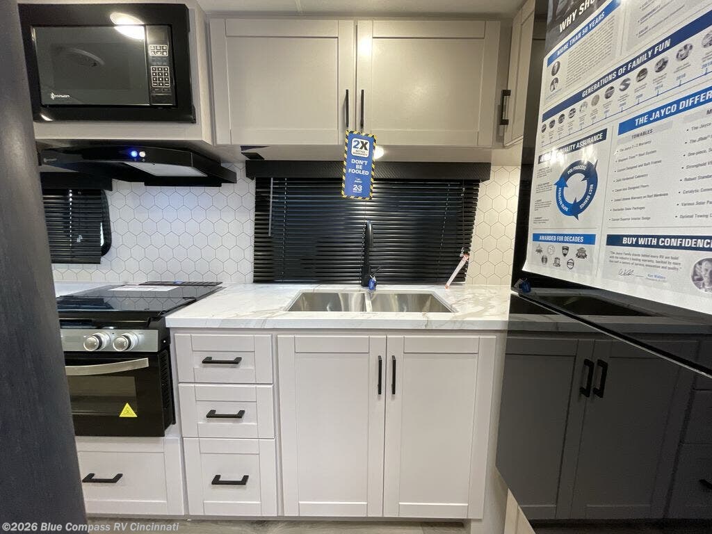 With any Jay Feather travel trailer by Jayco, you will enjoy lightweight towing, convenient exterior amenities, and at-home comforts inside! The Overlander 1 Solar Package included within the Jay Sport Package comes with a 200W solar panel and a 30-amp digital controller so you can enjoy some off-grid camping. There is also a modern graphics package with a dual-colored sidewall, LCI Solid Step fold-down aluminum tread steps on the main entry door, and Climate Shield 0 -100° F tested weather insulation package that will allow you to camp in all sorts of climates. The Customer Value Package will make time outdoors easier than ever with a power tongue jack and a Rock Solid stabilizer system, plus American-made nitro-filled Goodyear tires with self-adjusting electric brakes. More exterior features include a Keyed-Alike locking system, marine grade exterior speakers, a Magnum Truss roof system, and the list goes on! And we haven't even touched on the interior comforts, like the residential style seamless countertops and vinyl flooring throughout, decorative backsplash, handcrafted hardwood door/drawer fronts, and multiple USB charging ports to keep you going!