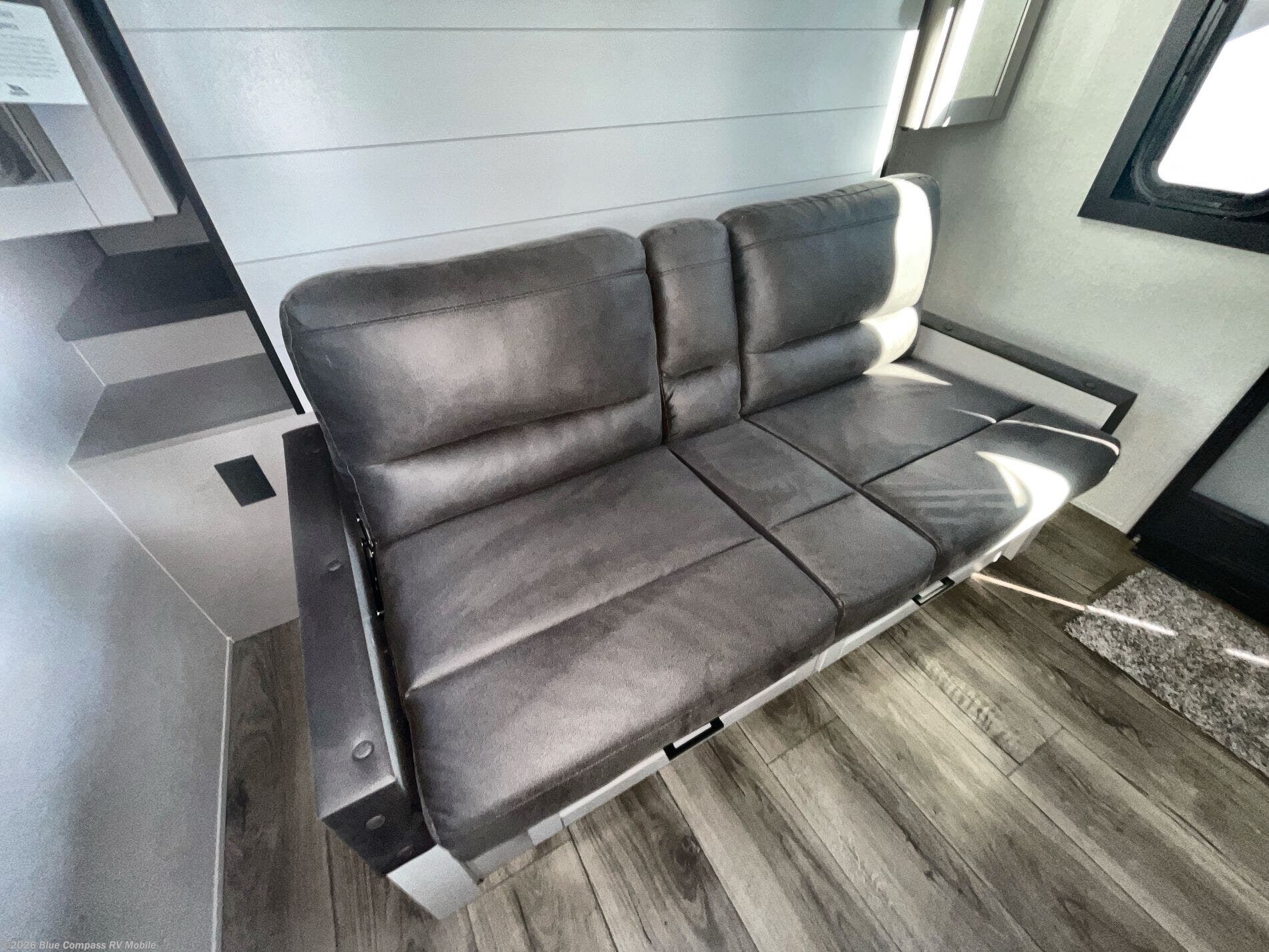 This travel trailer offers a lot of possibilities! During the day, relax in the spacious front living area with a jackknife sofa plus a pair of theater seats, both positioned for a great view of the entertainment center. A fully equipped kitchen with stainless steel sink, microwave, and three-burner range makes meals easy, and the theater seats have swing-out trays for you to dine. At night, pull down the Murphy bed for a great night's sleep! wardrobes on either side of the bed provide plenty of storage for your clothing. The rear corner bath is convenient and private,and offers a linen closet plus a medicine cabinet for additional storage capability. Outside you will be sheltered from the sun beneath the 15' awning, and there is an LP Quick Connect if you want to hook up your personal grill.