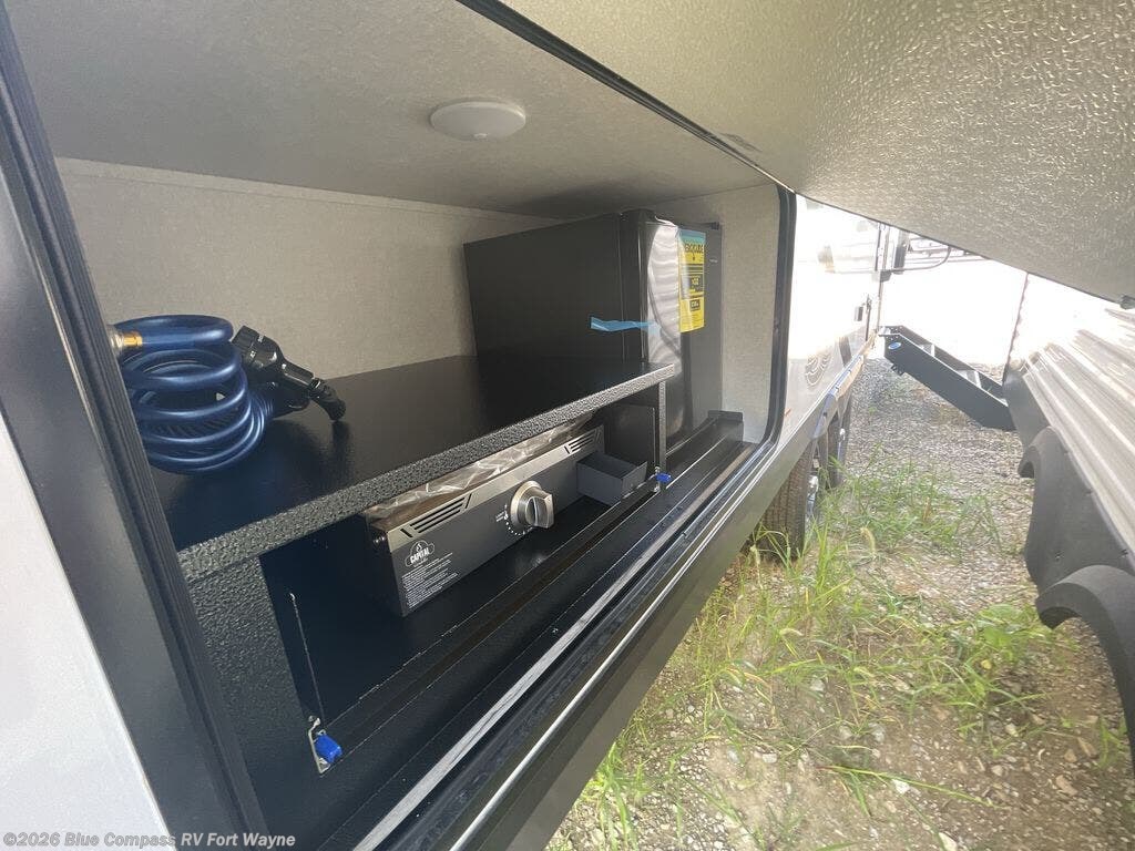 You'll be surprised how easy it will be to camp in this travel trailer for seven! The double-size bunks include flip-up storage and an exterior cargo door so you can easily pack in gear, plus there is front exterior storage as well. A Murphy bed up front means you can enjoy comfortable sleeping space at night, and cozy seating space during the day on the jack knife sofa. You'll also find a U-shaped dinette slide where you can dine together, and the pantry within the slide can hold snacks for everyone! This model includes an L-shaped kitchen counter, a microwave oven and three burner range to cook meals, plus an 11 cu. ft. 12V refrigerator for perishables! You may just find yourselves outdoor most of the time since there is a 19' power awning with LED lights and an outside kitchen!