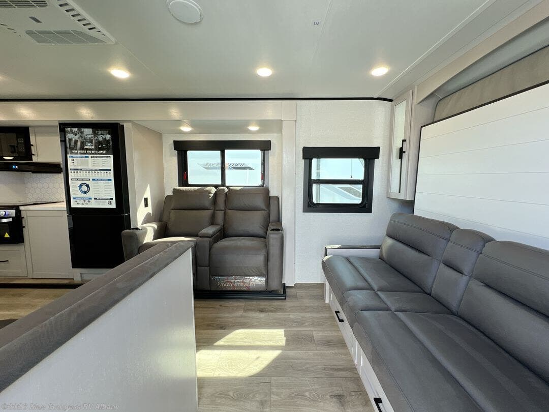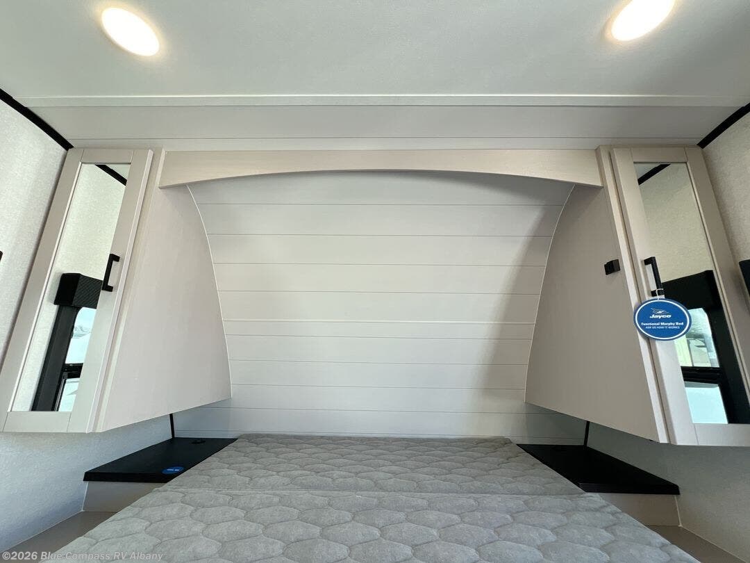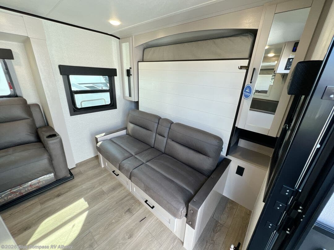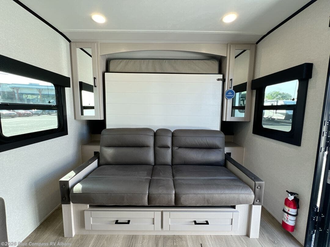 If you wish to escape the hustle and bustle of everyday life then you need this travel trailer! It features a front 60" x 75" Murphy bed with wardrobes on either side for bedtime and a jackknife sofa during the day. You can play games at the booth dinette after enjoying a delicious meal prepared with the three burner cooktop or relax at the theater seating with table trays and enjoy the LED TV. The rear corner bathroom has a shower with a skylight for you to get cleaned up in, as well as a linen closet to store your towels. There is exterior storage space to keep your outdoor gear, a 15' power awning to protect you from the elements.