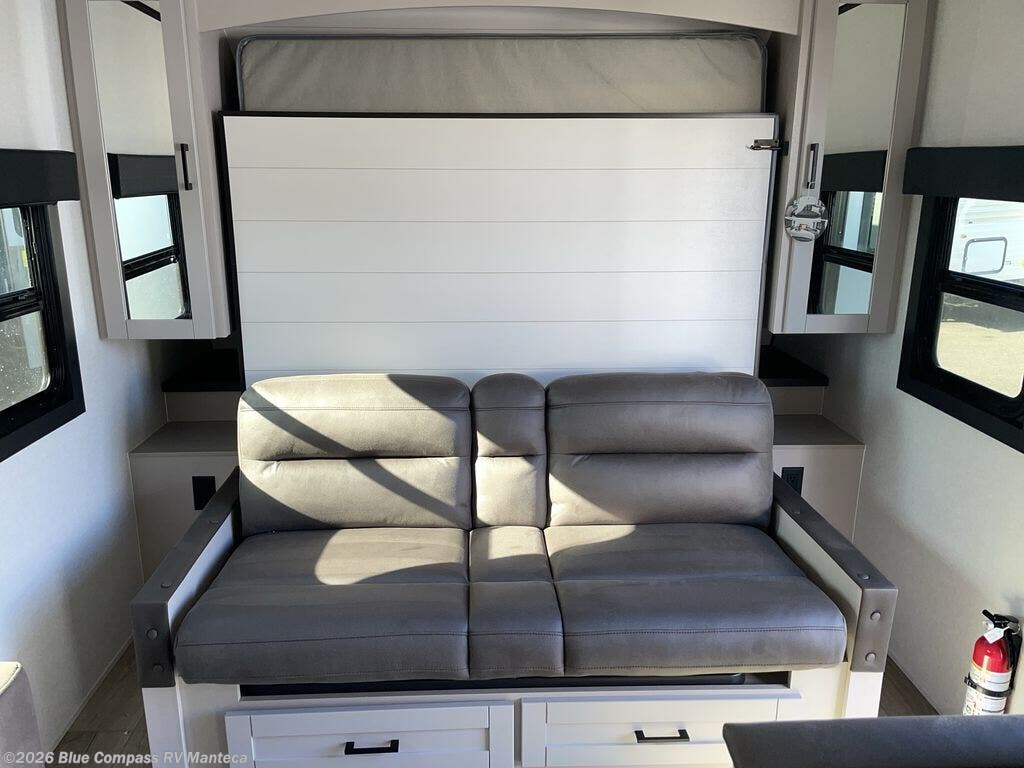 If you wish to escape the hustle and bustle of everyday life then you need this travel trailer! It features a front 60" x 75" Murphy bed with wardrobes on either side for bedtime and a jackknife sofa during the day. You can play games at the booth dinette after enjoying a delicious meal prepared with the three burner cooktop or relax at the theater seating with table trays and enjoy the LED TV. The rear corner bathroom has a shower with a skylight for you to get cleaned up in, as well as a linen closet to store your towels. There is exterior storage space to keep your outdoor gear, a 15' power awning to protect you from the elements.