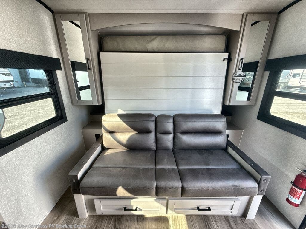 If you wish to escape the hustle and bustle of everyday life then you need this travel trailer! It features a front 60" x 75" Murphy bed with wardrobes on either side for bedtime and a jackknife sofa during the day. You can play games at the booth dinette after enjoying a delicious meal prepared with the three burner cooktop or relax at the theater seating with table trays and enjoy the LED TV. The rear corner bathroom has a shower with a skylight for you to get cleaned up in, as well as a linen closet to store your towels. There is exterior storage space to keep your outdoor gear, a 15' power awning to protect you from the elements.