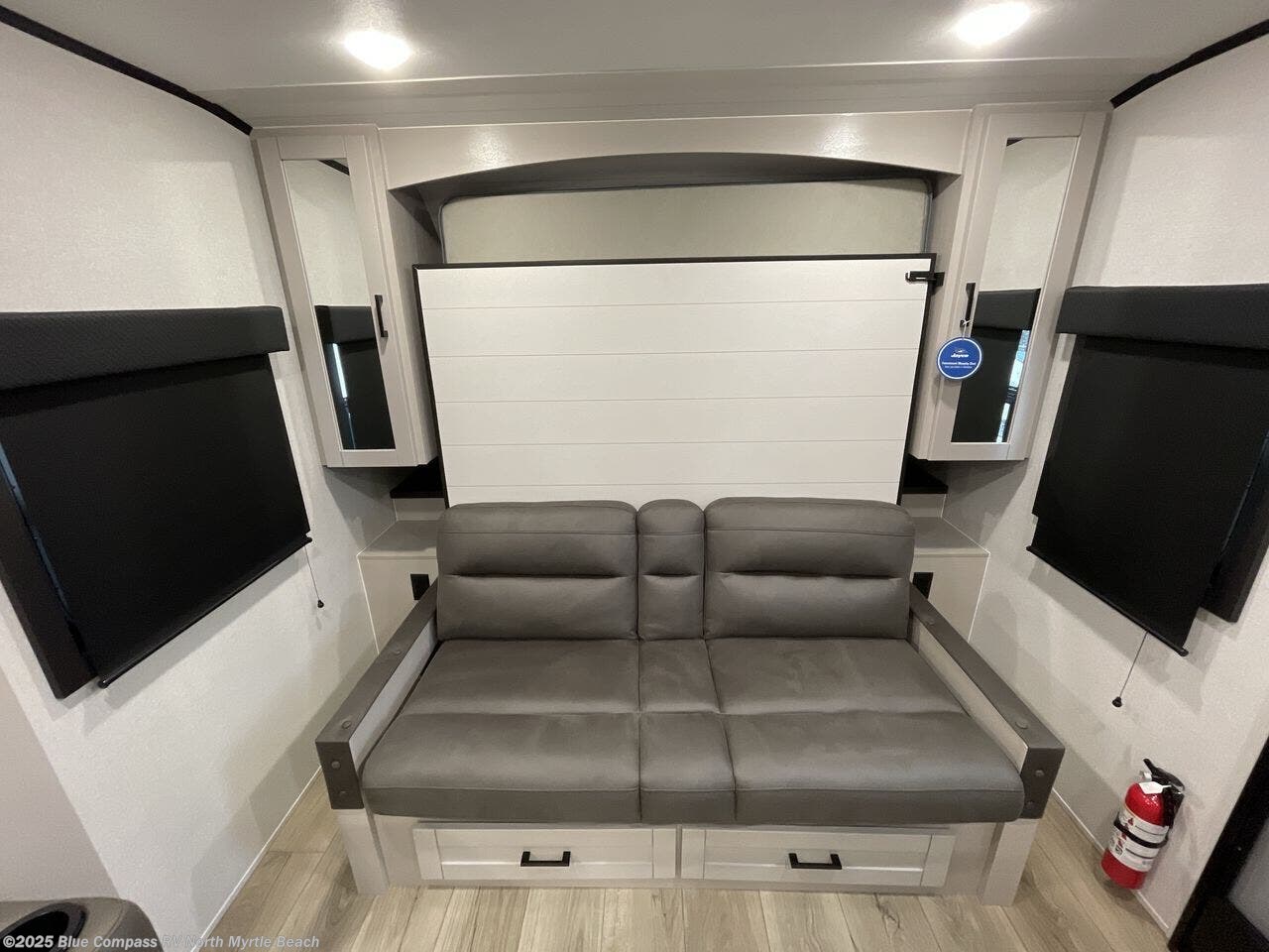 If you wish to escape the hustle and bustle of everyday life, then you need this travel trailer! It features a front Murphy bed with wardrobes on either side for bedtime and a jack-knife sofa during the day. You can play games at the booth dinette after enjoying a delicious meal prepared with the three burner cooktop or relax at the theater seating and enjoy the LED TV. The rear corner bathroom has a shower with a skylight for you to get cleaned up in, as well as a linen closet to store your towels. There is exterior storage space to keep your outdoor gear, a 15' power awning to protect you from the elements.