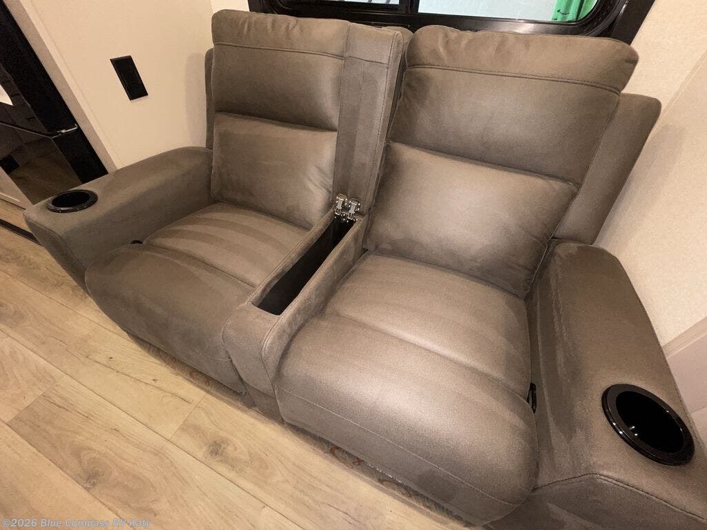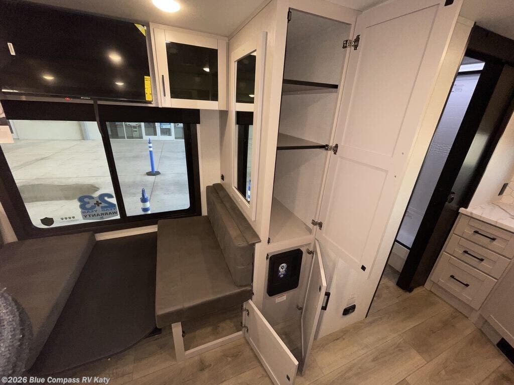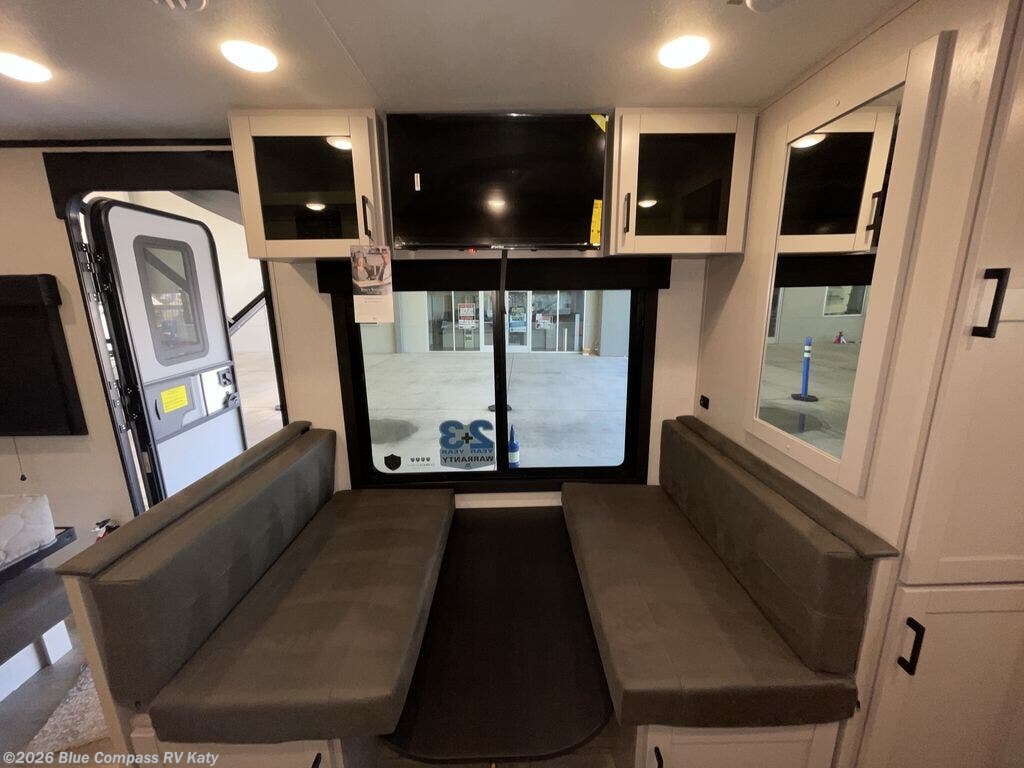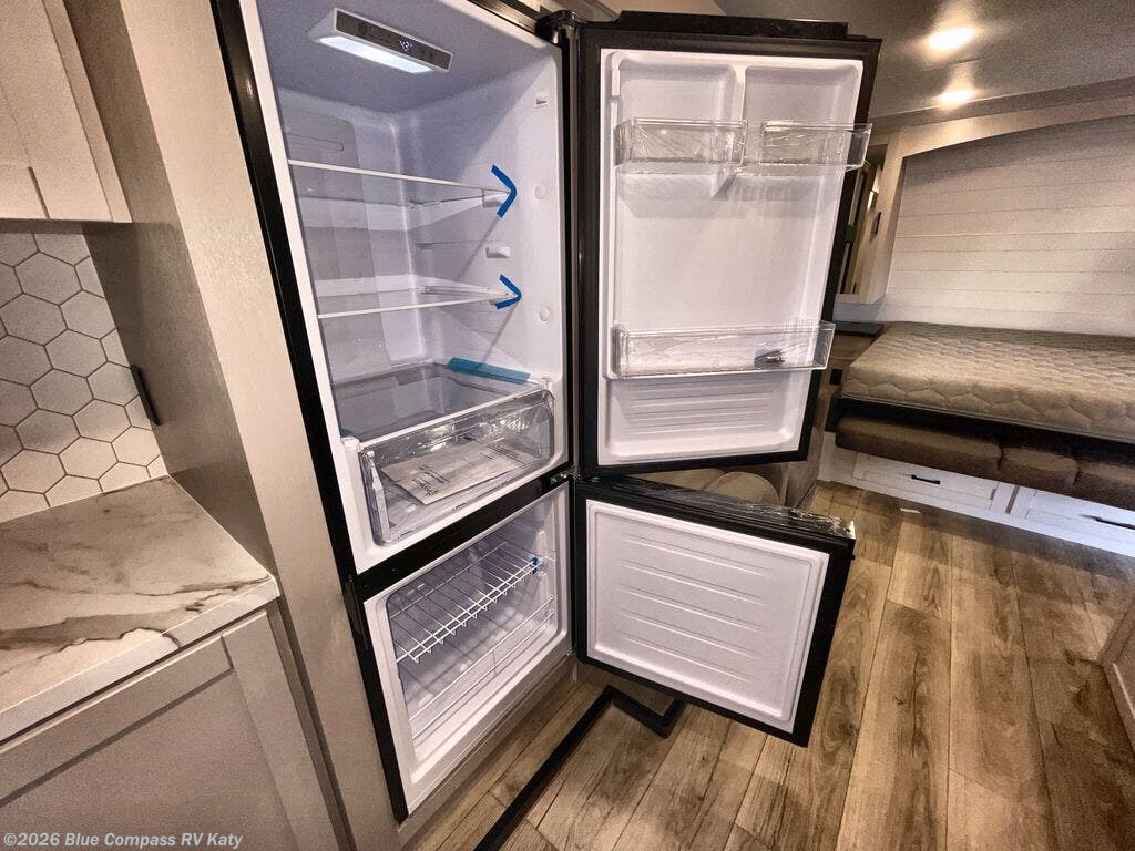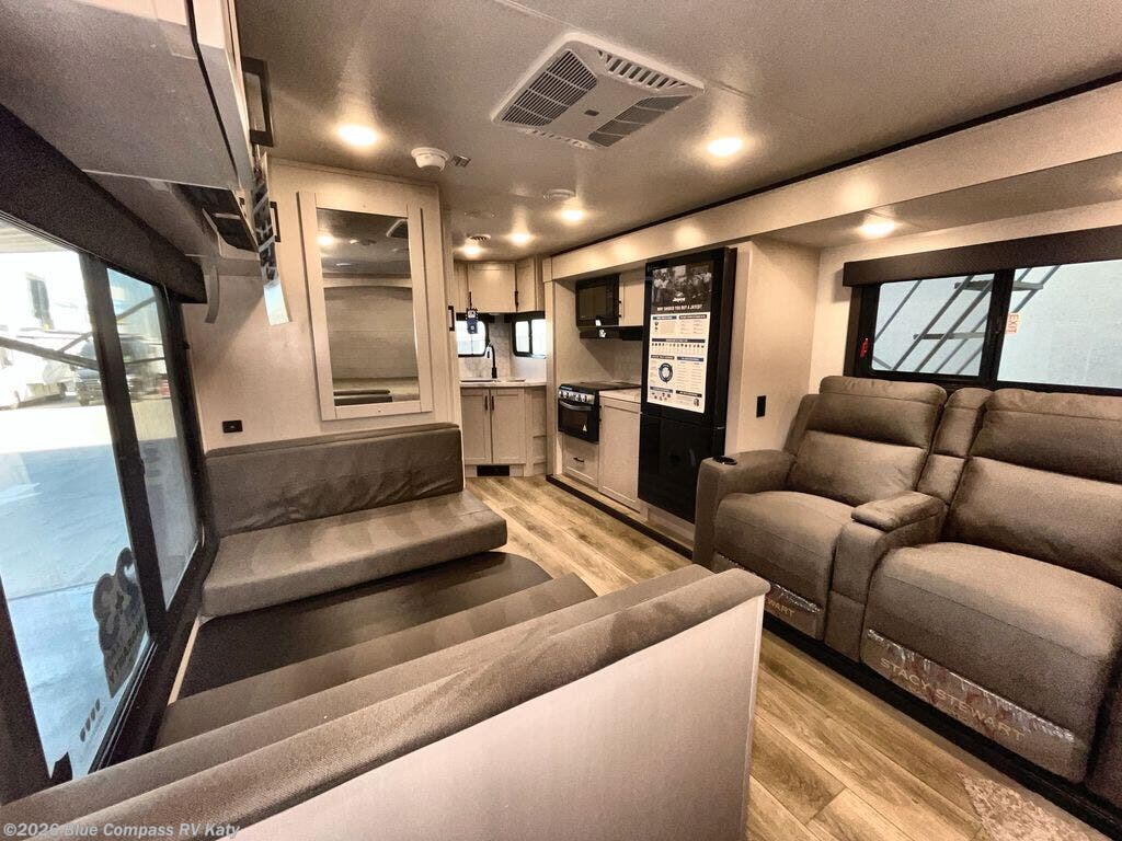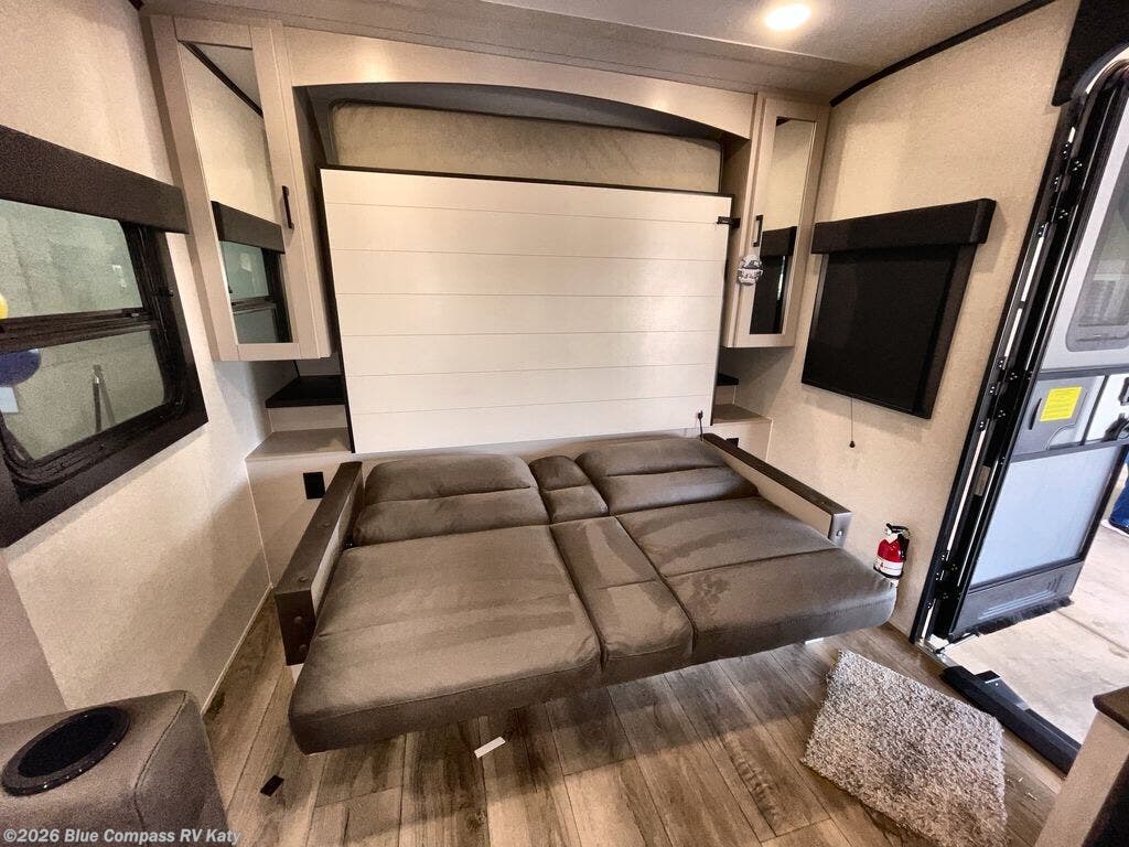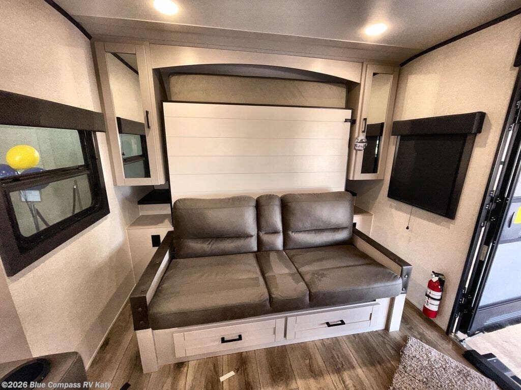 If you wish to escape the hustle and bustle of everyday life, then you need this travel trailer! It features a front Murphy bed with wardrobes on either side for bedtime and a jack-knife sofa during the day. You can play games at the booth dinette after enjoying a delicious meal prepared with the three burner cooktop or relax at the theater seating and enjoy the LED TV. The rear corner bathroom has a shower with a skylight for you to get cleaned up in, as well as a linen closet to store your towels. There is exterior storage space to keep your outdoor gear, a 15' power awning to protect you from the elements.