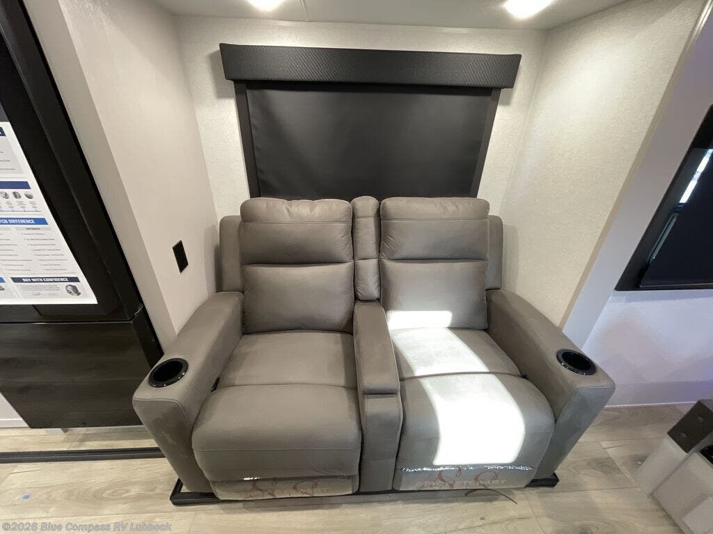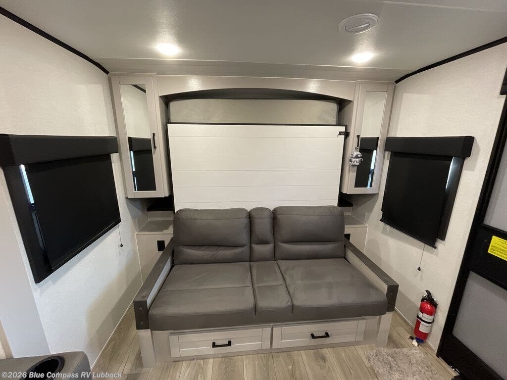 If you wish to escape the hustle and bustle of everyday life, then you need this travel trailer! It features a front Murphy bed with wardrobes on either side for bedtime and a jack-knife sofa during the day. You can play games at the booth dinette after enjoying a delicious meal prepared with the three burner cooktop or relax at the theater seating and enjoy the LED TV. The rear corner bathroom has a shower with a skylight for you to get cleaned up in, as well as a linen closet to store your towels. There is exterior storage space to keep your outdoor gear, a 15' power awning to protect you from the elements.