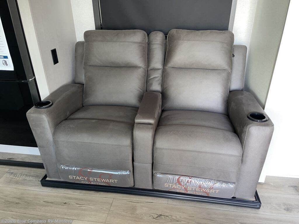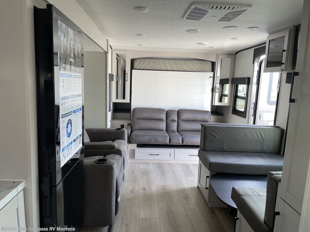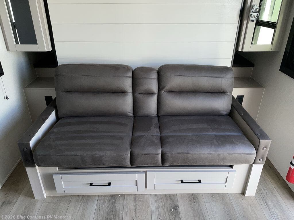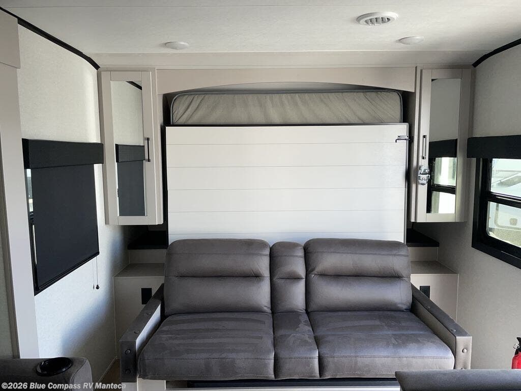 If you wish to escape the hustle and bustle of everyday life, then you need this travel trailer! It features a front Murphy bed with wardrobes on either side for bedtime and a jack-knife sofa during the day. You can play games at the booth dinette after enjoying a delicious meal prepared with the three burner cooktop or relax at the theater seating and enjoy the LED TV. The rear corner bathroom has a shower with a skylight for you to get cleaned up in, as well as a linen closet to store your towels. There is exterior storage space to keep your outdoor gear, a 15' power awning to protect you from the elements.
