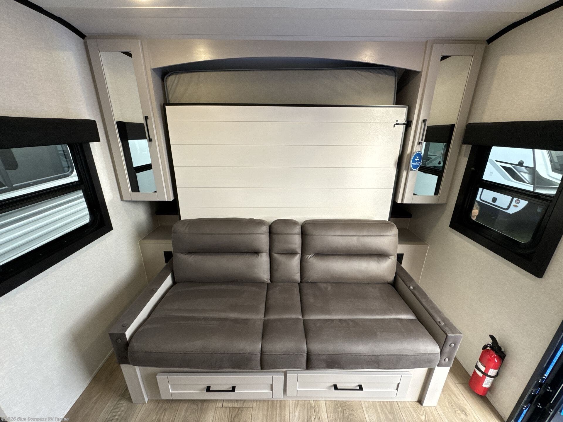 If you wish to escape the hustle and bustle of everyday life, then you need this travel trailer! It features a front Murphy bed with wardrobes on either side for bedtime and a jack-knife sofa during the day. You can play games at the booth dinette after enjoying a delicious meal prepared with the three burner cooktop or relax at the theater seating and enjoy the LED TV. The rear corner bathroom has a shower with a skylight for you to get cleaned up in, as well as a linen closet to store your towels. There is exterior storage space to keep your outdoor gear, a 15' power awning to protect you from the elements.