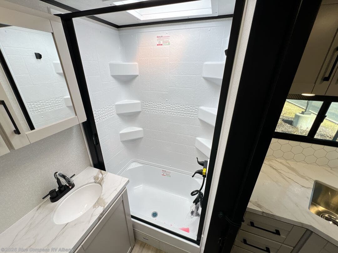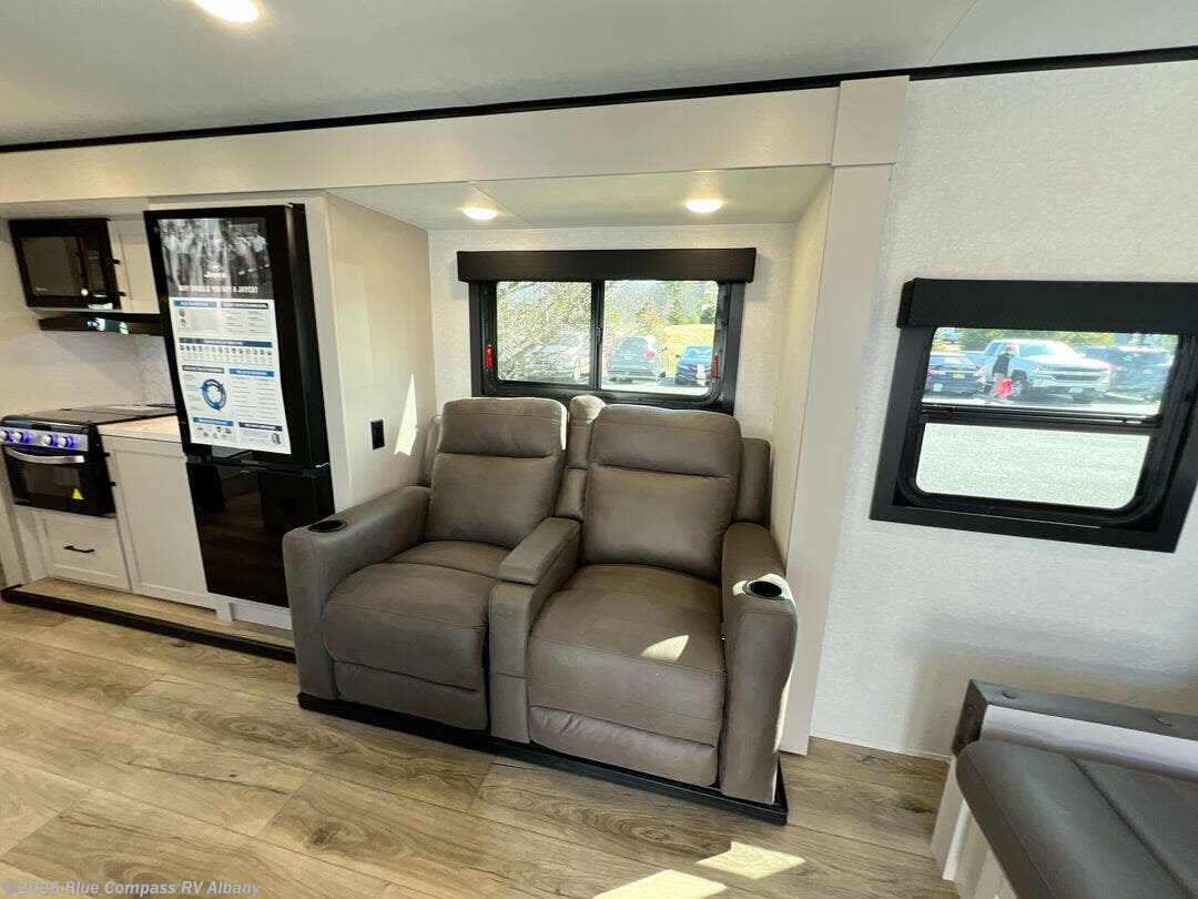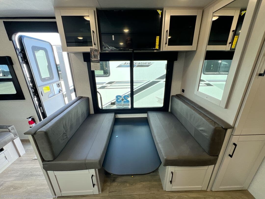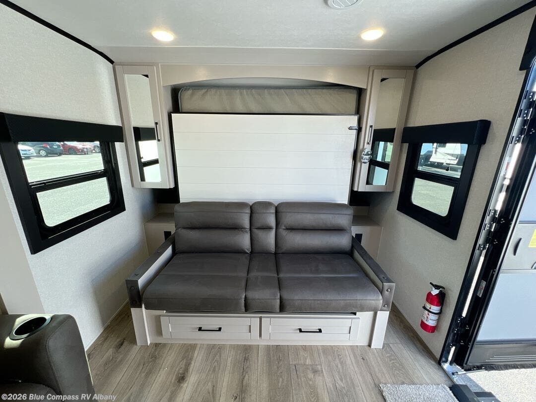 If you wish to escape the hustle and bustle of everyday life, then you need this travel trailer! It features a front Murphy bed with wardrobes on either side for bedtime and a jack-knife sofa during the day. You can play games at the booth dinette after enjoying a delicious meal prepared with the three burner cooktop or relax at the theater seating and enjoy the LED TV. The rear corner bathroom has a shower with a skylight for you to get cleaned up in, as well as a linen closet to store your towels. There is exterior storage space to keep your outdoor gear, a 15' power awning to protect you from the elements.