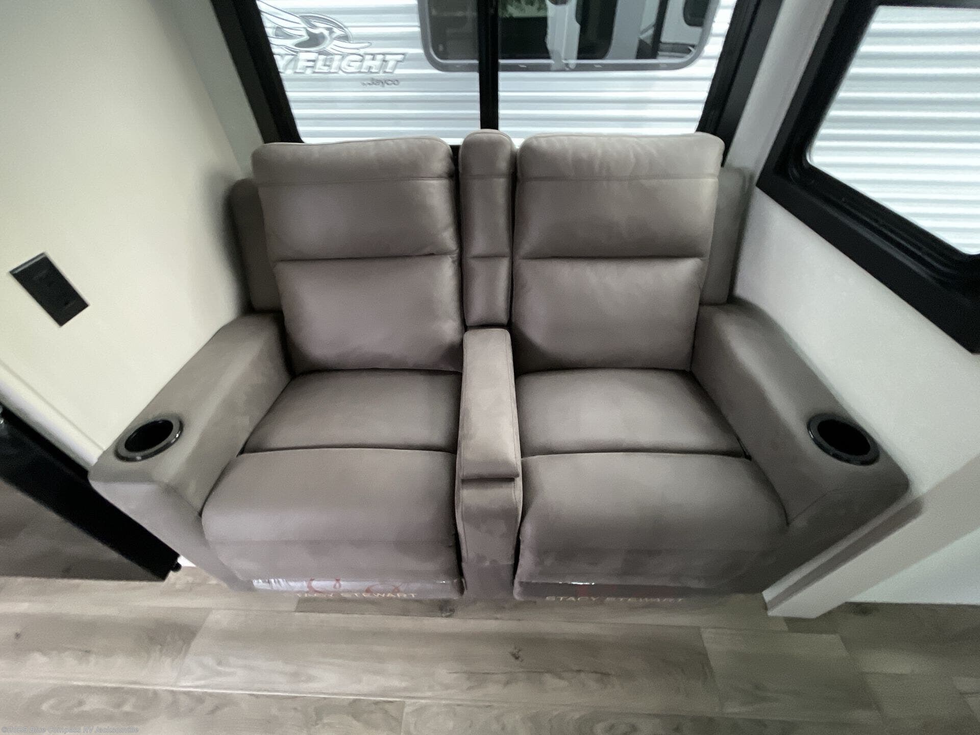 The chef of your group will love this rear kitchen trailer with generous counter space to prep meals! Your crew can dine at the booth dinette or under the 20' power awning with LED lights, and when you're ready to relax, the theater seat will provide comfort. There is also a storage cabinet with a bench that will allow you to utilize this space however you need it! The spacious full bath will let you clean up each day, and the front private bedroom is sure to make you feel at home. Here, you'll find a queen bed, three wardrobes, plus one of the dual entry doors for added convenience!
