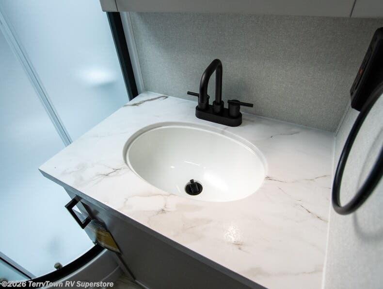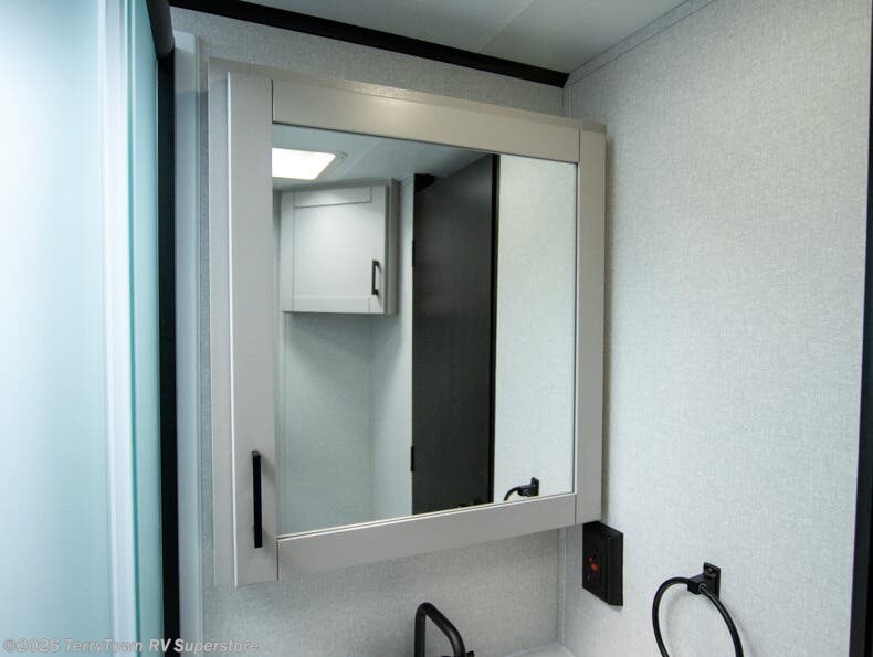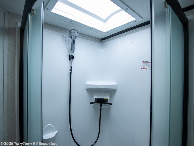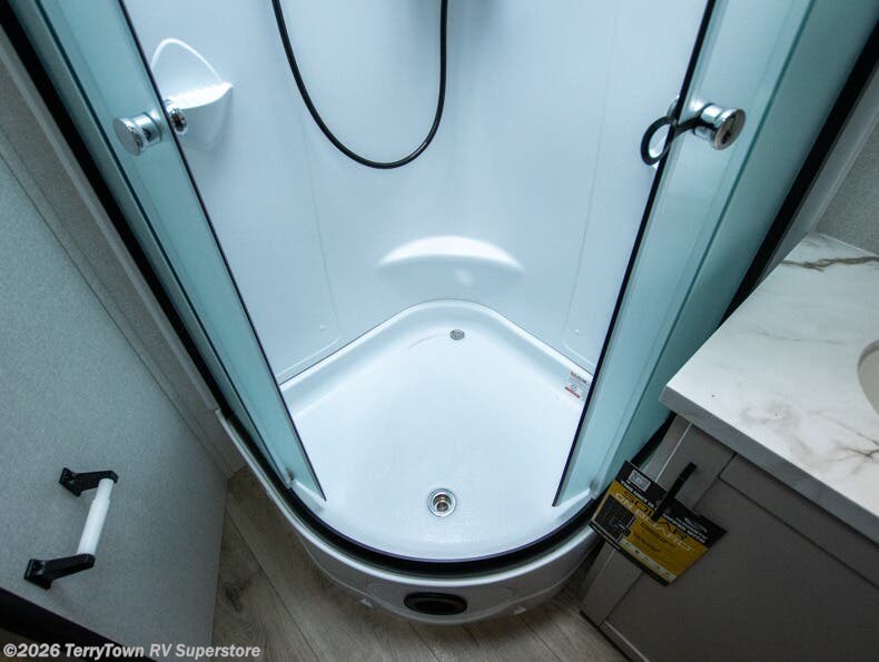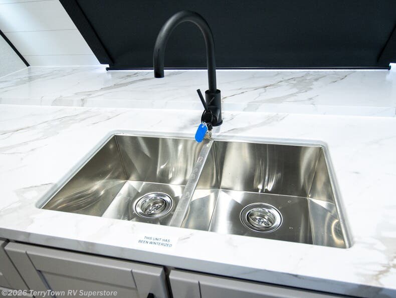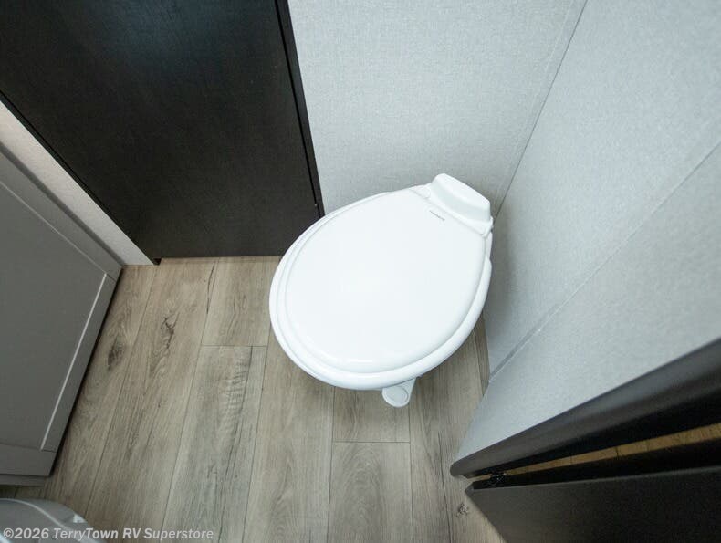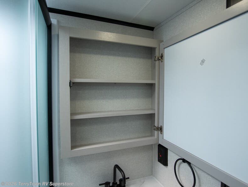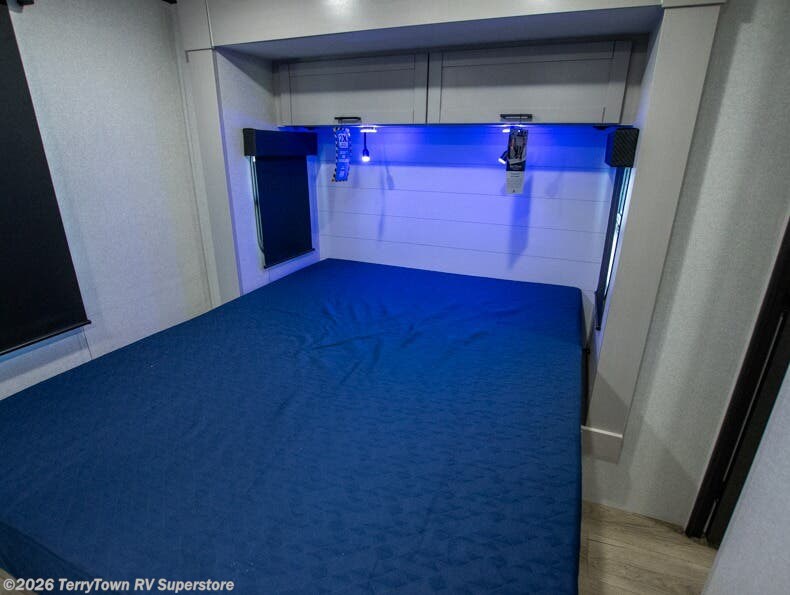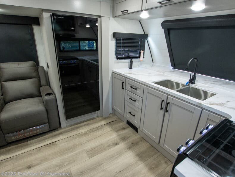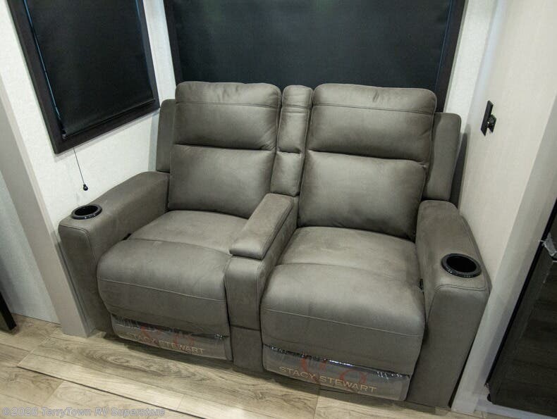 Step inside this spacious travel trailer through the front entry and you find the front kitchen that spans the width of the unit, providing plenty of counter space for meal prep. The kitchen is fully equipped with a stainless-steel sink, a decorative backsplash, a 3-burner cooktop, and an 11-cu. ft. 12V refrigerator, perfect for storing all your groceries. Overhead shelves offer convenient storage, and a pantry adds extra space for essentials. Next to the kitchen, you’ll find 60" theater seating, ideal for enjoying meals or watching your favorite shows on the LED Smart TV. As you move down the hall, you’ll come to a full bathroom featuring a radius shower and two entry doors for easy access. At the rear of the trailer, the comfortable bedroom features a 60" x 80" Queen bed, a sliding mirror door closet for added storage, and a second entry door to the exterior.