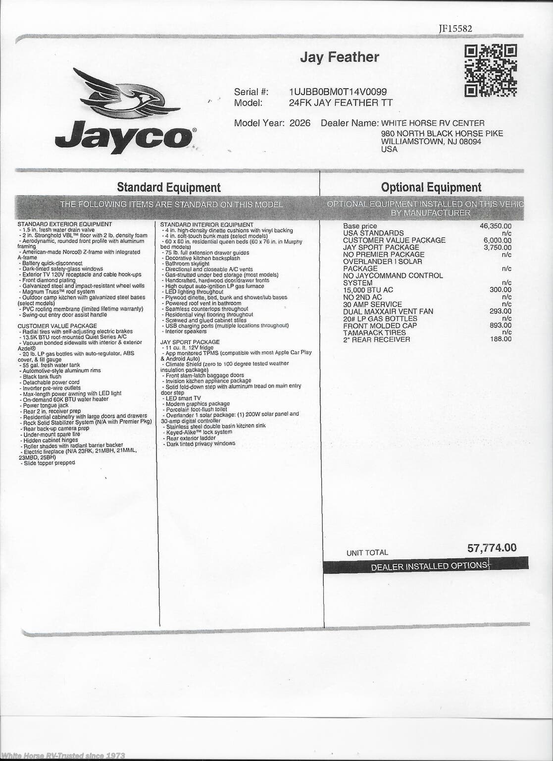This Stock #JF15582 also has the following factory options included: ...Dune Gray Interior Decor, 15,000 BTU AC, Dual MaxxAir Vent Fan, Front Molded Cap & 2' Rear Receiver all backed by Jayco’s 2+3-year warranty! MSRP $57,774.00.