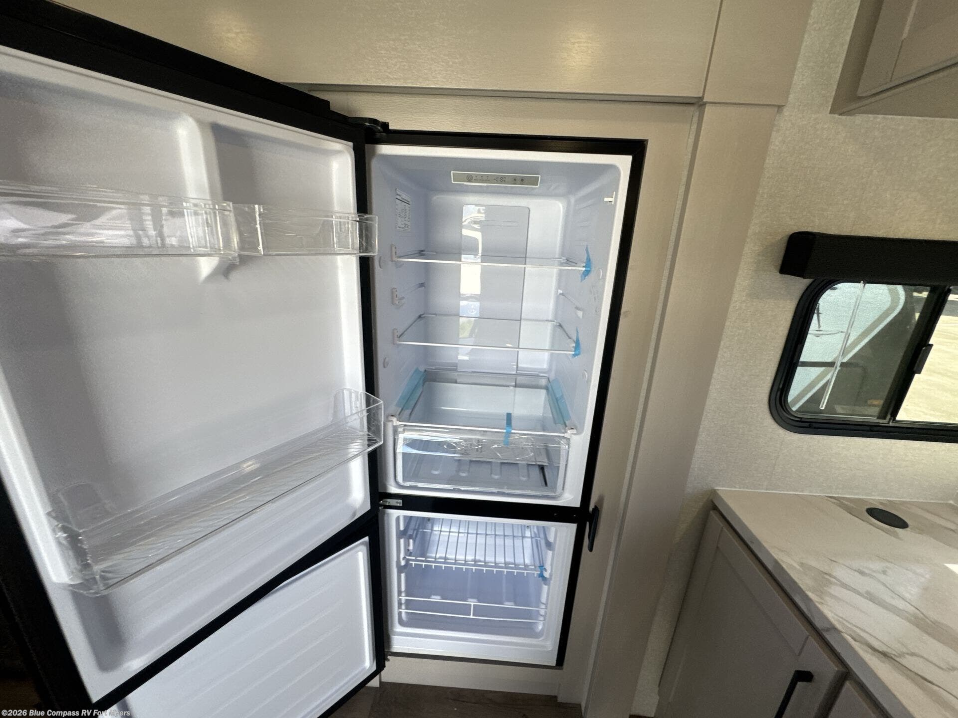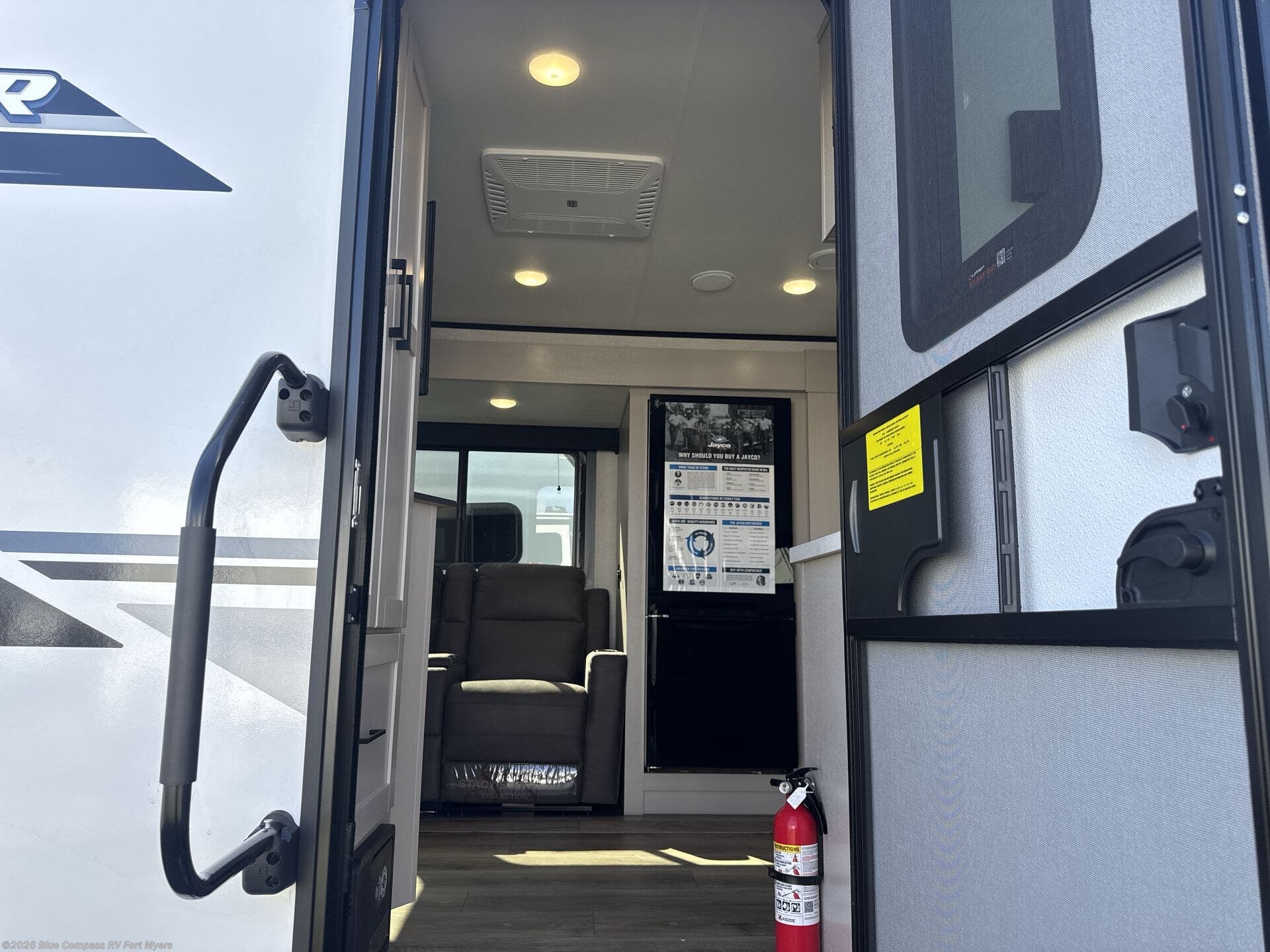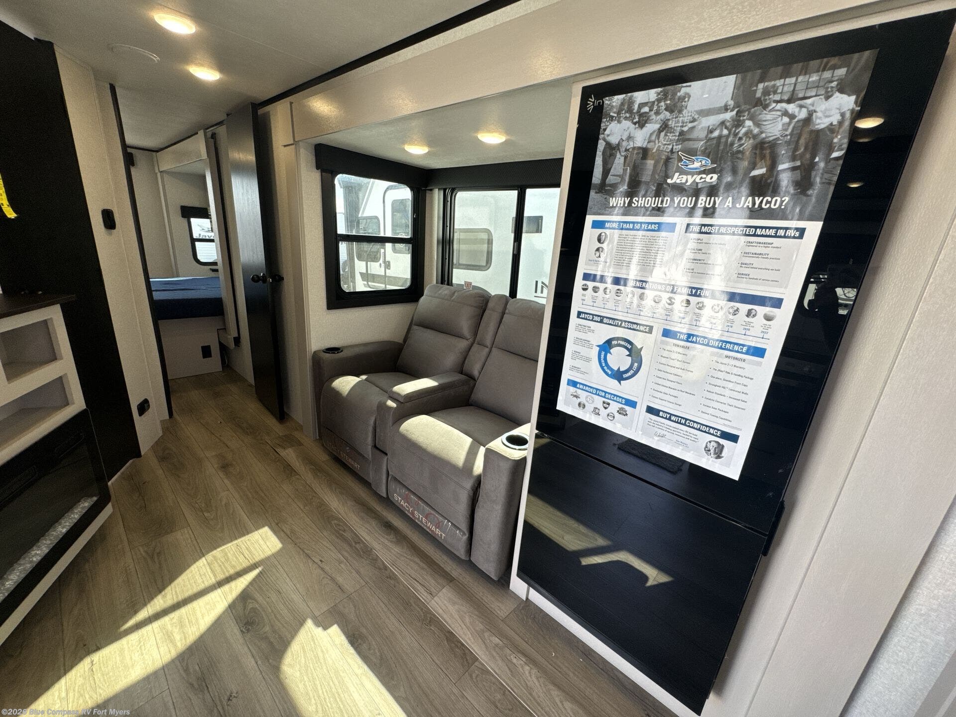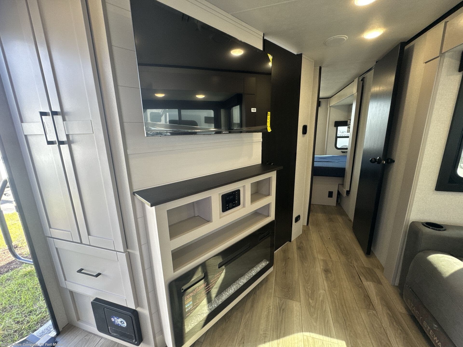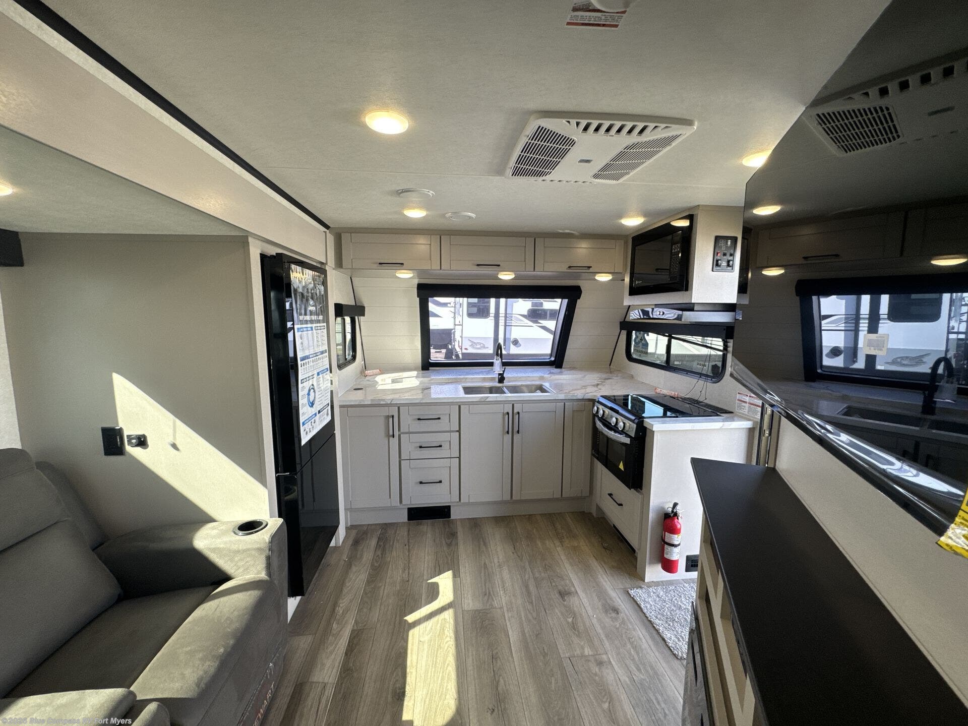 Step inside this spacious travel trailer through the front entry and you find the front kitchen that spans the width of the unit, providing plenty of counter space for meal prep. The kitchen is fully equipped with a stainless-steel sink, a decorative backsplash, a 3-burner cooktop, and an 11-cu. ft. 12V refrigerator, perfect for storing all your groceries. Overhead shelves offer convenient storage, and a pantry adds extra space for essentials. Next to the kitchen, you’ll find 60" theater seating, ideal for enjoying meals or watching your favorite shows on the LED Smart TV. As you move down the hall, you’ll come to a full bathroom featuring a radius shower and two entry doors for easy access. At the rear of the trailer, the comfortable bedroom features a 60" x 80" Queen bed, a sliding mirror door closet for added storage, and a second entry door to the exterior.