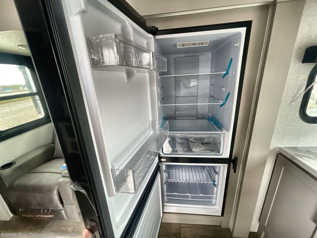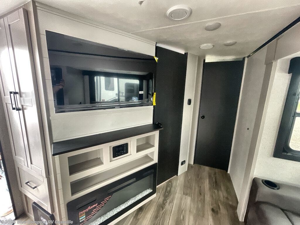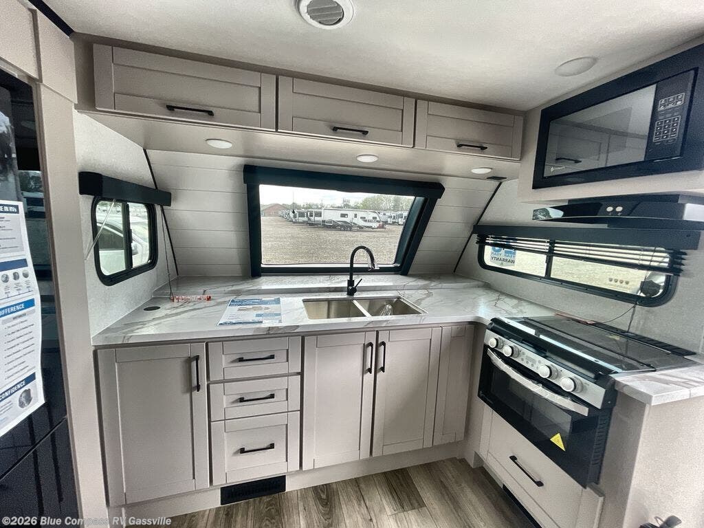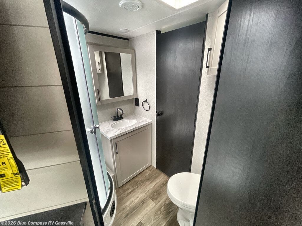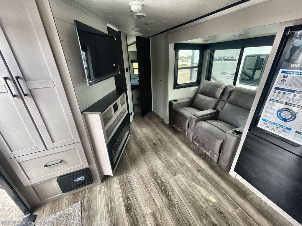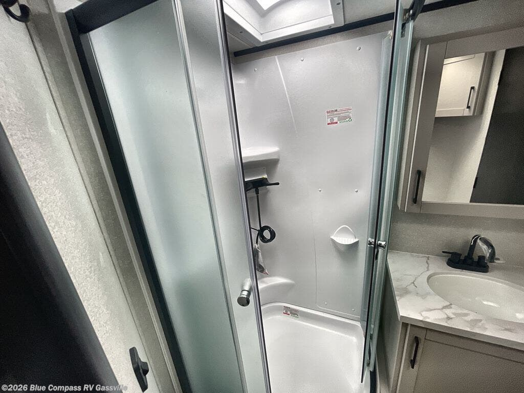 Step inside this spacious travel trailer through the front entry and you find the front kitchen that spans the width of the unit, providing plenty of counter space for meal prep. The kitchen is fully equipped with a stainless-steel sink, a decorative backsplash, a 3-burner cooktop, and an 11-cu. ft. 12V refrigerator, perfect for storing all your groceries. Overhead shelves offer convenient storage, and a pantry adds extra space for essentials. Next to the kitchen, you’ll find 60" theater seating, ideal for enjoying meals or watching your favorite shows on the LED Smart TV. As you move down the hall, you’ll come to a full bathroom featuring a radius shower and two entry doors for easy access. At the rear of the trailer, the comfortable bedroom features a 60" x 80" Queen bed, a sliding mirror door closet for added storage, and a second entry door to the exterior.