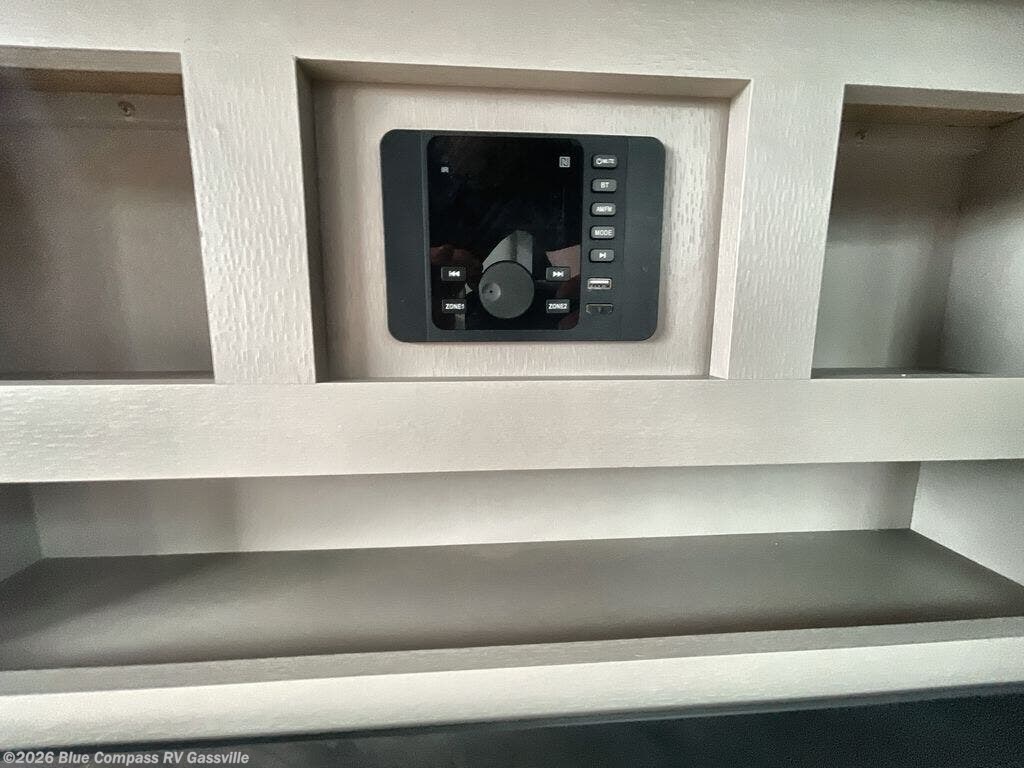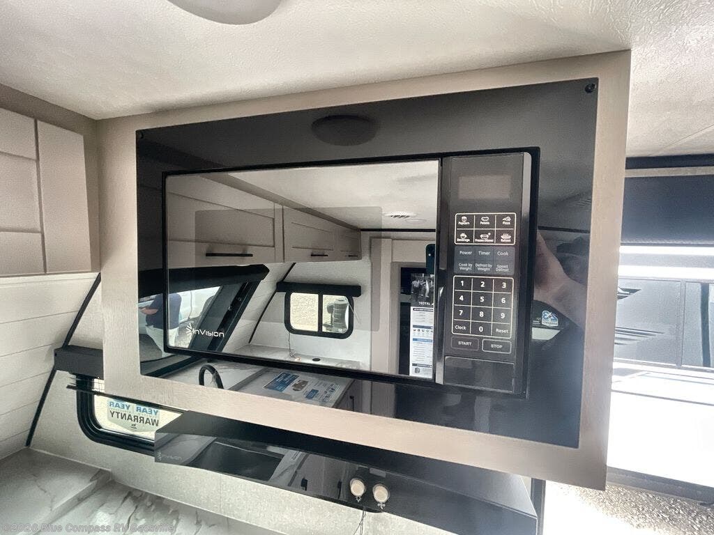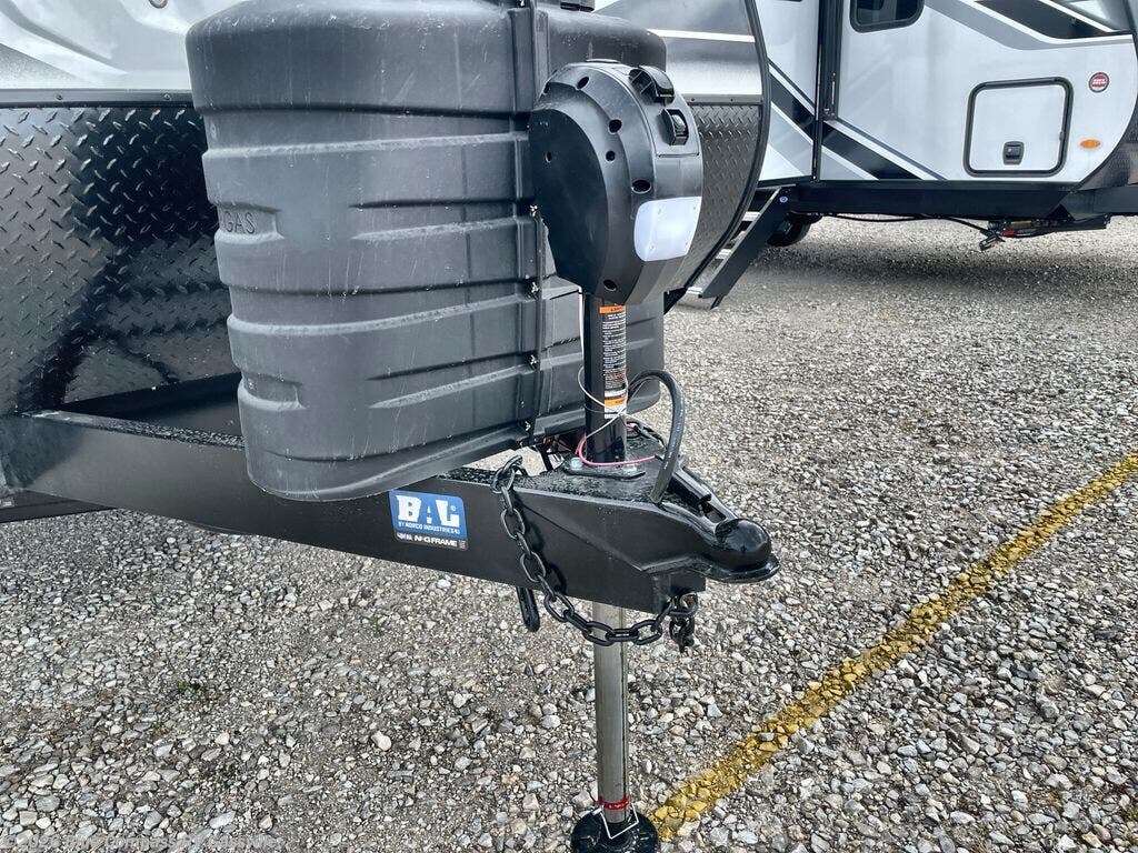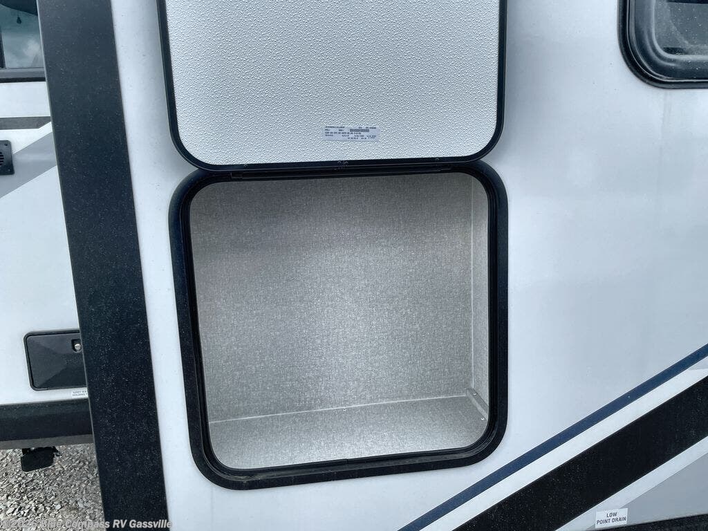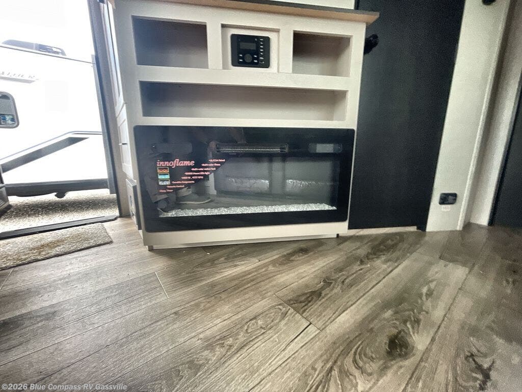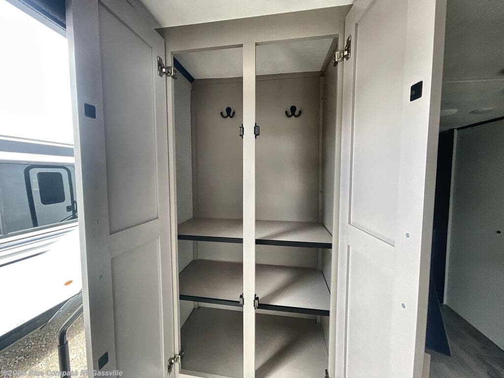 Step inside this spacious travel trailer through the front entry and you find the front kitchen that spans the width of the unit, providing plenty of counter space for meal prep. The kitchen is fully equipped with a stainless-steel sink, a decorative backsplash, a 3-burner cooktop, and an 11-cu. ft. 12V refrigerator, perfect for storing all your groceries. Overhead shelves offer convenient storage, and a pantry adds extra space for essentials. Next to the kitchen, you’ll find 60" theater seating, ideal for enjoying meals or watching your favorite shows on the LED Smart TV. As you move down the hall, you’ll come to a full bathroom featuring a radius shower and two entry doors for easy access. At the rear of the trailer, the comfortable bedroom features a 60" x 80" Queen bed, a sliding mirror door closet for added storage, and a second entry door to the exterior.