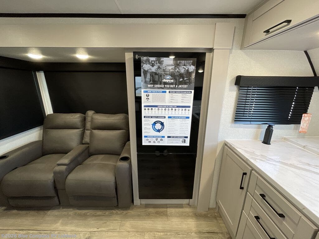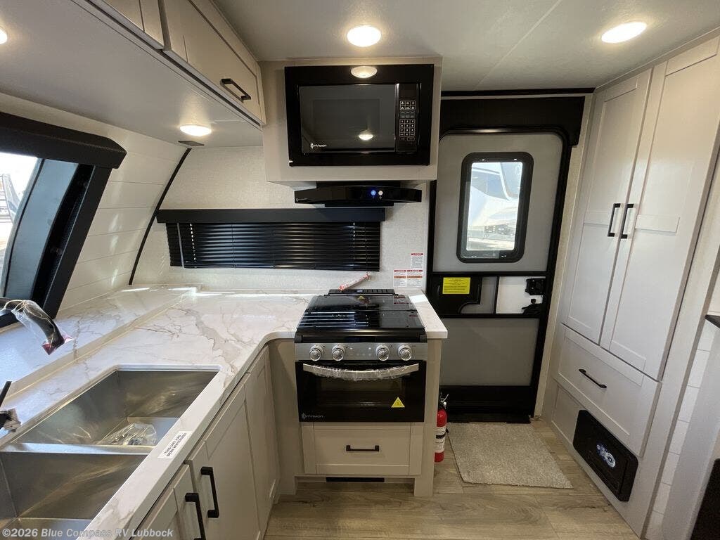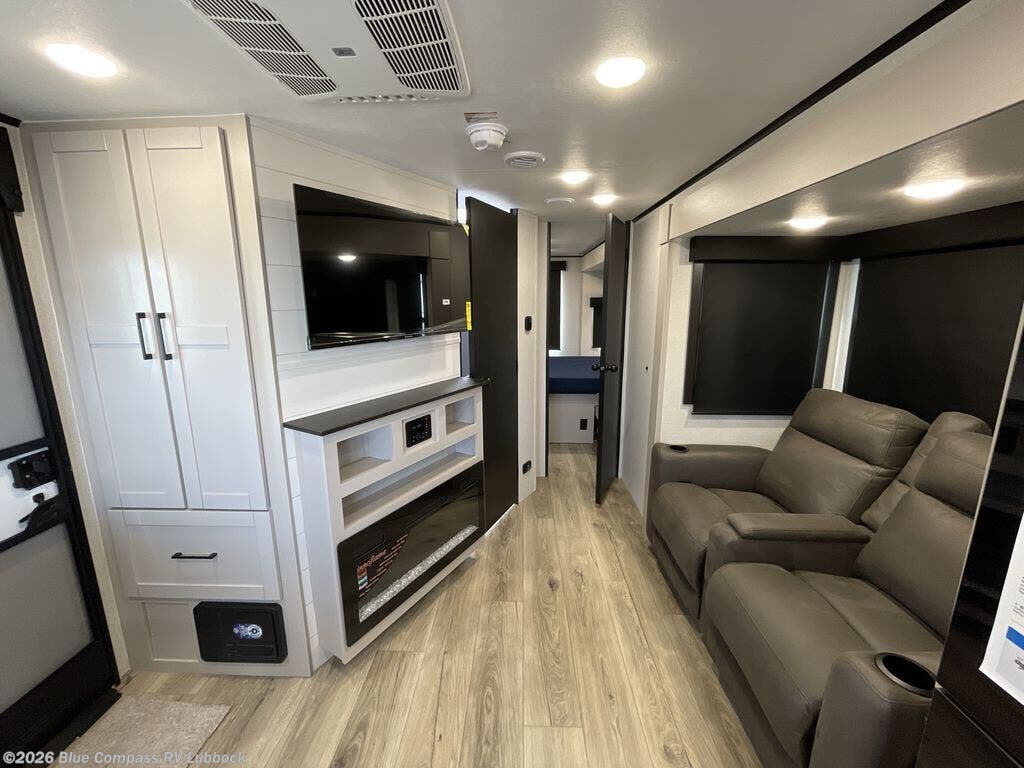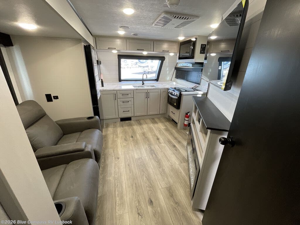 Step inside this spacious travel trailer through the front entry and you find the front kitchen that spans the width of the unit, providing plenty of counter space for meal prep. The kitchen is fully equipped with a stainless-steel sink, a decorative backsplash, a 3-burner cooktop, and an 11-cu. ft. 12V refrigerator, perfect for storing all your groceries. Overhead shelves offer convenient storage, and a pantry adds extra space for essentials. Next to the kitchen, you’ll find 60" theater seating, ideal for enjoying meals or watching your favorite shows on the LED Smart TV. As you move down the hall, you’ll come to a full bathroom featuring a radius shower and two entry doors for easy access. At the rear of the trailer, the comfortable bedroom features a 60" x 80" Queen bed, a sliding mirror door closet for added storage, and a second entry door to the exterior.