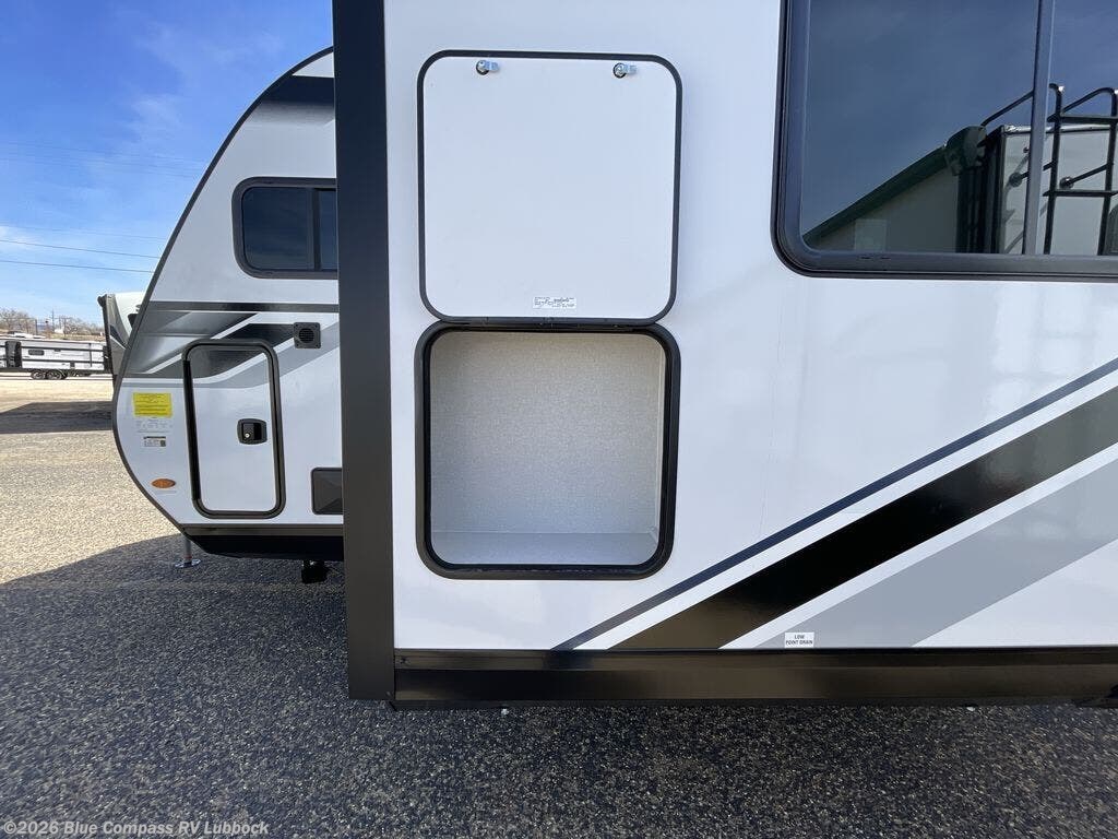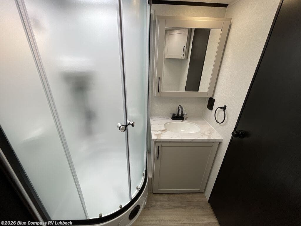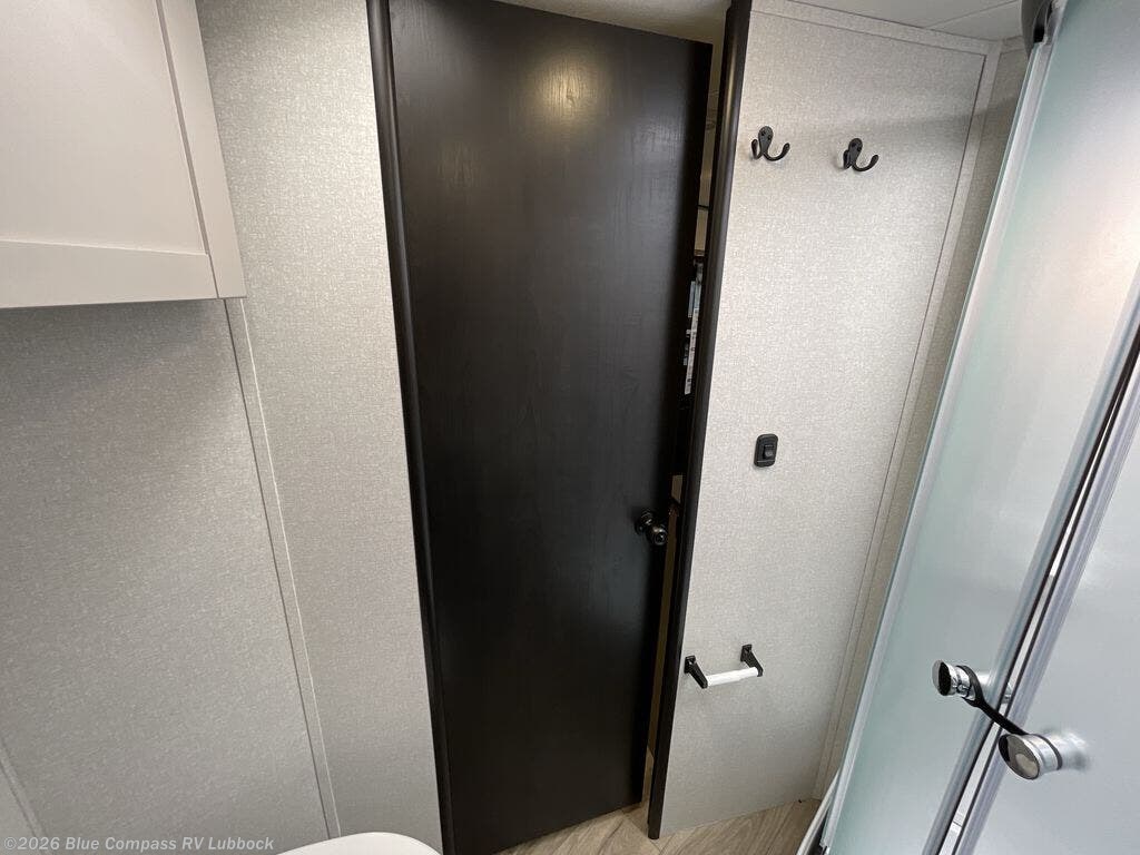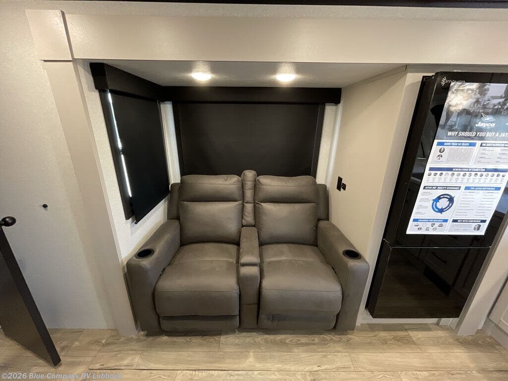 Step inside this spacious travel trailer through the front entry and you find the front kitchen that spans the width of the unit, providing plenty of counter space for meal prep. The kitchen is fully equipped with a stainless-steel sink, a decorative backsplash, a 3-burner cooktop, and an 11-cu. ft. 12V refrigerator, perfect for storing all your groceries. Overhead shelves offer convenient storage, and a pantry adds extra space for essentials. Next to the kitchen, you’ll find 60" theater seating, ideal for enjoying meals or watching your favorite shows on the LED Smart TV. As you move down the hall, you’ll come to a full bathroom featuring a radius shower and two entry doors for easy access. At the rear of the trailer, the comfortable bedroom features a 60" x 80" Queen bed, a sliding mirror door closet for added storage, and a second entry door to the exterior.