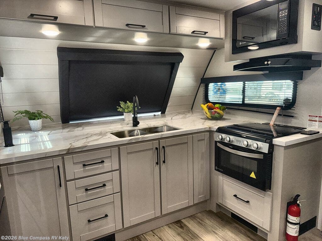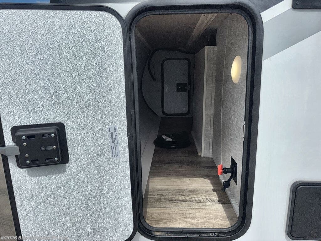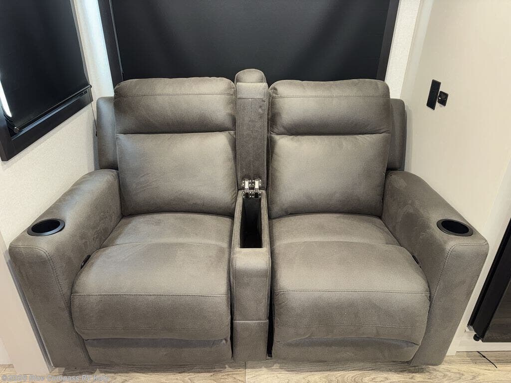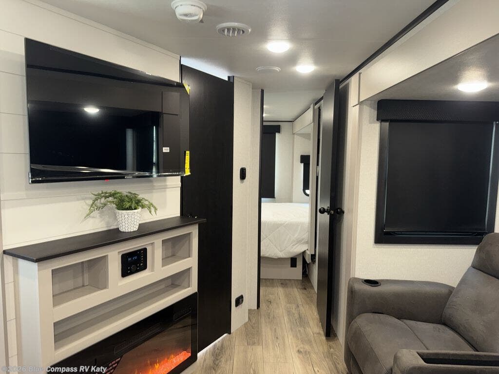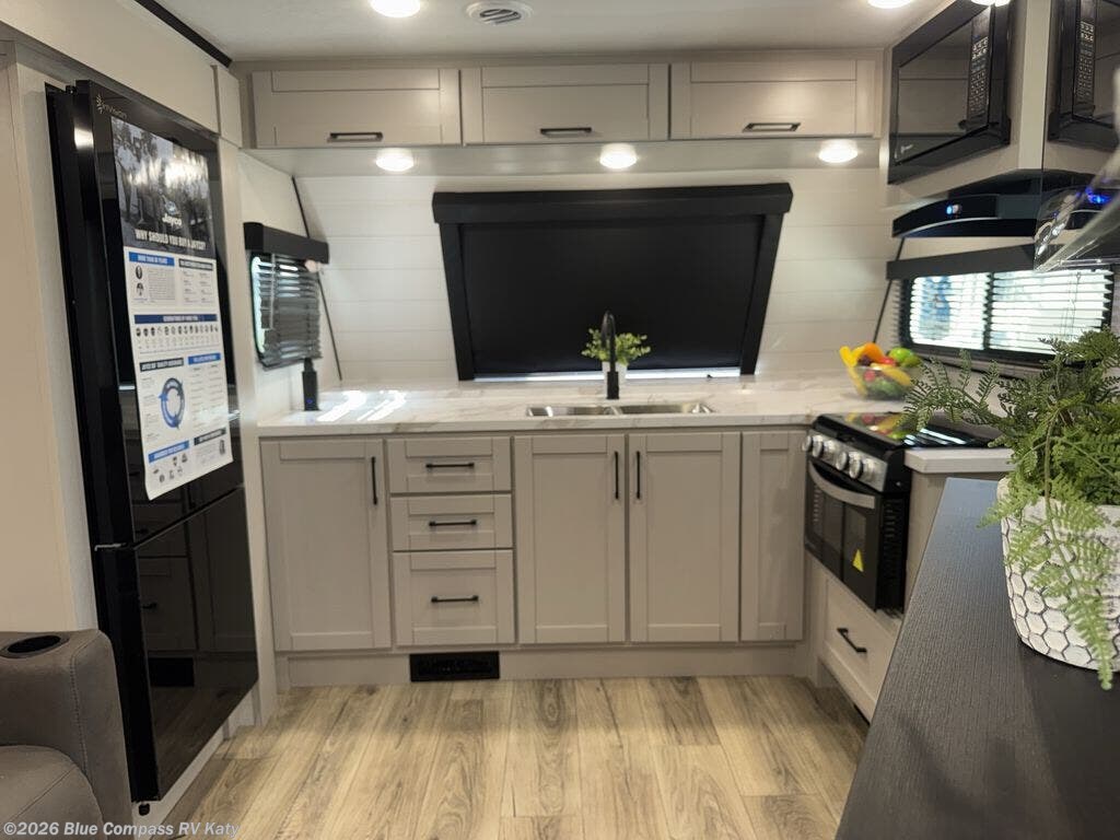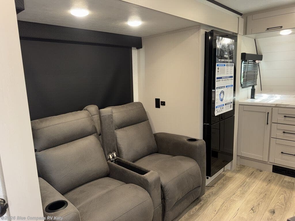 Step inside this spacious travel trailer through the front entry and you find the front kitchen that spans the width of the unit, providing plenty of counter space for meal prep. The kitchen is fully equipped with a stainless-steel sink, a decorative backsplash, a 3-burner cooktop, and an 11-cu. ft. 12V refrigerator, perfect for storing all your groceries. Overhead shelves offer convenient storage, and a pantry adds extra space for essentials. Next to the kitchen, you’ll find 60" theater seating, ideal for enjoying meals or watching your favorite shows on the LED Smart TV. As you move down the hall, you’ll come to a full bathroom featuring a radius shower and two entry doors for easy access. At the rear of the trailer, the comfortable bedroom features a 60" x 80" Queen bed, a sliding mirror door closet for added storage, and a second entry door to the exterior.