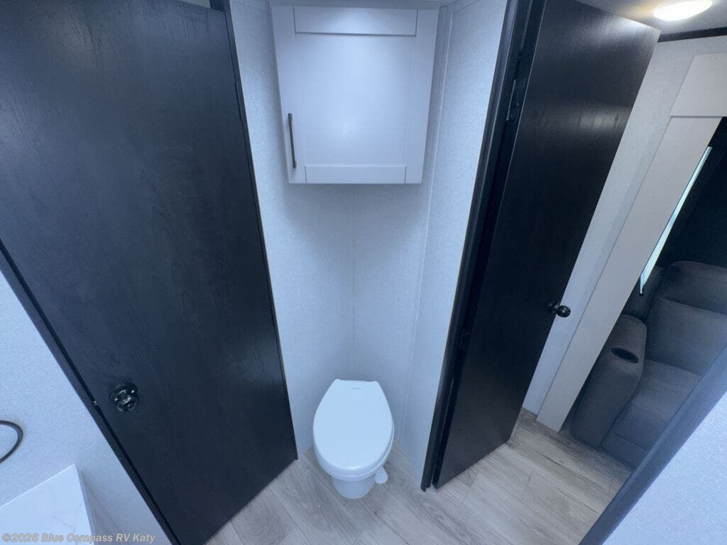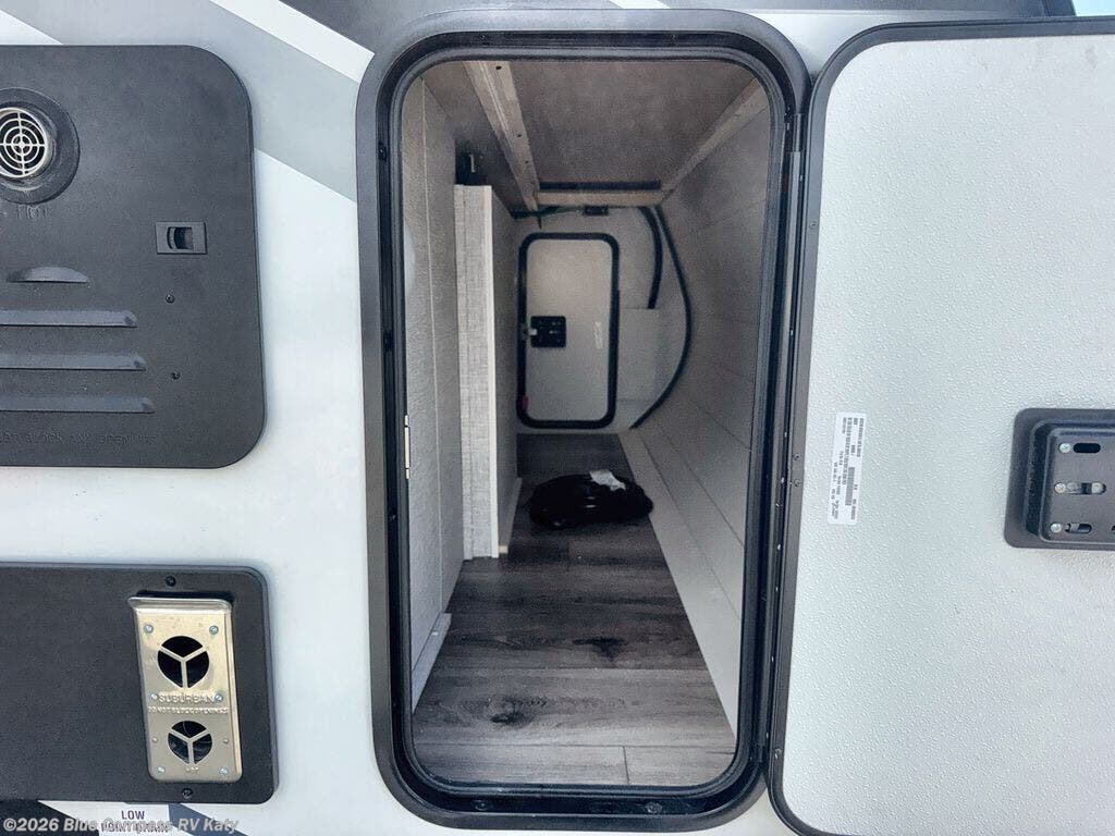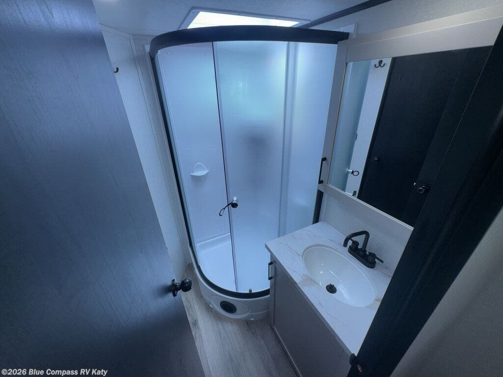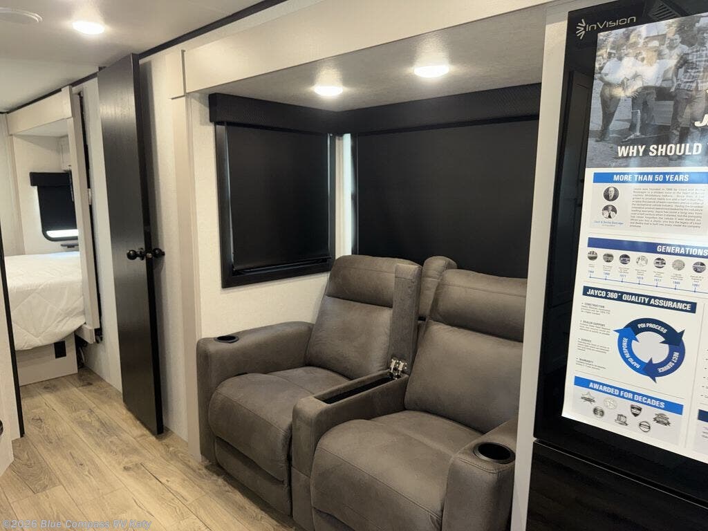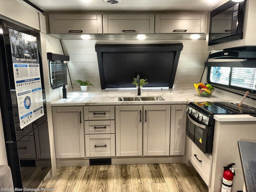 Step inside this spacious travel trailer through the front entry and you find the front kitchen that spans the width of the unit, providing plenty of counter space for meal prep. The kitchen is fully equipped with a stainless-steel sink, a decorative backsplash, a 3-burner cooktop, and an 11-cu. ft. 12V refrigerator, perfect for storing all your groceries. Overhead shelves offer convenient storage, and a pantry adds extra space for essentials. Next to the kitchen, you’ll find 60" theater seating, ideal for enjoying meals or watching your favorite shows on the LED Smart TV. As you move down the hall, you’ll come to a full bathroom featuring a radius shower and two entry doors for easy access. At the rear of the trailer, the comfortable bedroom features a 60" x 80" Queen bed, a sliding mirror door closet for added storage, and a second entry door to the exterior.